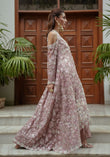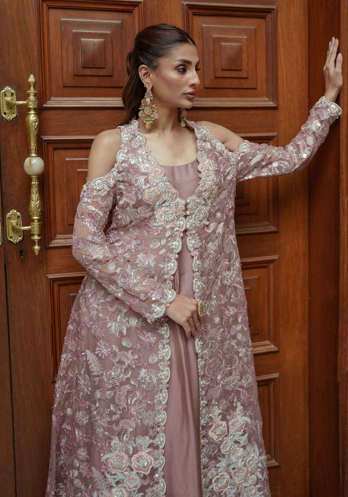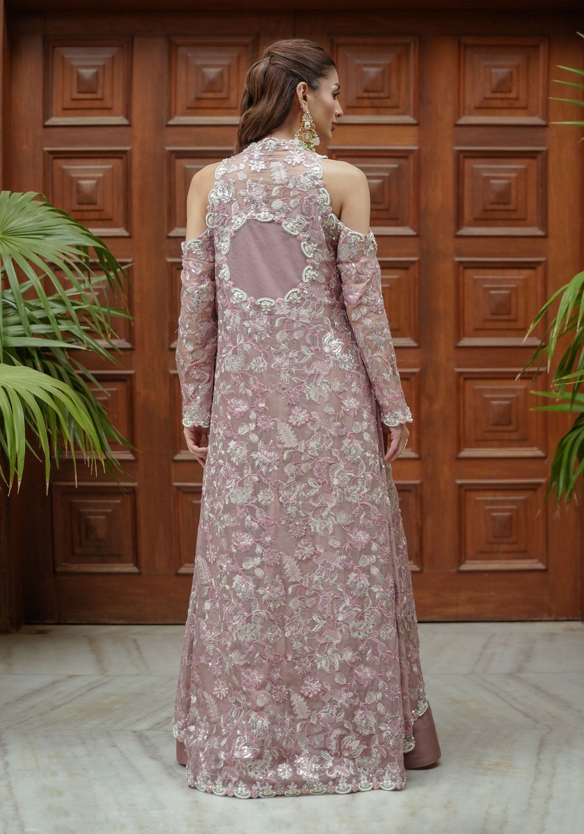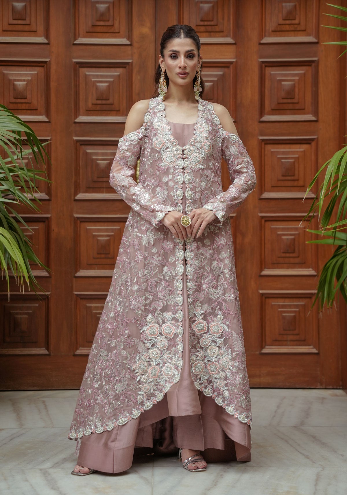 This outfit is an elegant traditional ensemble with a modern twist. Long front-open jacket style over a matching inner dress and wide-leg pants. The jacket is made of sheer chiffon fabric with heavy floral embroidery, and the inner and pants are crafted from a solid silk fabric in a matching dusty pink tone. Jacket features cold-shoulder cutouts, long sleeves, and an asymmetrical hemline that curves elegantly at the front. Dense floral motifs with silver sequins, zari work, and thread embroidery, especially concentrated at the borders and hem. Overall look is regal, sophisticated, and perfect for formal events like weddings or receptions, blending traditional embroidery with contemporary styling.