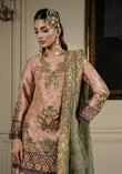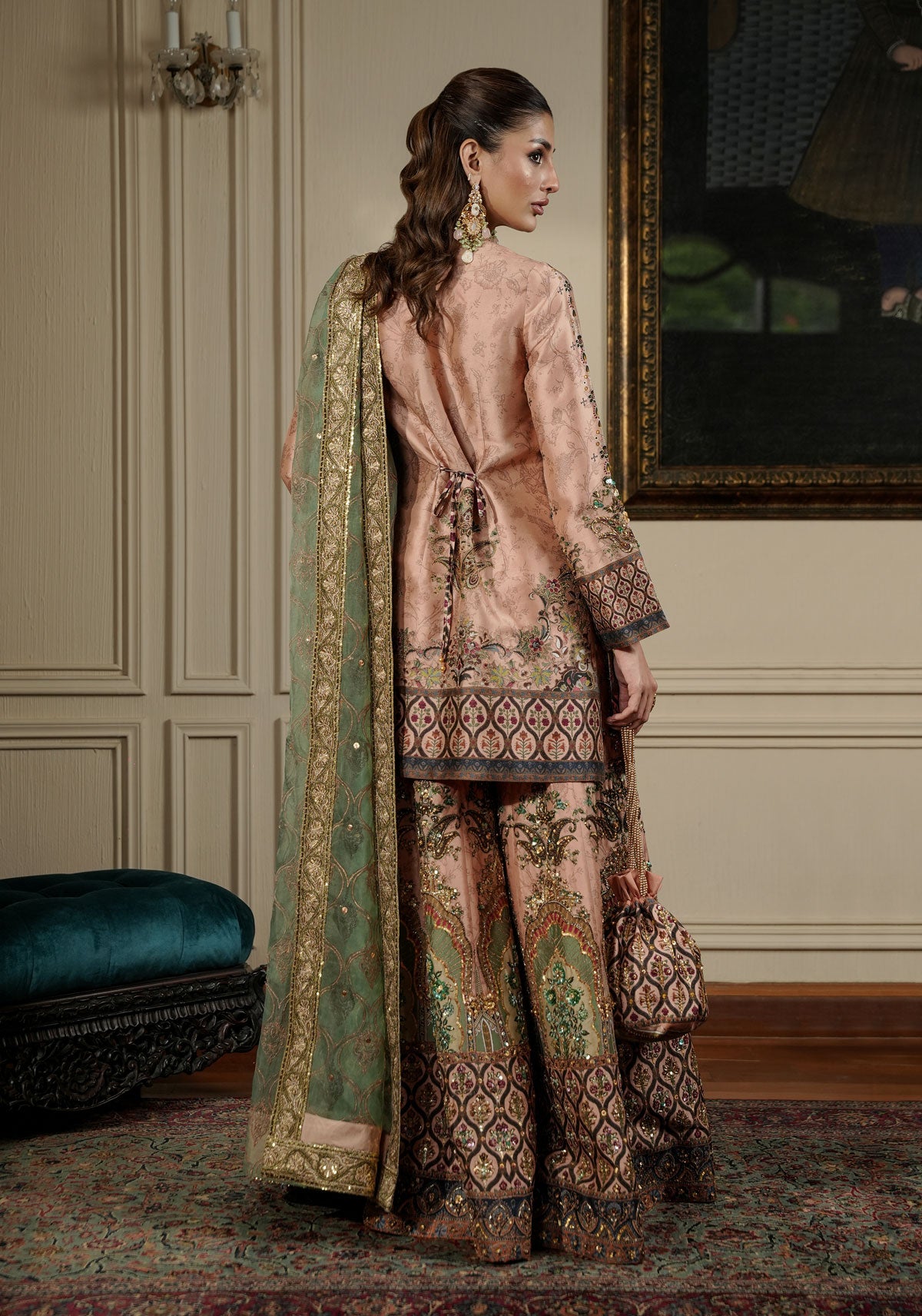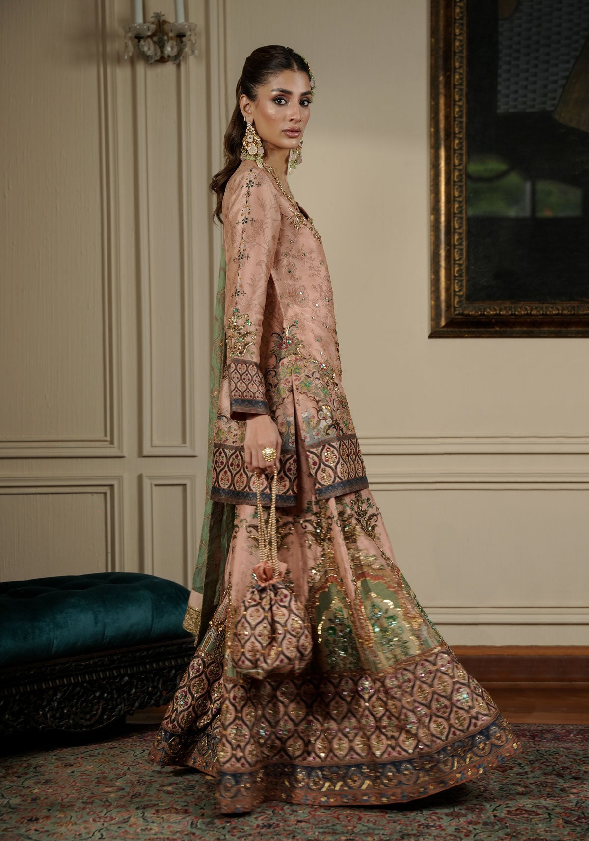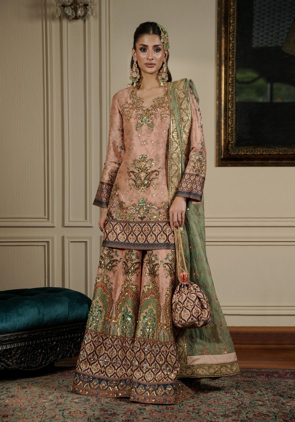 This outfit is a stunning traditional bridal or formal ensemble with rich embellishments and regal tones. Classic short shirt paired with a heavily embellished dacca pants and a coordinating dupatta. Luxurious raw silk for the shirt and dacca pants, with a sheer dupatta featuring embroidered borders. The outfit is of soft peachy pink with deep navy blue borders, rich green motifs, and gold zari detailing. It has intricate embroidery on the neckline, sleeves, and hem with shimmering sequins, zardozi work, and colored threadwork. It is paired with flared dacca pants style with ornate patterns in green and gold, highlighted with sequins, beads, and thread embroidery. Wide contrasting hem border with elaborate motifs and jewel-toned detailing. Dupatta is light green with a golden embroidered border and delicate motifs scattered throughout. A regal, traditional outfit with Mughal-inspired patterns and a rich color combination, ideal for weddings or high-end festive events.