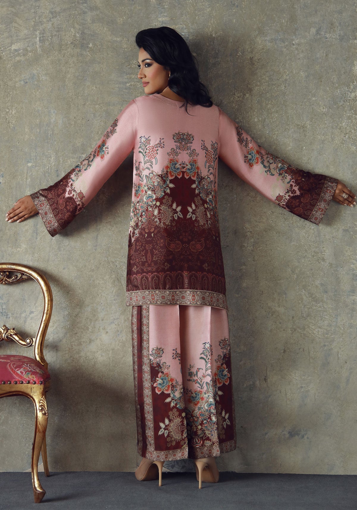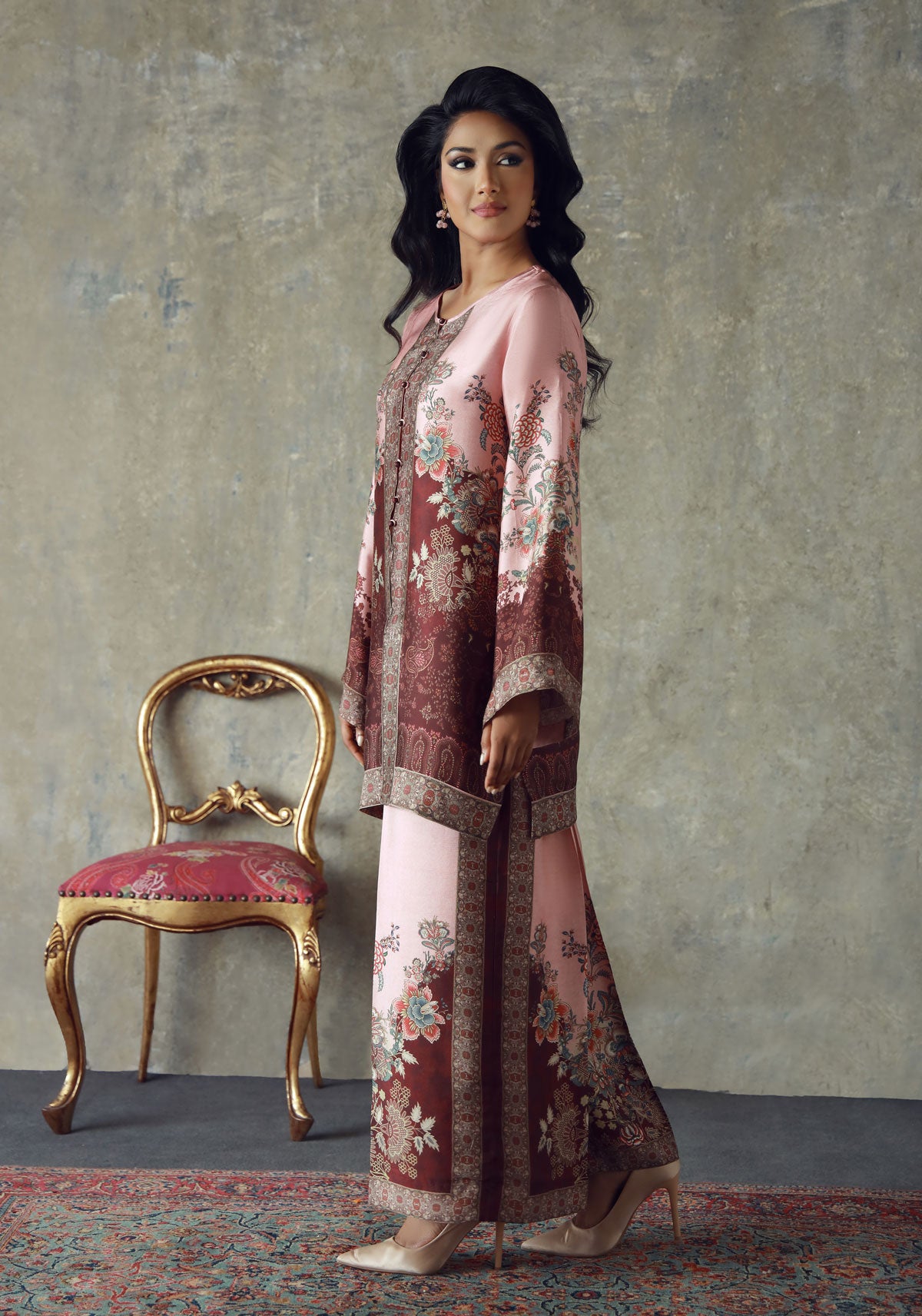 This Shamaeel creation in elegant dusty pink and rich maroon is a timeless front-open ensemble that beautifully fuses sophistication with contemporary charm. Adorned with delicate floral chintz and intricate paisley motifs along the hem, it showcases a finely detailed heritage-inspired border that exudes grace. The wide, flowing sleeves feature subtly printed edges, adding an extra touch of refinement. Paired with a modern coord set, this outfit strikes the perfect balance between tradition and trend. An ideal choice for formal gatherings, festive celebrations, or graceful evening soirées.