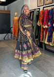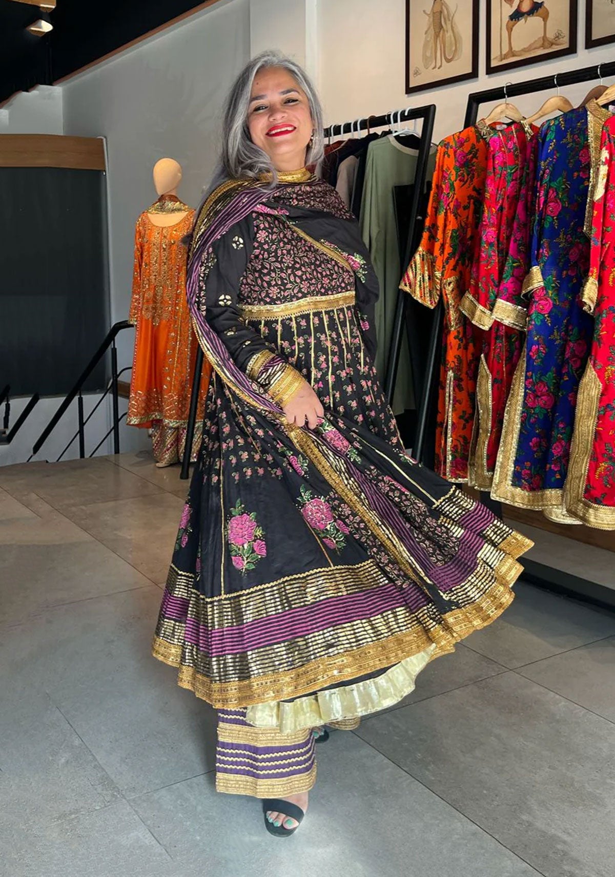 Black malmal angarkha and dupatta with block and foil print detailing all over with gota finishing.