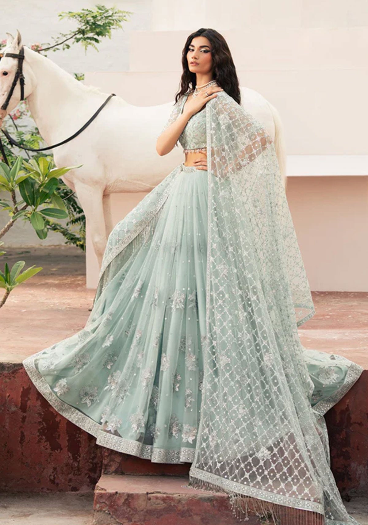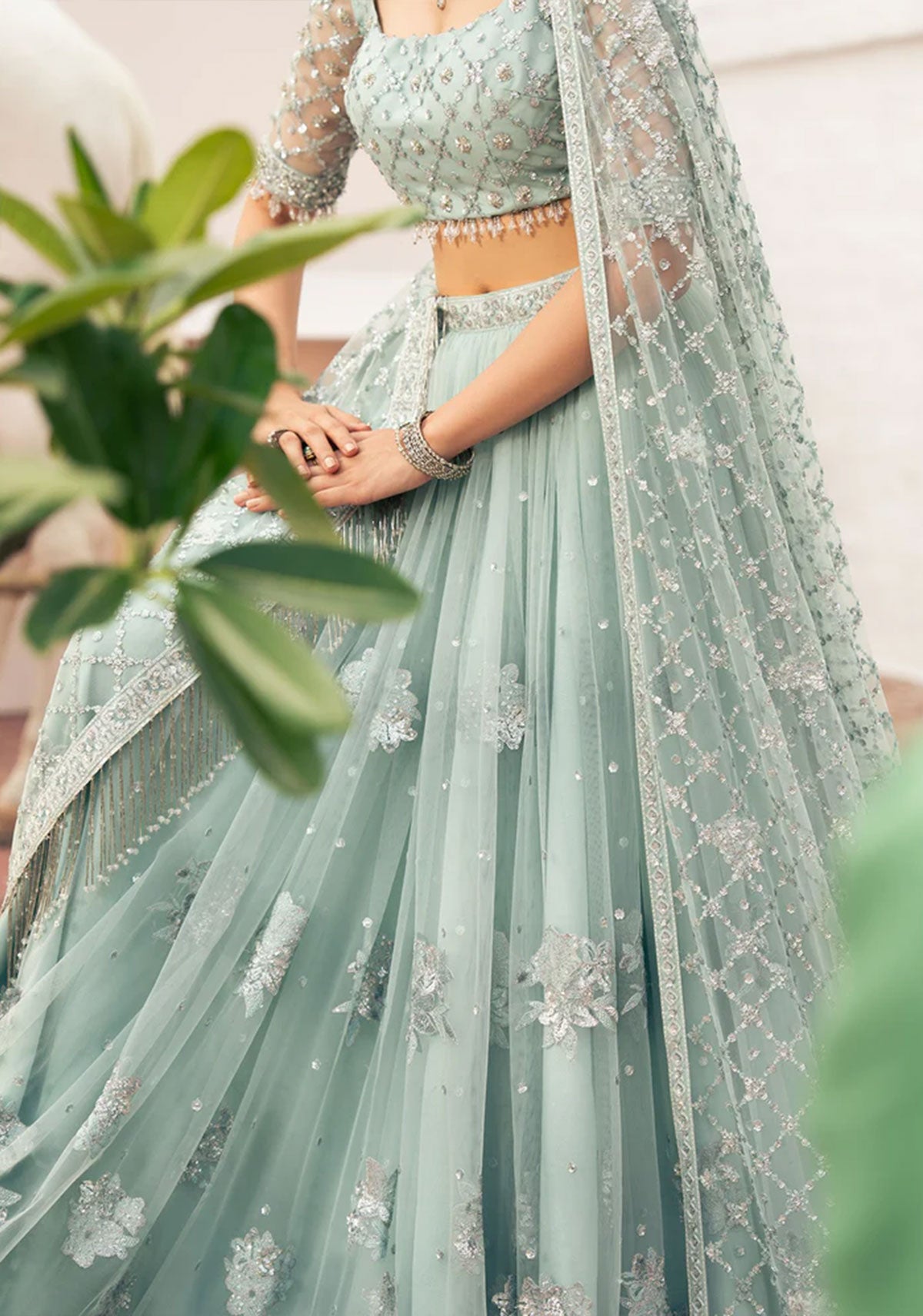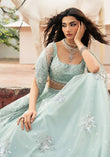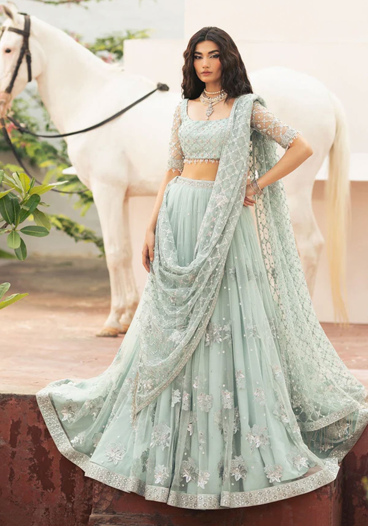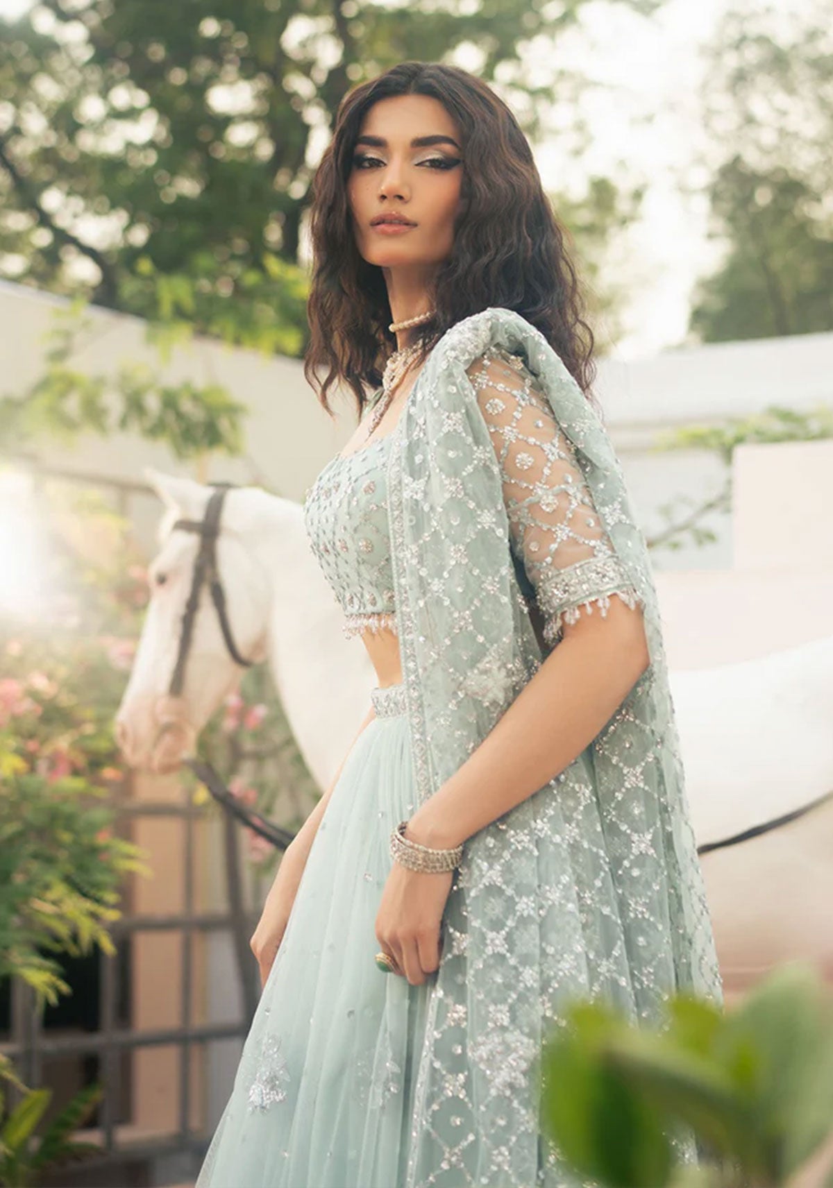 Eira is the embodiment of modern elegance with timeless artistry. Crafted on sheer net fabric, this ice blue lehenga gown features a fully hand-embellished blouse and a pleated skirt that moves with effortless grace.