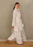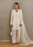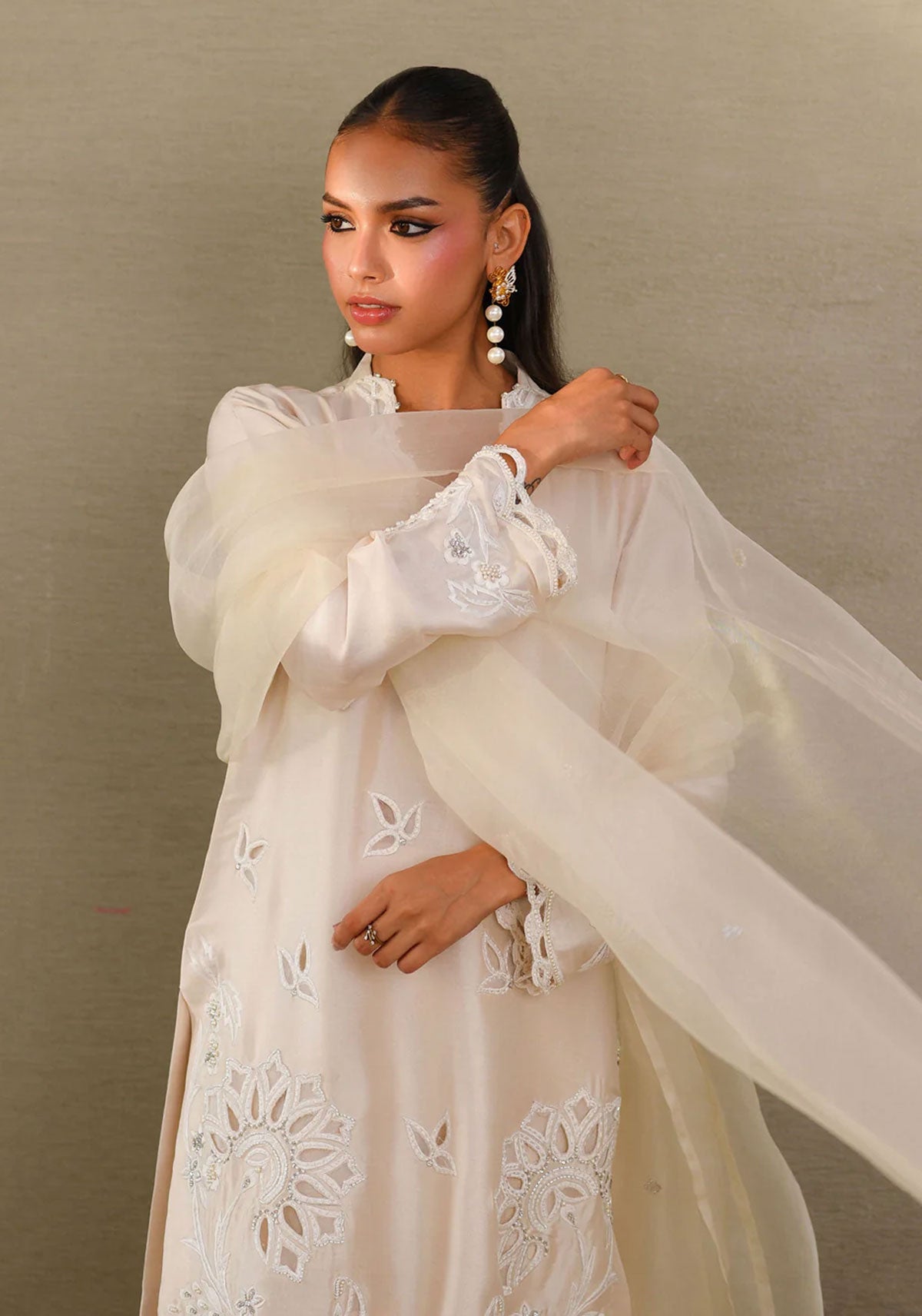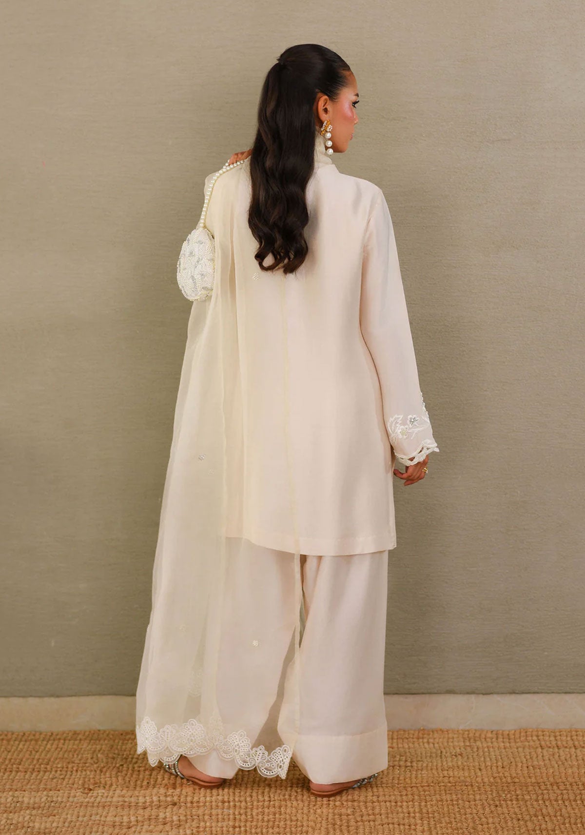 Paired with a matching silk farshi shalwar and a sheer organza dupatta, gently sprayed with pearls and edged with lace-trimmed borders, this look embodies understated luxury-crafted to make your Eid celebration truly unforgettable.