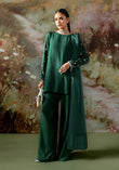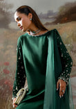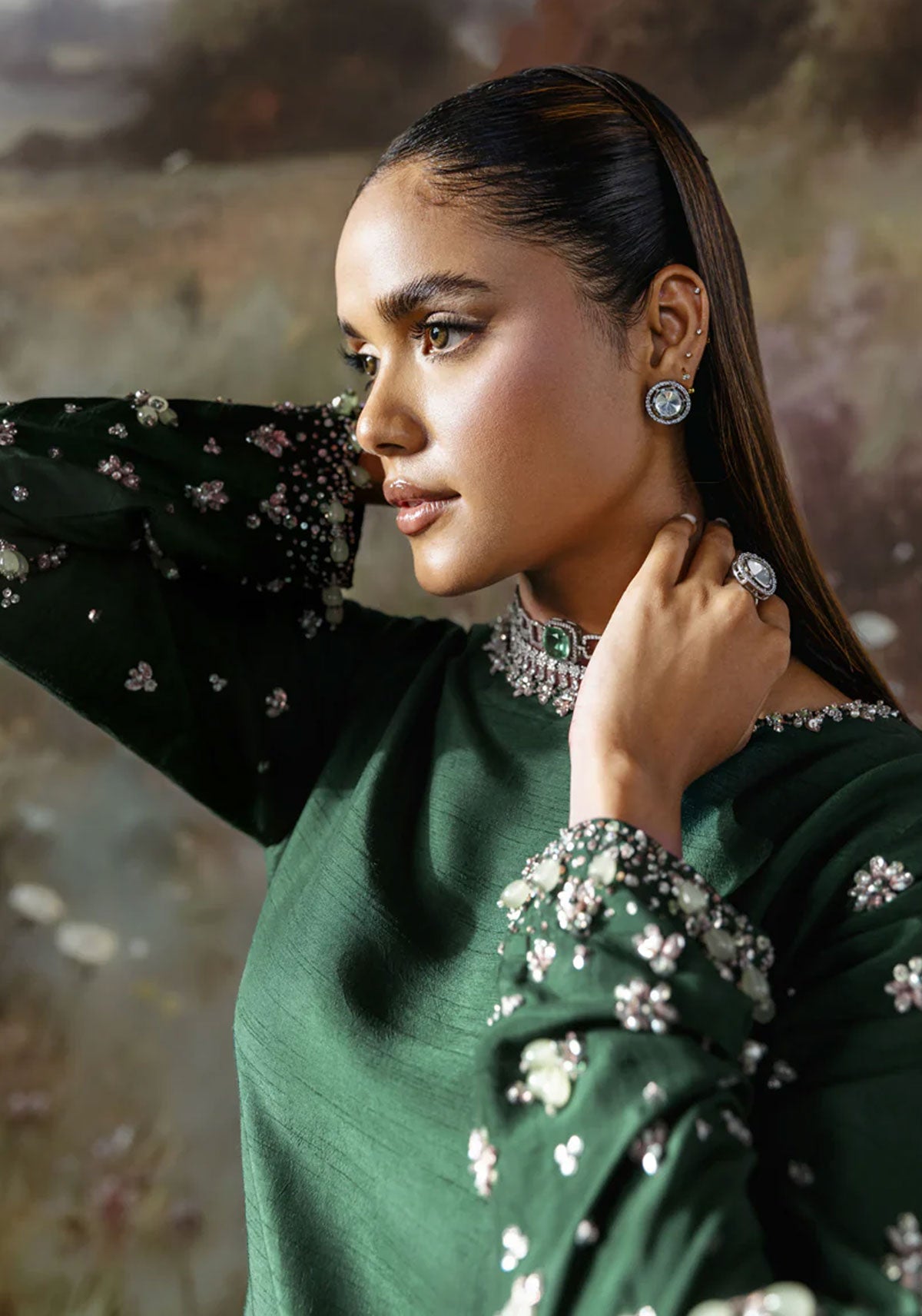 This design features a beautiful shirt with embellishment along the neckline and sleeves. The intricate sequins and crystal handwork add an elegant charm to the ensemble. It is paired with flared pants and a sheer organza dupatta that adds a graceful flow. Ammara Khan’s artistry shines through this creation, making it a flawless choice for festive occasions, evening gatherings, and special celebrations.