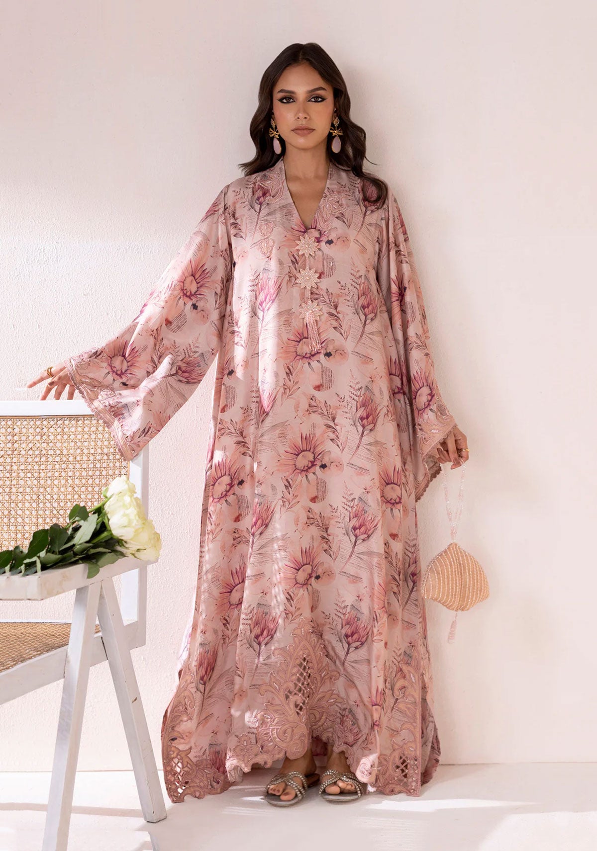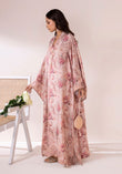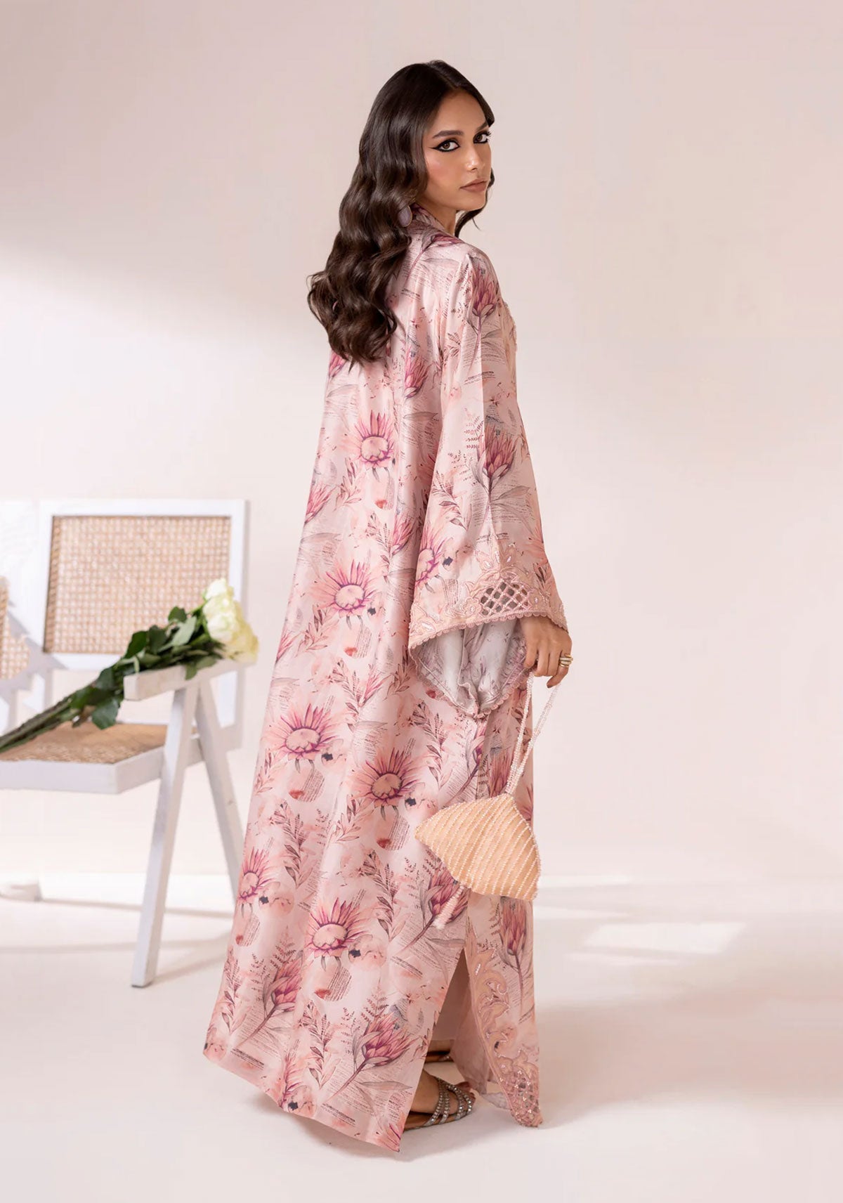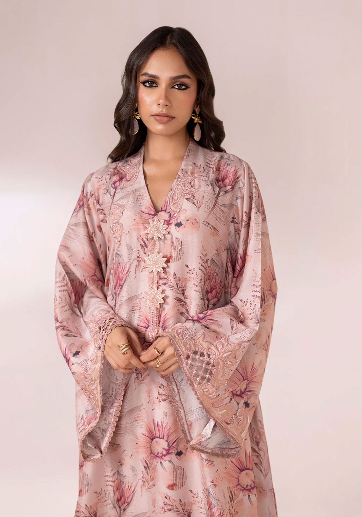 In a soft shade of mulberry pink, this floral-printed ensemble is crafted from luxurious 60-gram pure raw silk, offering a airy, graceful drape. The shirt is adorned with delicate cutwork motifs, shimmering sequins, radiant stones, cut dana, and crystals' each element adding a refined touch of sparkle.