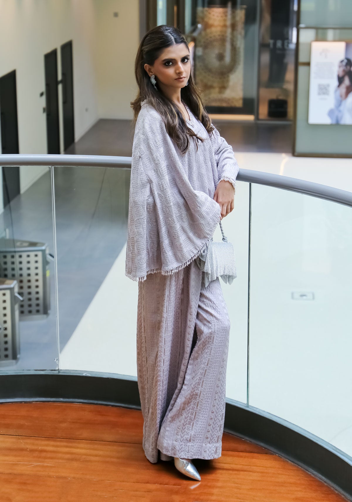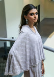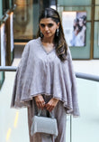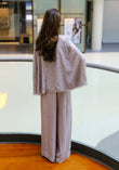 A two-piece ensemble featuring a light-colored, lilac, cape-style top and matching wide-leg pants. The top has a V-neckline and a textured pattern, with embellishments along the hem. The pants are loose-fitting and complement the relaxed style of the top. A casual and flowing overall look.