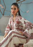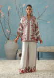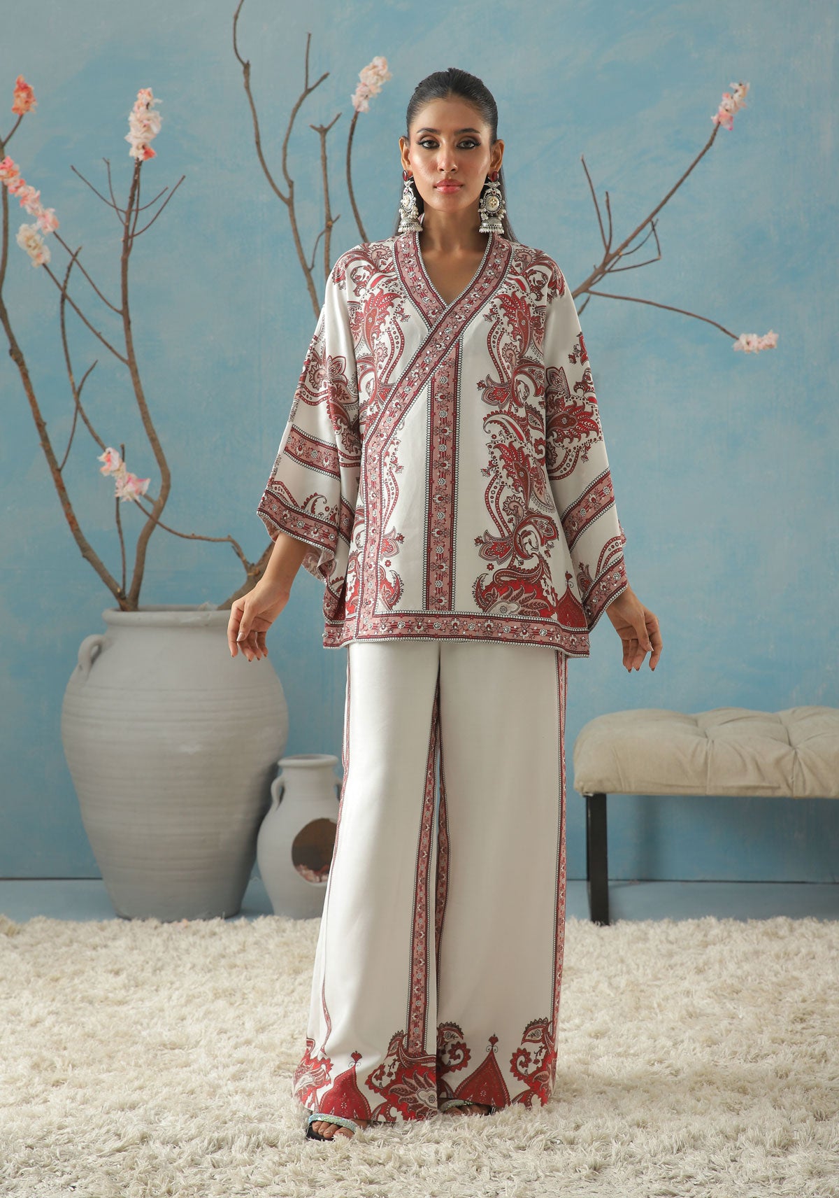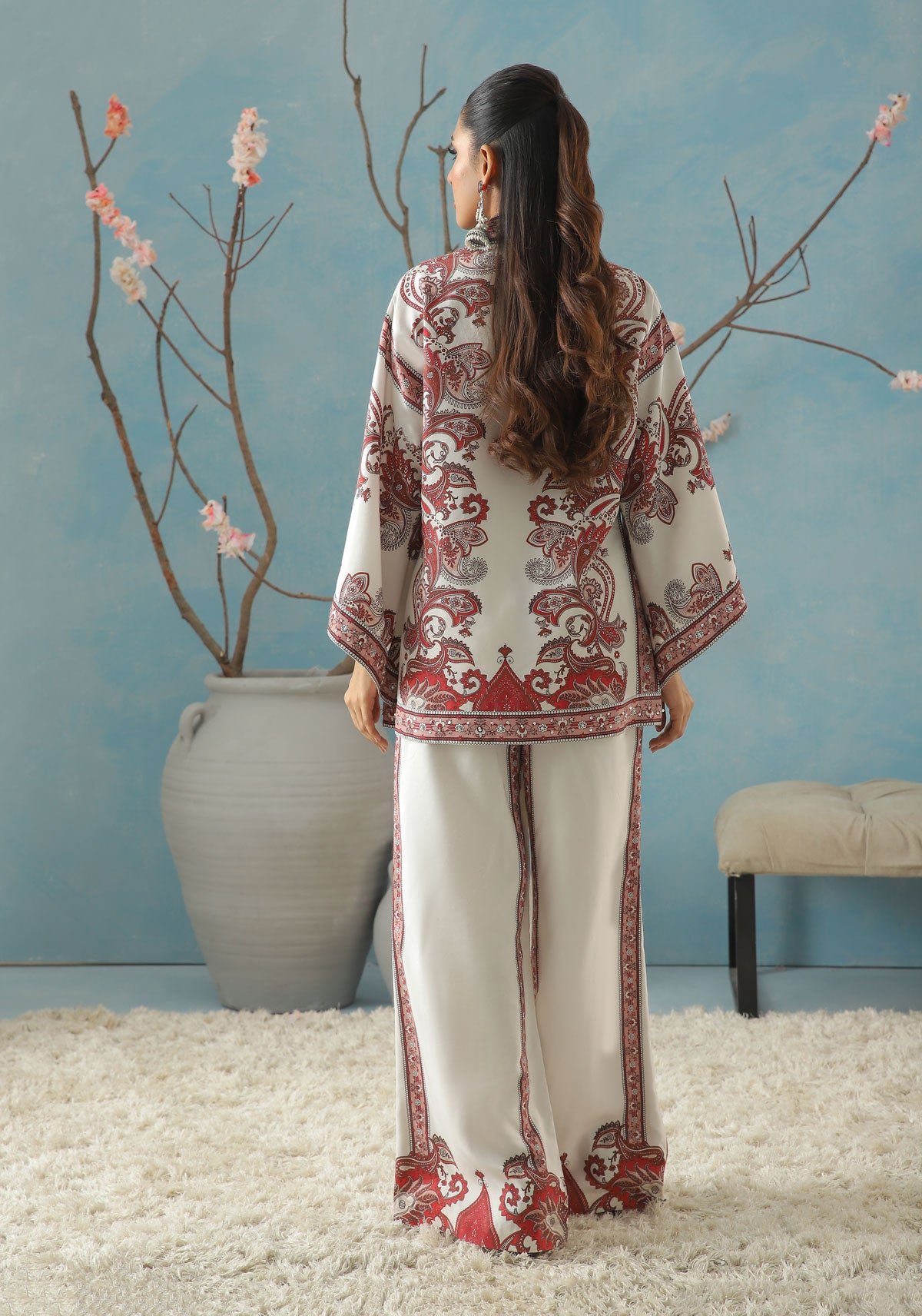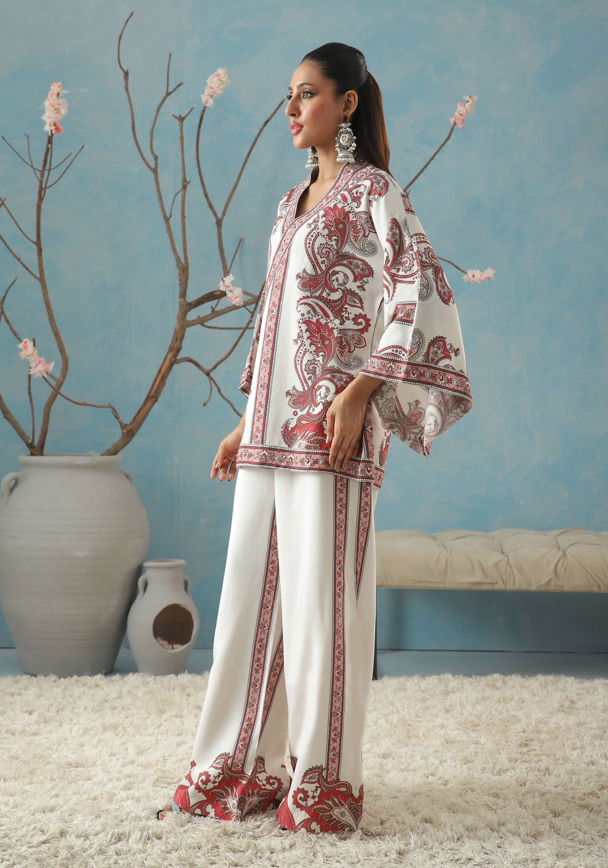 Red-on-white short jacket separates featuring vibrant chintz prints and intricate red detailing, finished with beautifully detailed borders for a striking look.