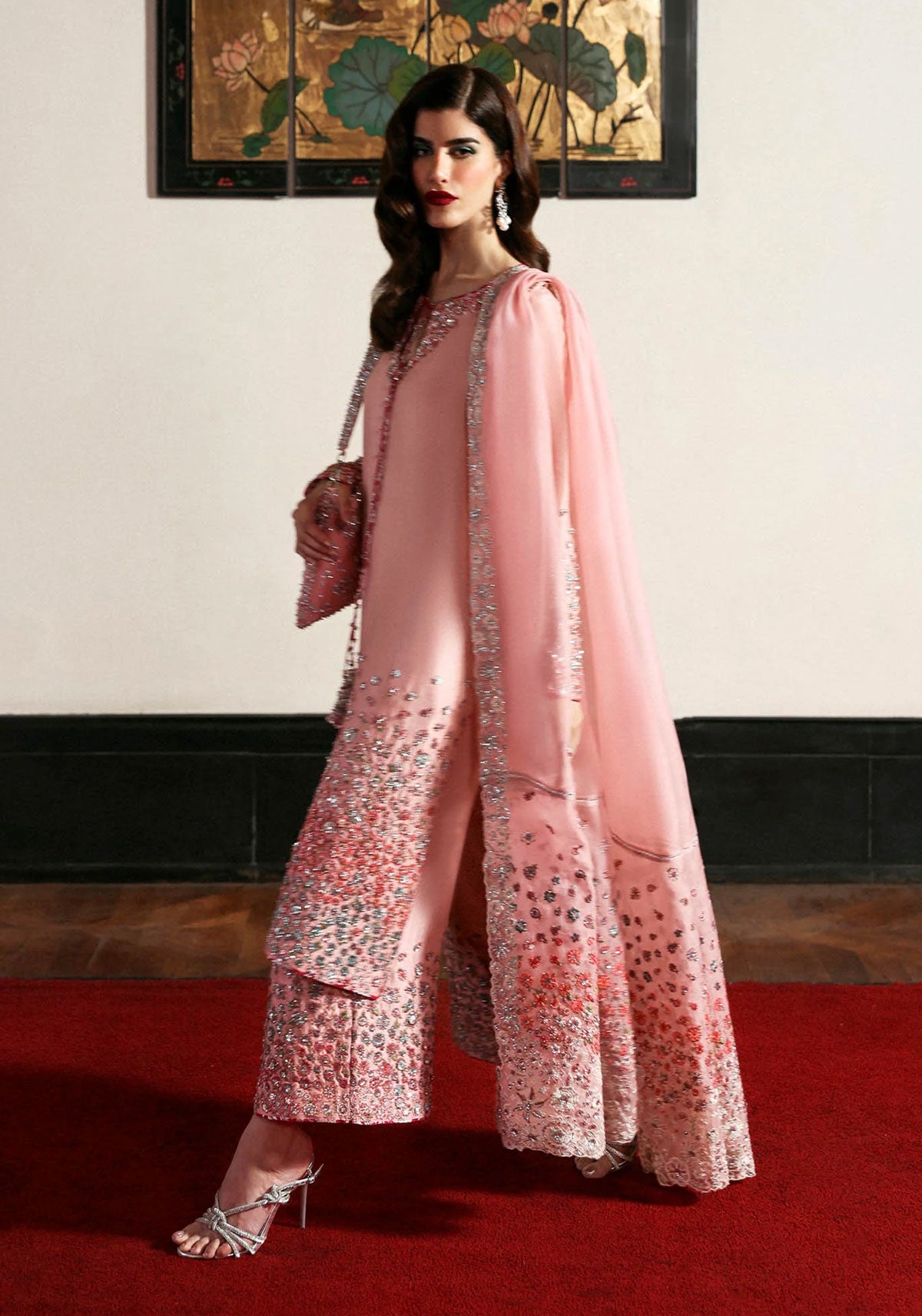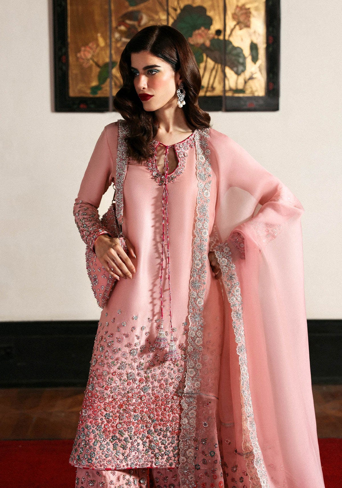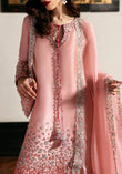 Blush pink raw silk shirt featuring intricate floral embroidery in soft gradient tones, delicately accented with silver sequins and hand embellishments. Fitted sleeves mirror the shirt’s floral detailing for a seamless finish. Paired with matching raw silk culottes adorned with complementing embellishments, and a pure organza dupatta embroidered along all four sides in fine floral motifs.