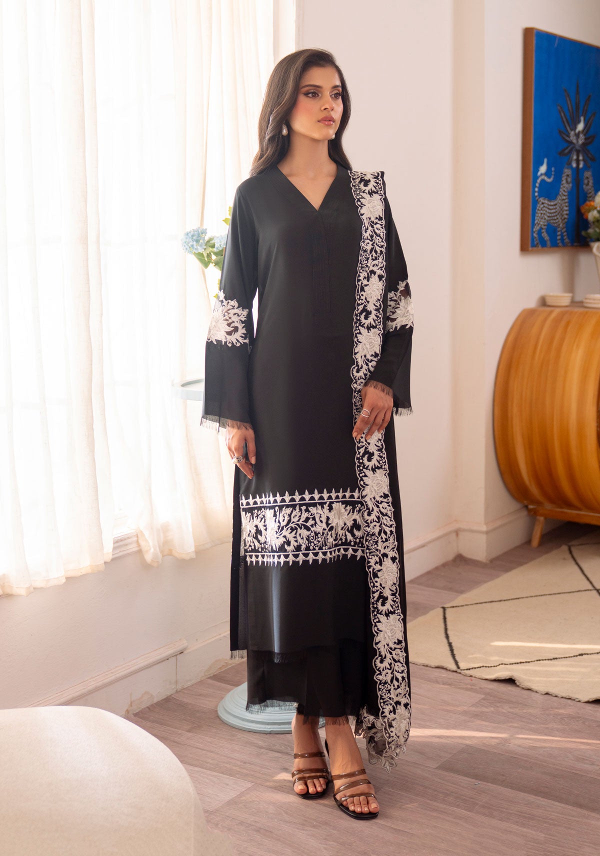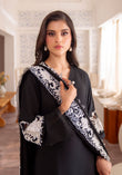 'Elevate your wardrobe with our monochrome embroidered ensemble. Crafted in georgette, the black canvas is juxtaposed against off-white embroidered motifs with a scalloped edge dupatta further accentuating the profile. A classic must have for every wardrobe!