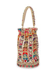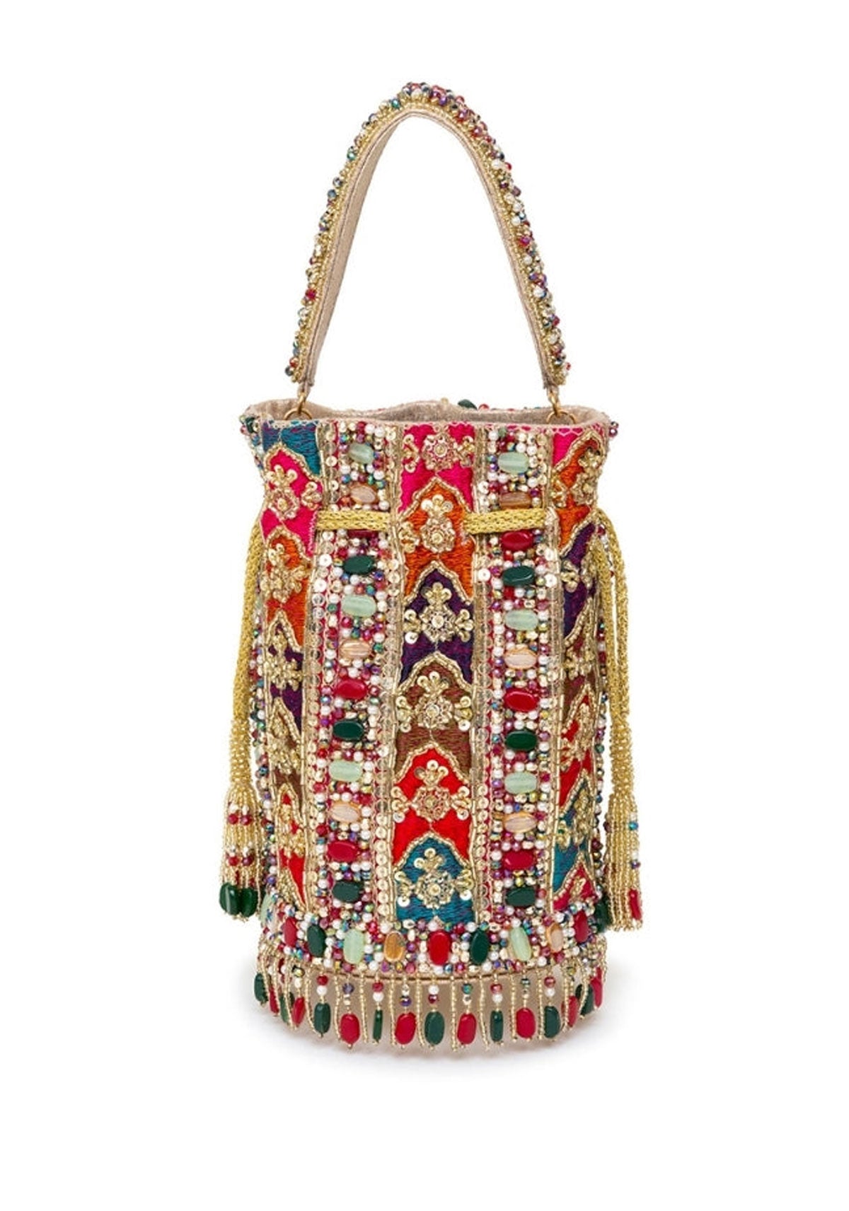 Our Fareeda Bucket Potli is decadently hand embroidered with an assortment of raw gemstones, glass micro beads & crystals. It has an ornate yet elegant look.This Multi Coloured bucket is a versatile accessory can be paired with fusion and ethnic occasion ensembles.