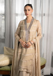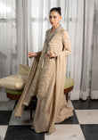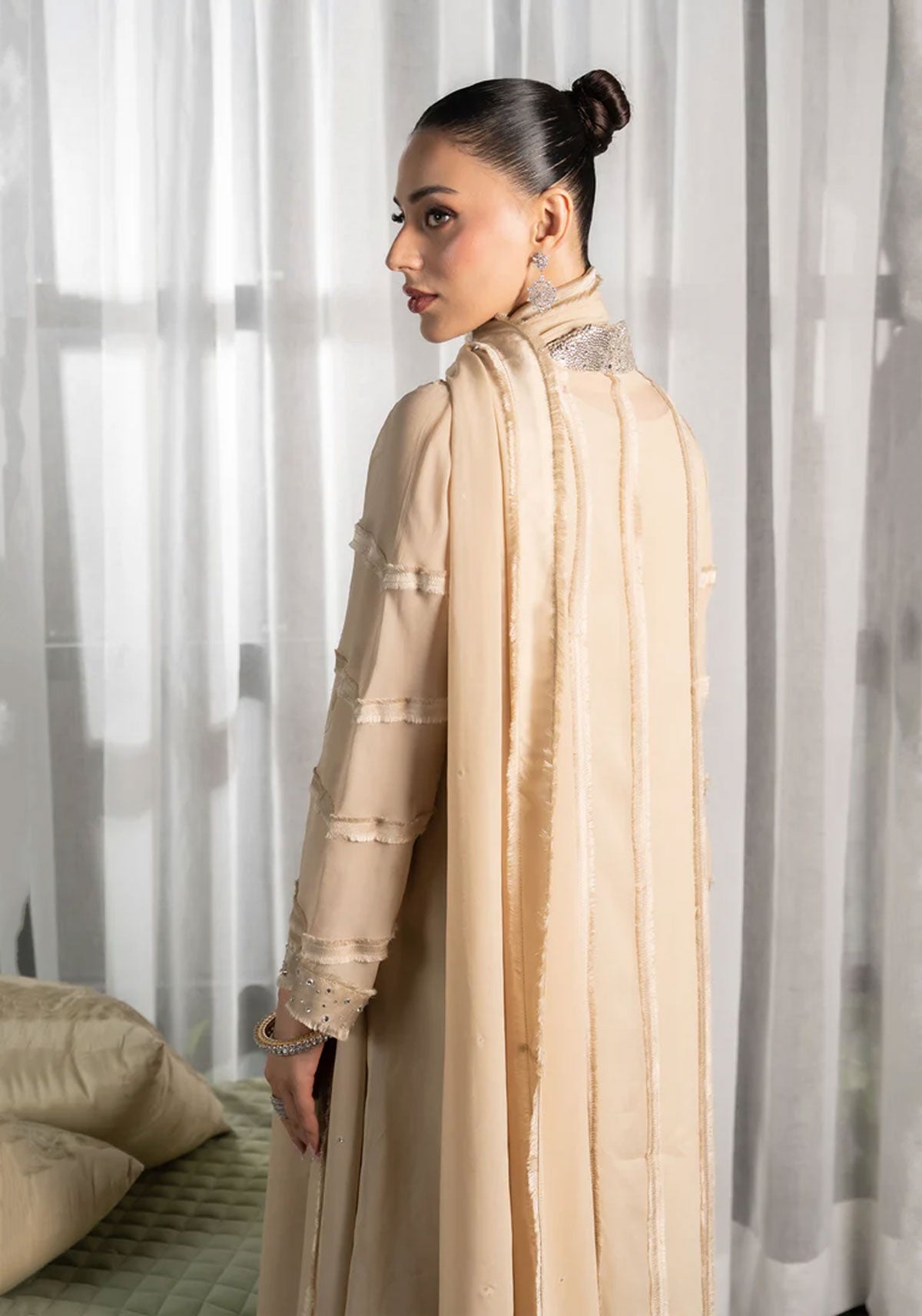This elegant ensemble features an asymmetrical pure chiffon shirt in a soft, neutral shade. The shirt is designed with unique satin raw edges and an exquisite Swarovski neckline. It is paired with complementary flared Korean rawsilk pants. A flowing chiffon dupatta with matching satin raw-edges and Swarovski completes this stunning look.
