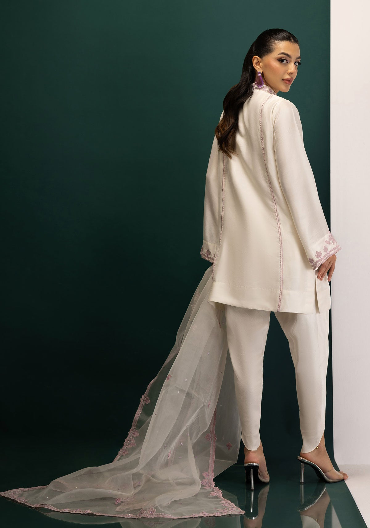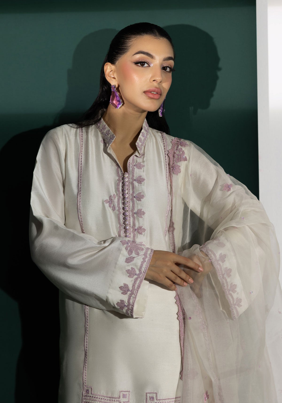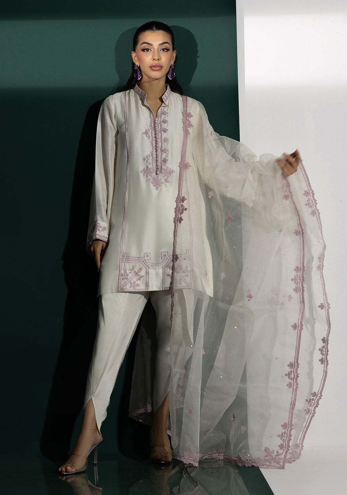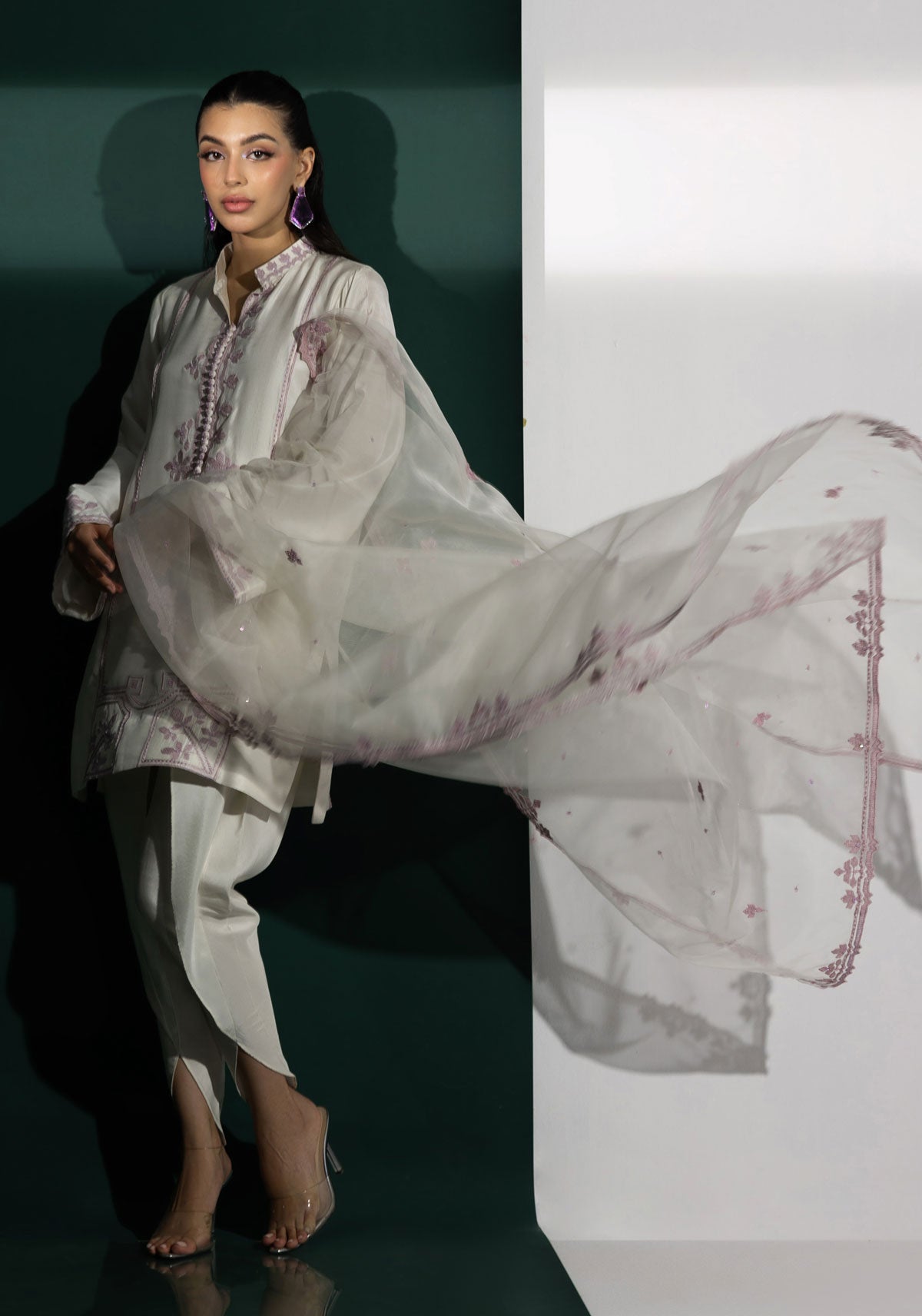 'Mariyam D Rizwan presents an effortless vision of graceful femininity with a capsule collection that captures the brand’s trendy aesthetic and modern elegance. Feya has intricate embroidery on the front of the shirt paired with a beautiful embroidered organza dupatta in cutwork. Model height is 5’6 and is wearing size a size small. Shirt length is 34 & Tulip Shalwar is 37 inches.