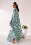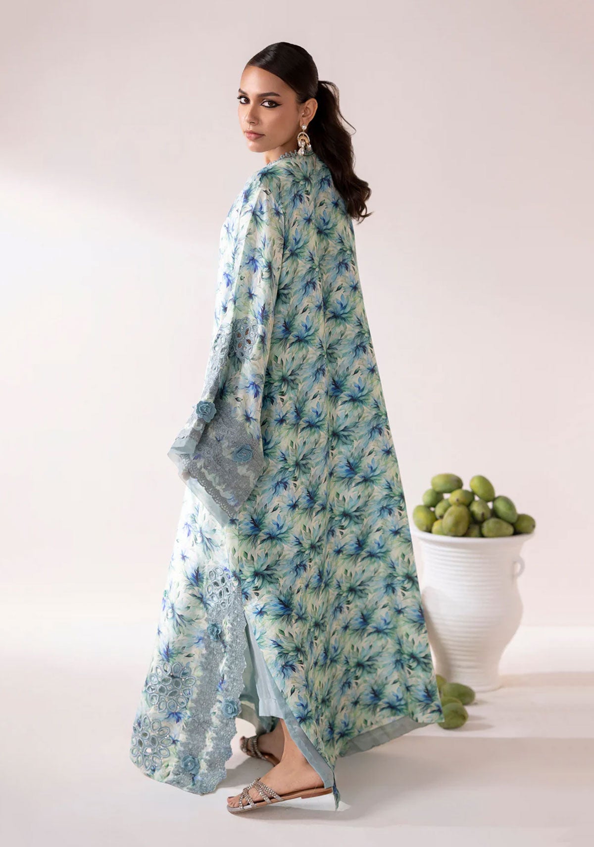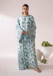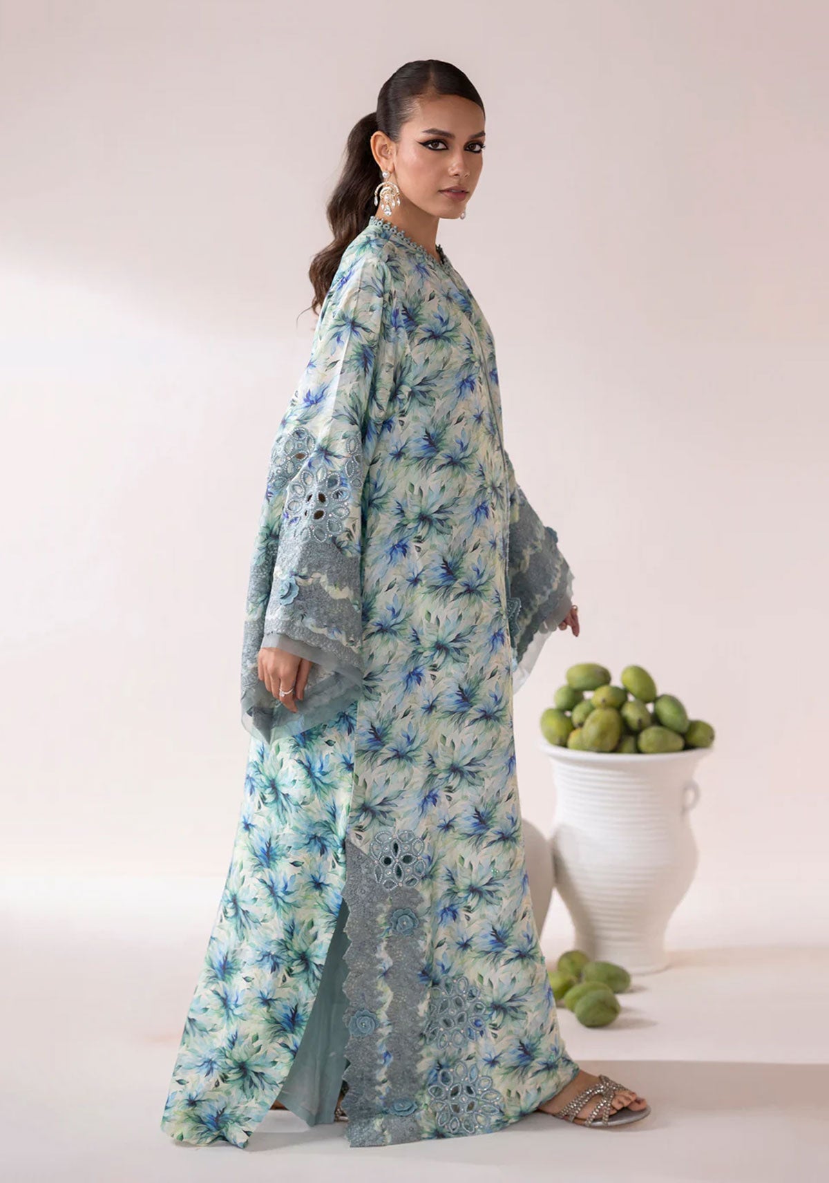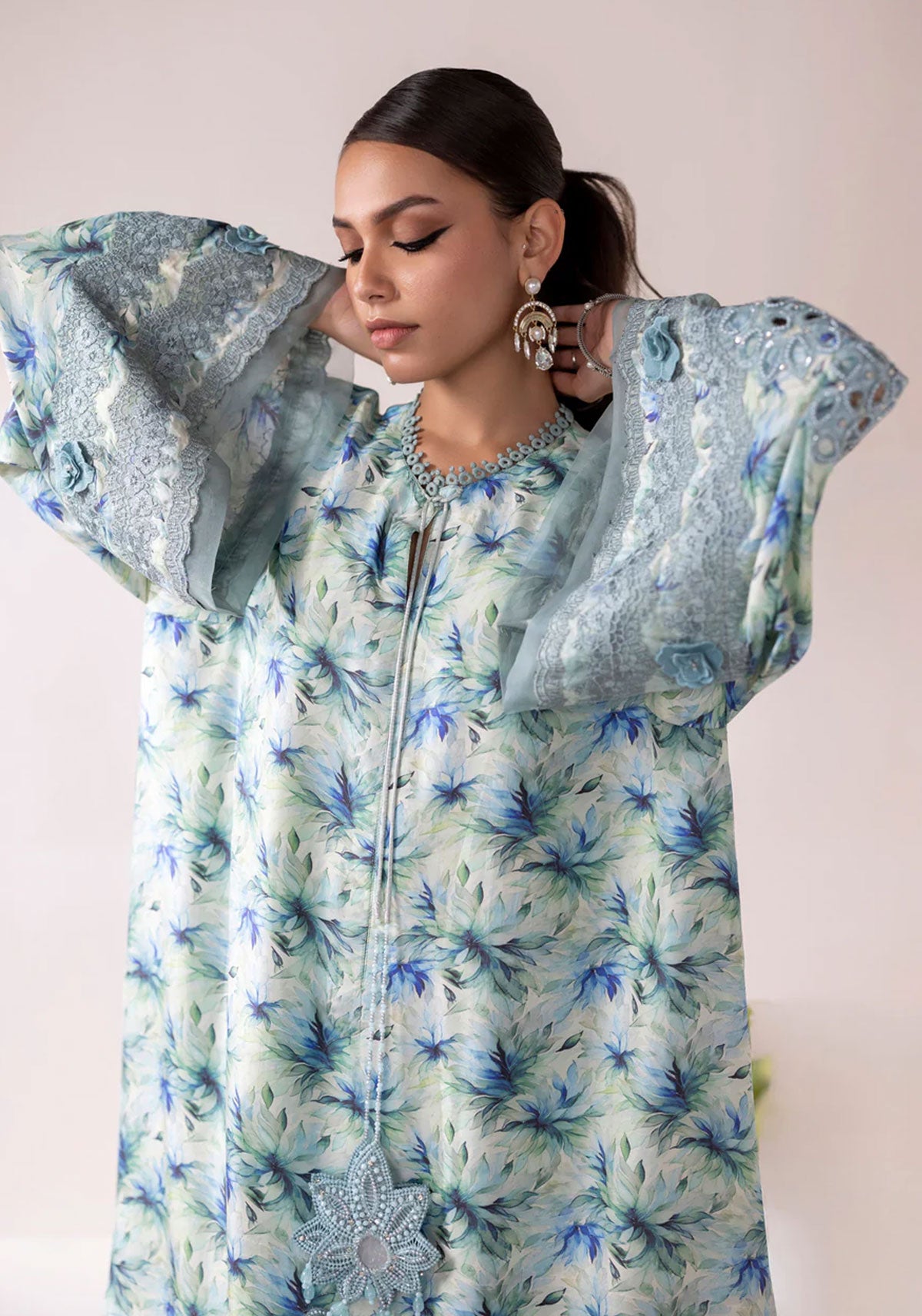 Feyral, in a cool, breezy blue floral print crafted from 60-gram pure raw silk, captures the serenity of a clear spring morning—light, airy, and effortlessly graceful. The neckline features delicate scalloped lace and a striking bunch of ice-blue floral tassels, intricately embellished with crystals, stones, and fine embroidery. Hand-embellished pearls and sequins add a soft shimmer, enhancing the overall refinement.