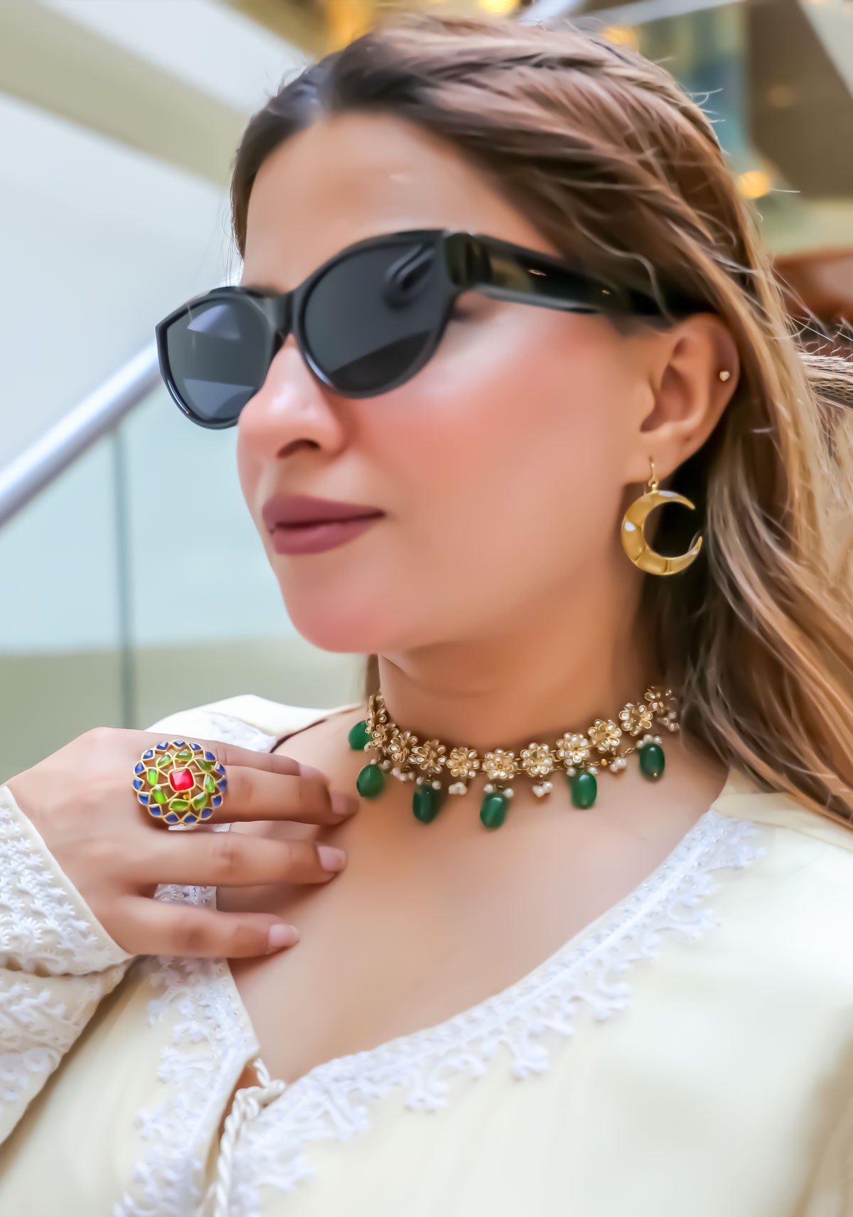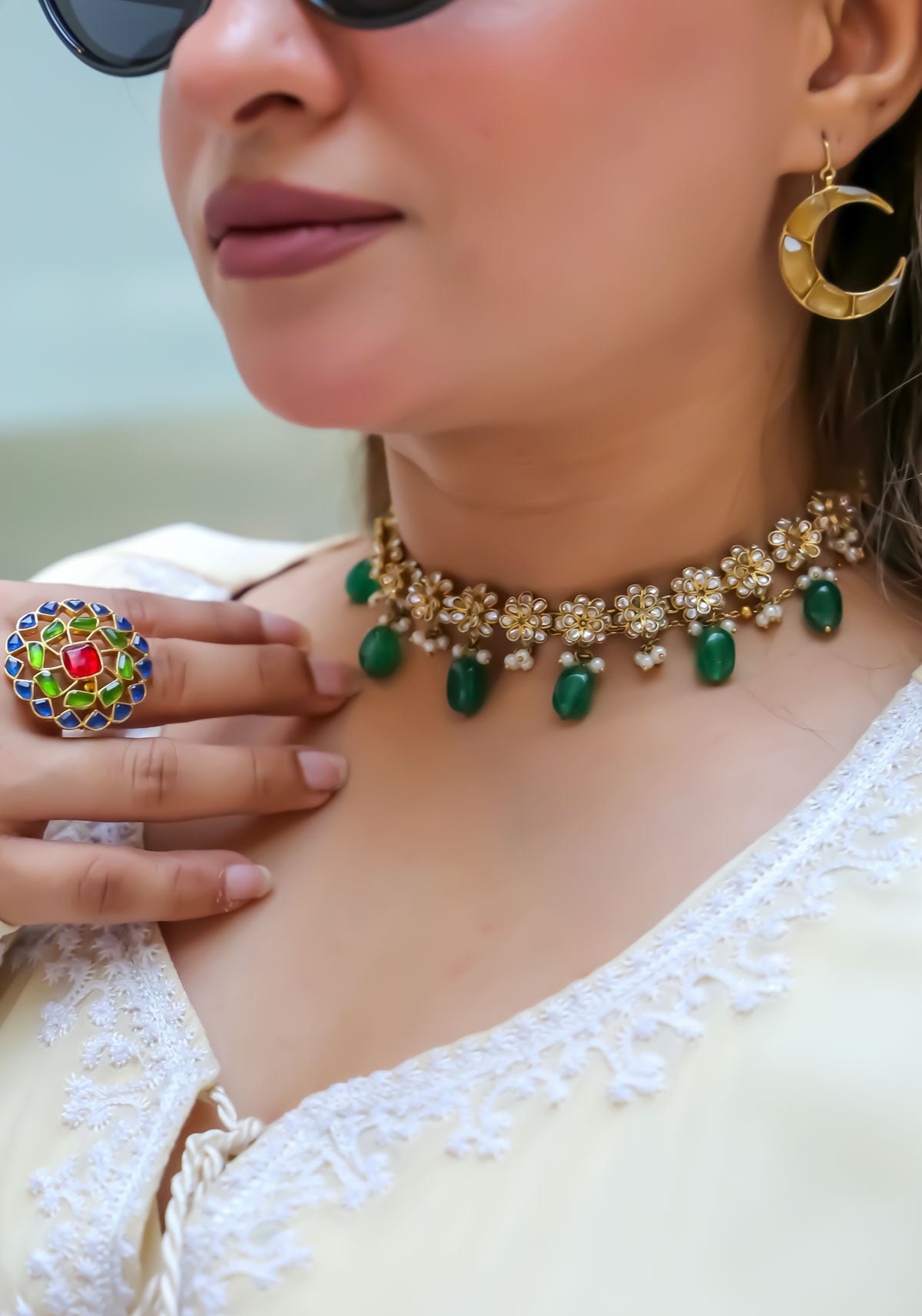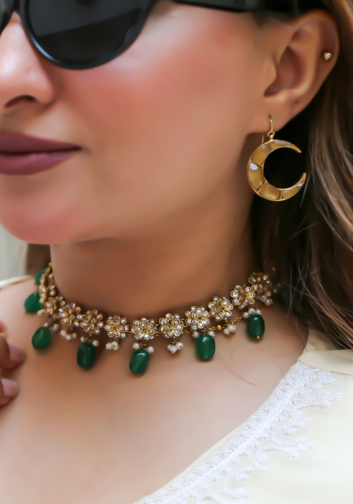 Elevate your look with the floral bloom choker, a delicate piece that embodies timeless elegance. Adorned with floral patterns and soft green bead drops, it adds a graceful touch to ethnic and festive outfits. Perfect for weddings and formal gatherings, this choker makes a refined statement with classic appeal.