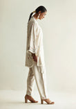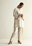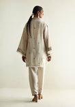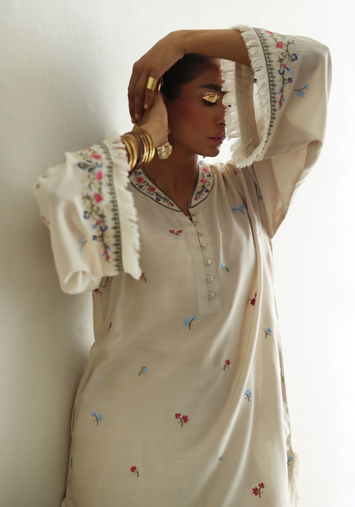 This Floral Whisper shirt showcases delicate embroidery embellished with small floral designs all over. Made from cotton, this elegant garment comes in black and ivory hues. It is offered in both short and long shirt styles, each adorned with detailed embroidery on the front, back, and sleeves, complemented by tasteful fringe detailing on the sleeves and hemline.