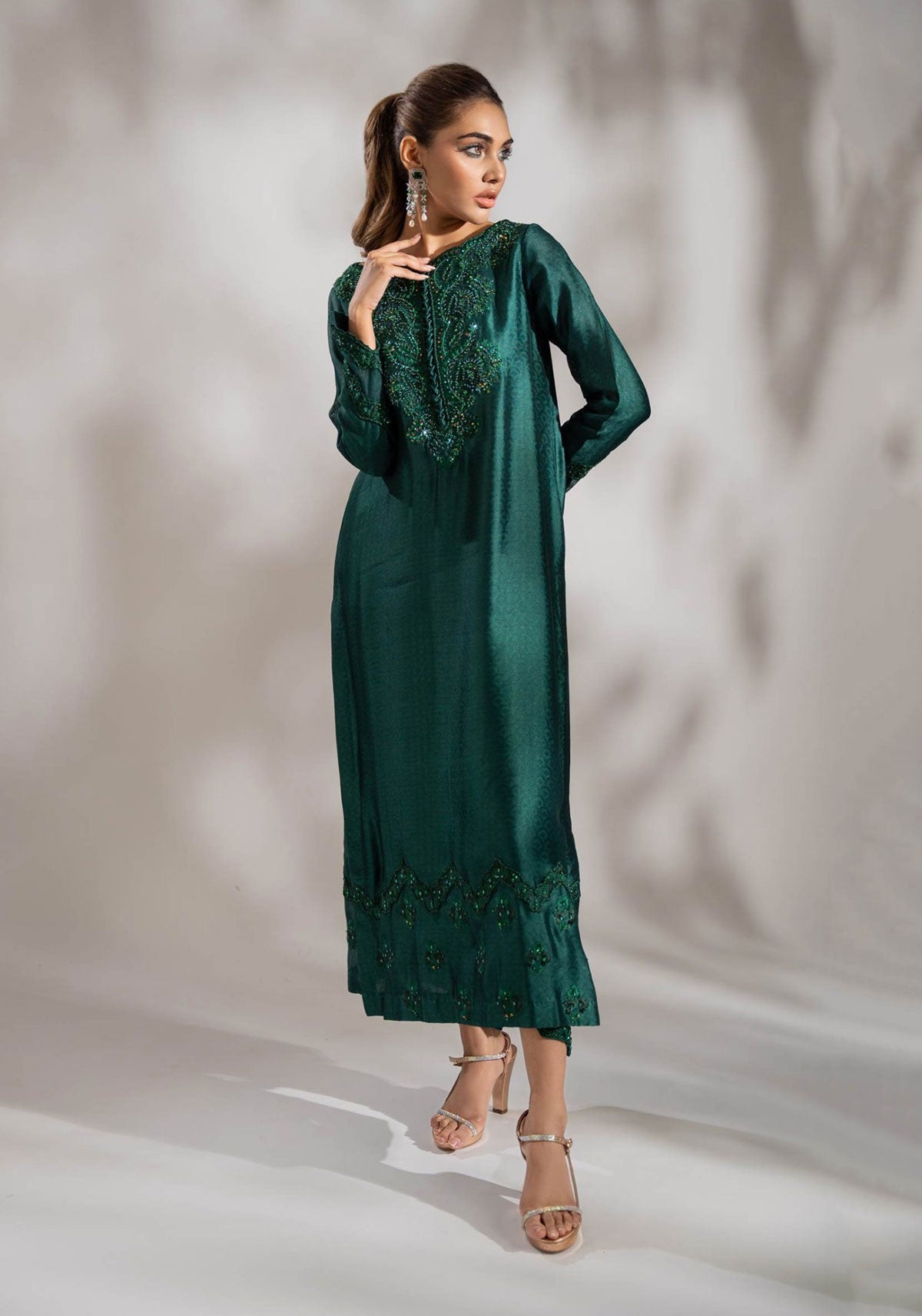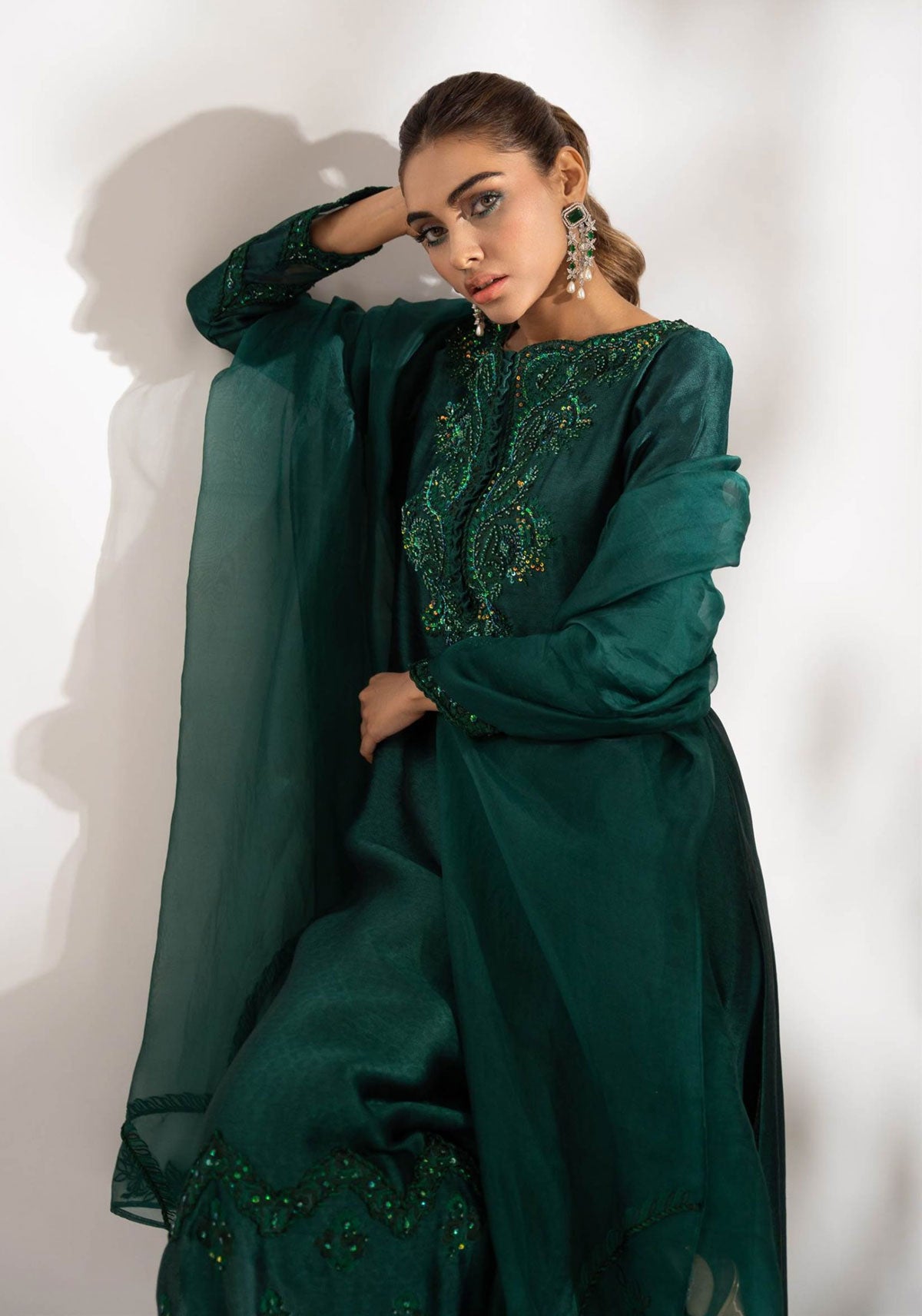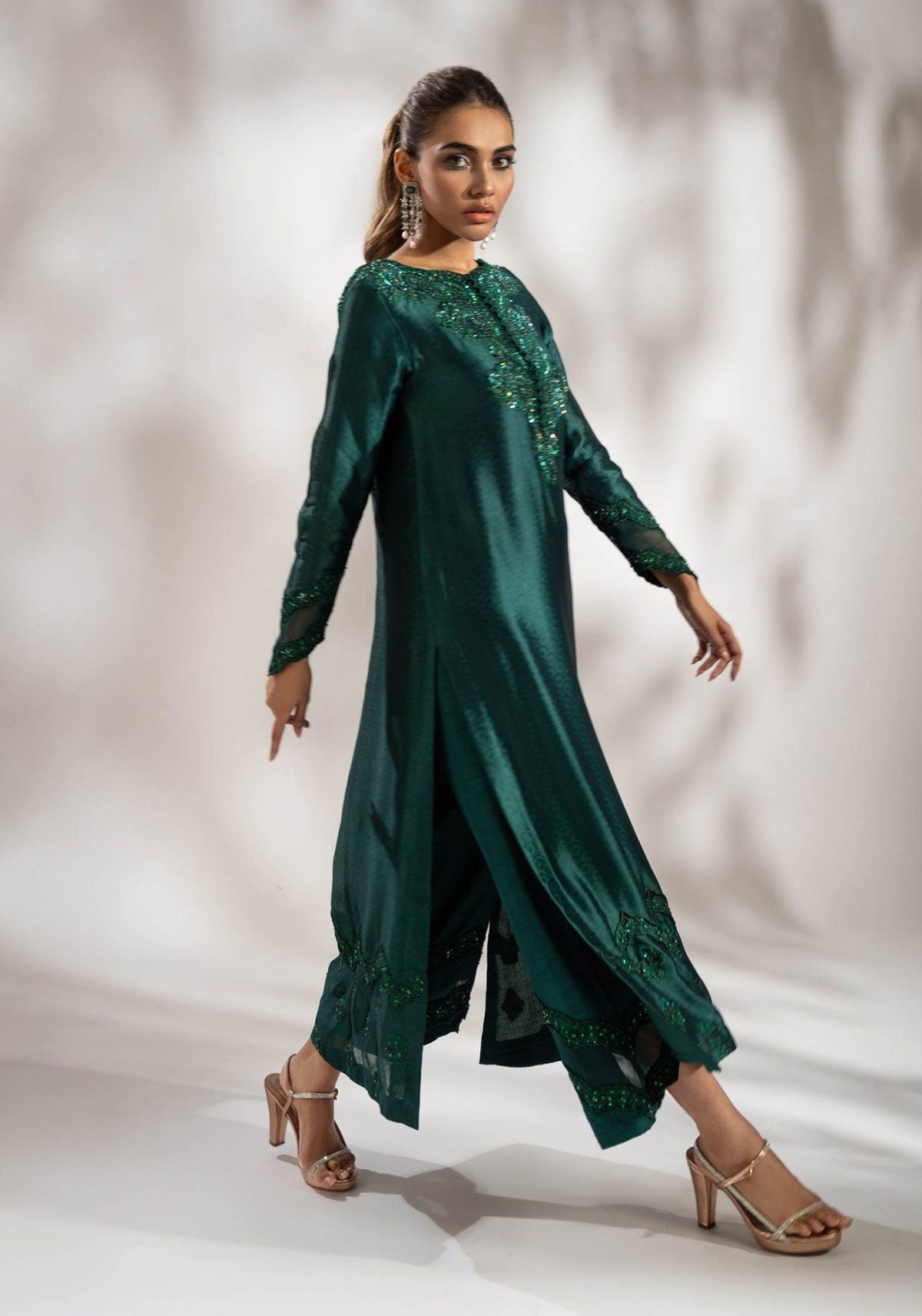 This formal outfit features a harmonious blend of detailed embroidery and elegant tailoring. The shirt with its matching embroidery border and cuff motifs pairs seamlessly with the Culottes pants featuring cutwork and embroidery. The dupatta with thread embroidery and tassels completes the look, ensuring a sophisticated and polished appearance.