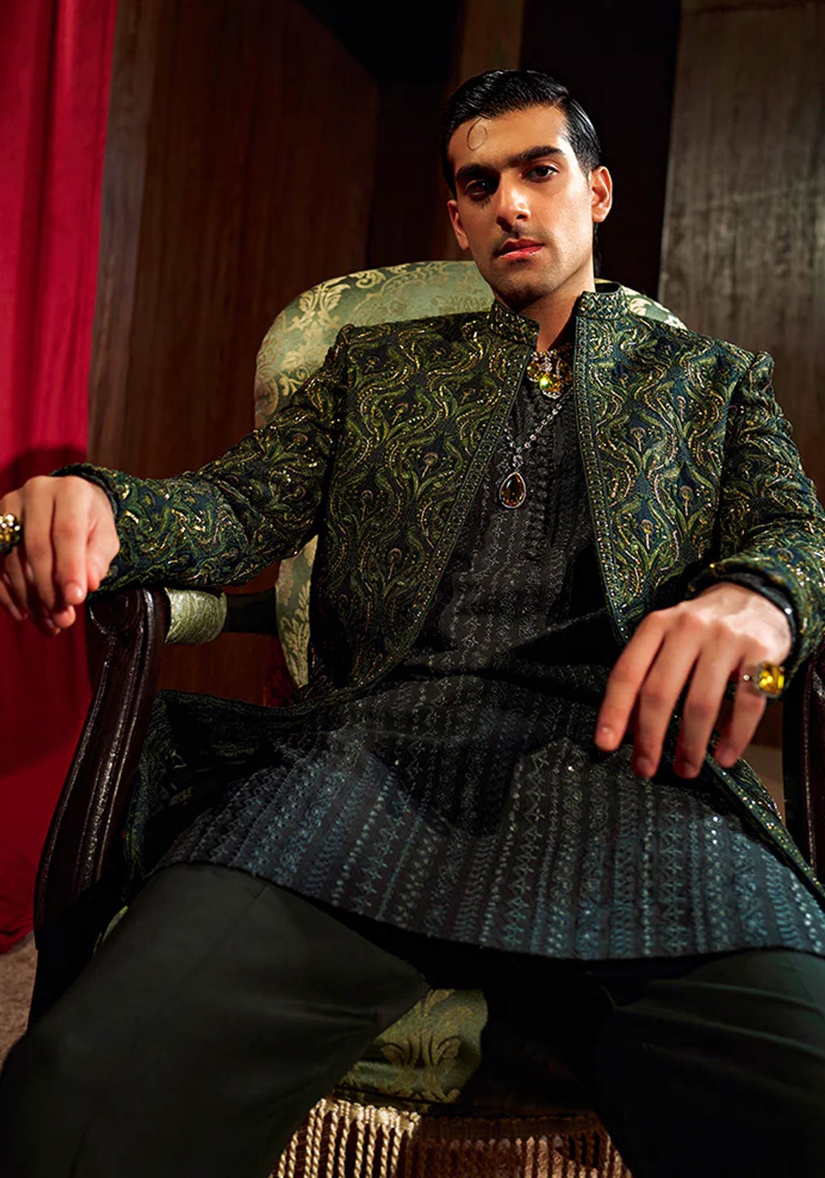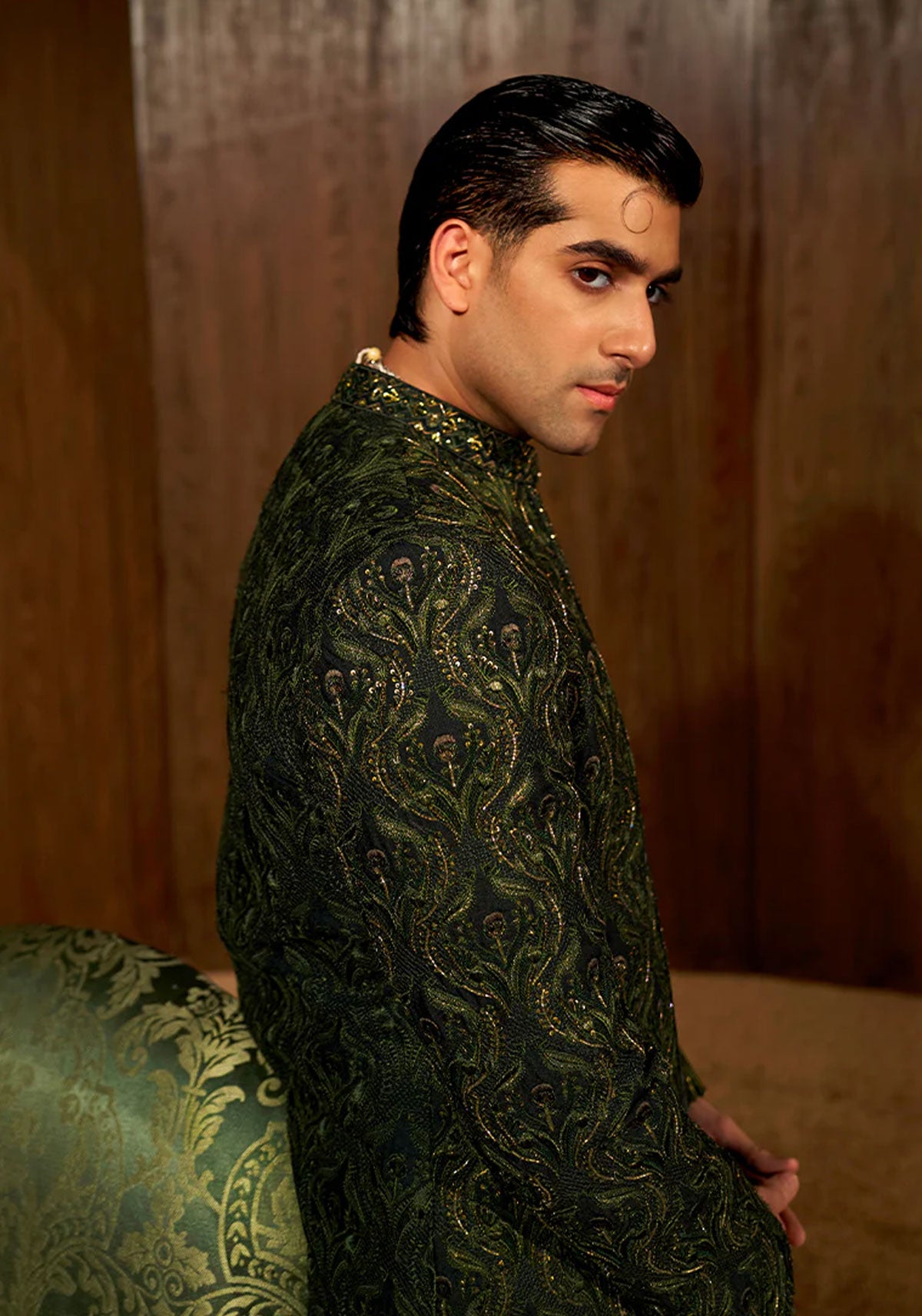 'A forest green sherwani detailed with an allover floral pattern with intricate threadwork embellishments, bronze tilla and sequins. Paired with a monotone deep green kurta and pajama set with geometric linear embroidery with sequins.