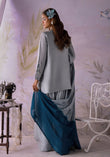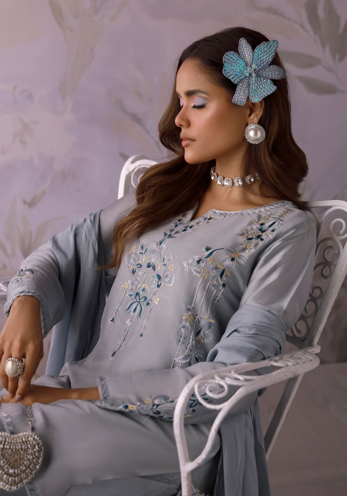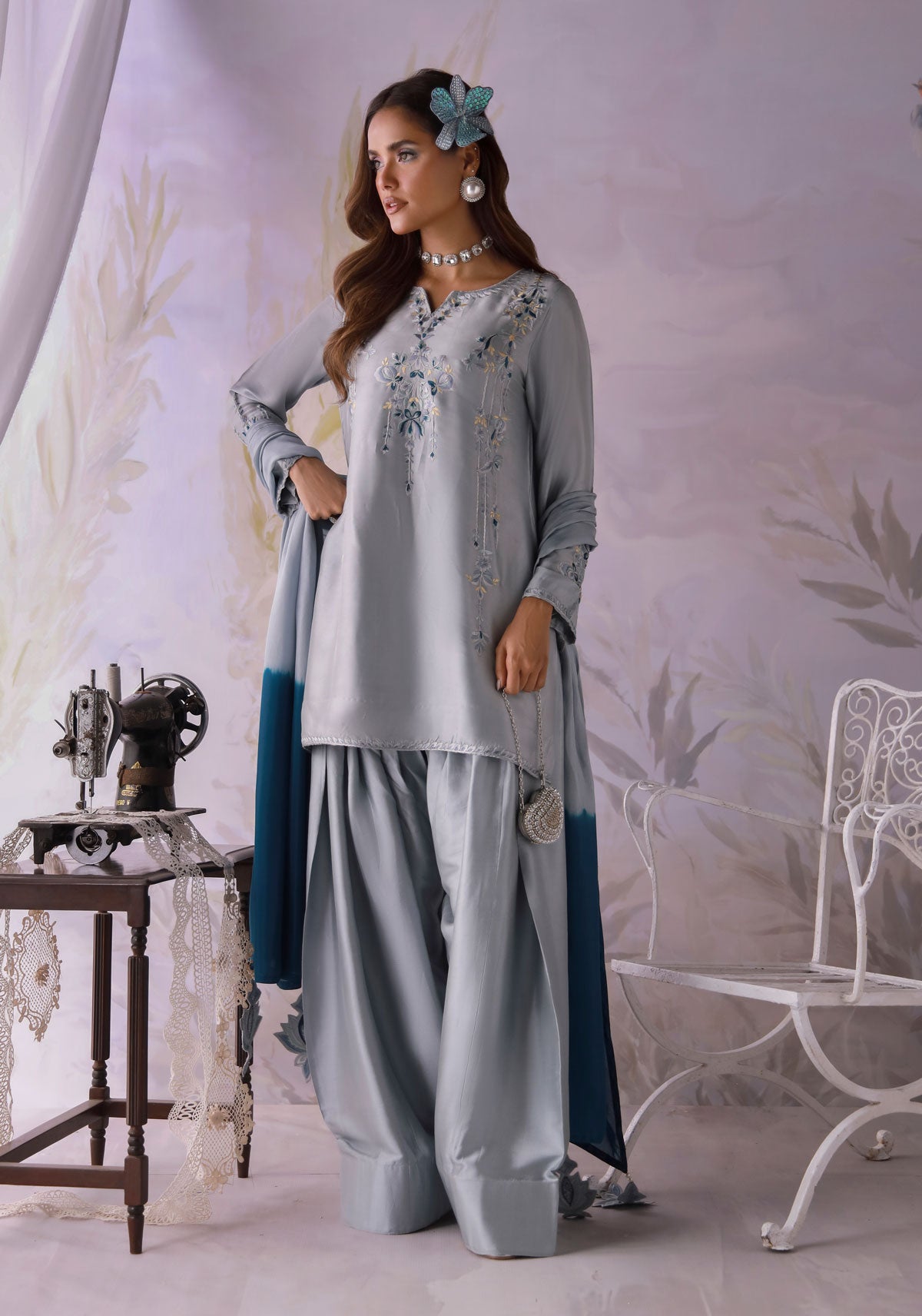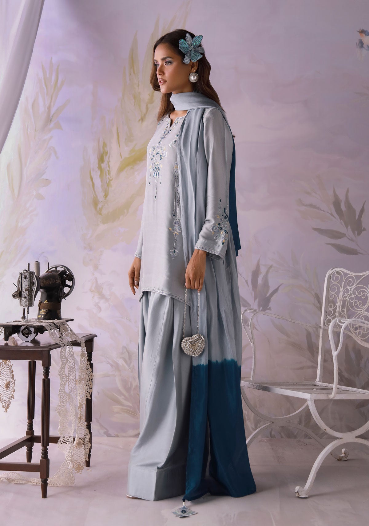 The statement shade of the season! A serene ensemble in pure butter silk — featuring a delicately embroidered shirt and matching farshi shalwar in icy blue. Style it with a dip-dyed medium silk dupatta, finished with resham tassels on the pallus, for a soft yet striking contrast.