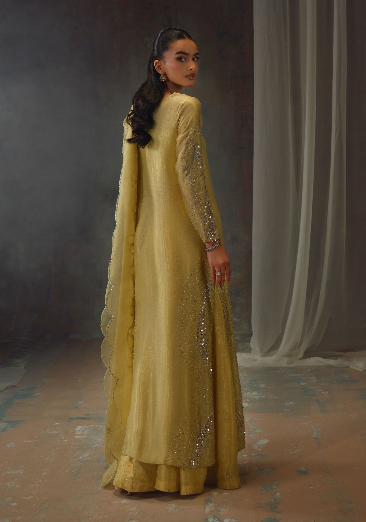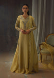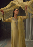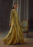 Bathed in a soft golden hue, and crafted from luminous zari net, the fluid silhouette is brought to life with meticulous hand embellishment. The shirt glistens with intricate detailing, while the lehnga mirrors the same artistry, creating a harmonious shimmer with every step. Can be paired with an airy organza dupatta adorned with delicate handwork for a light, ethereal finish, or a richer pure silk-and-organza blend, also hand-embellished, for a more modern drape. For a modern twist, the look can be paired with wide-leg pants, transforming this timeless piece into a statement of contemporary sophistication.