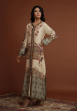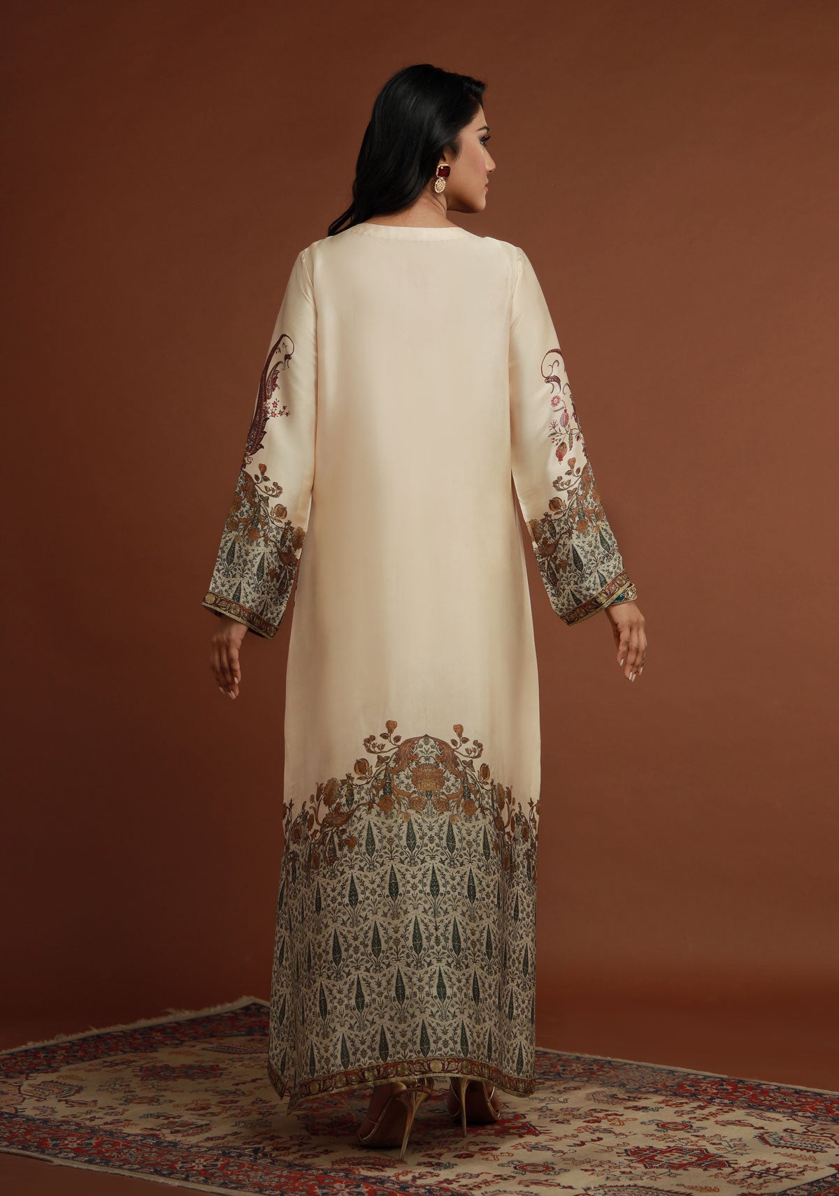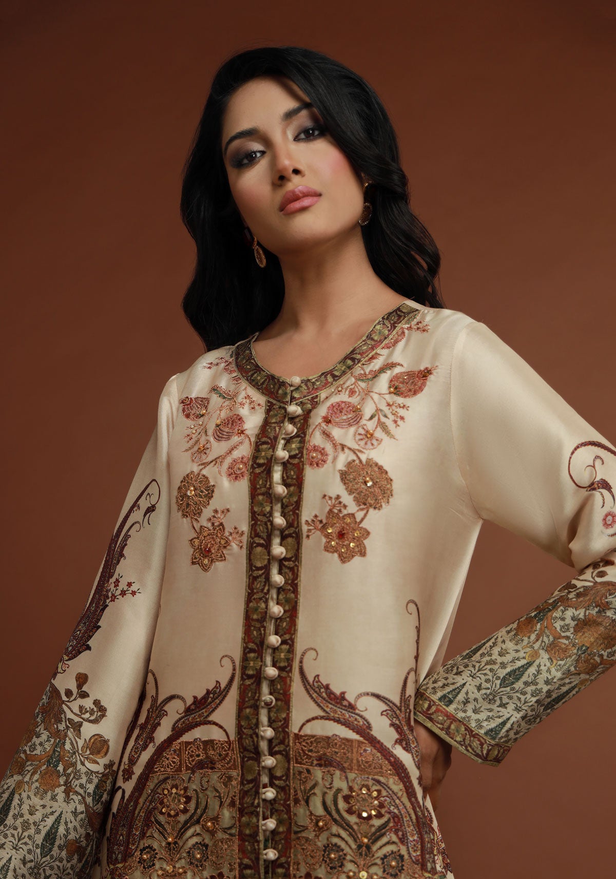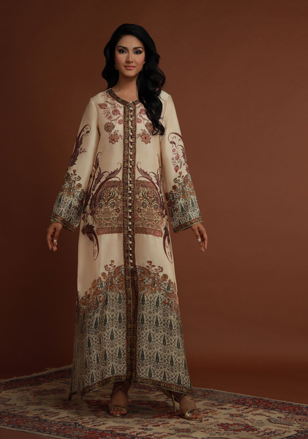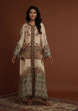 Originally, Shamaeel's print is showcased in a long, straight, front-open silhouette, featuring a regal Baroque-inspired design on opulent sheesha silk. Intricately adorned with gold and antique gold-outlined, elaborate embellishments, the ensemble radiates timeless grandeur. The neckline is embellished with pearls and sequins.