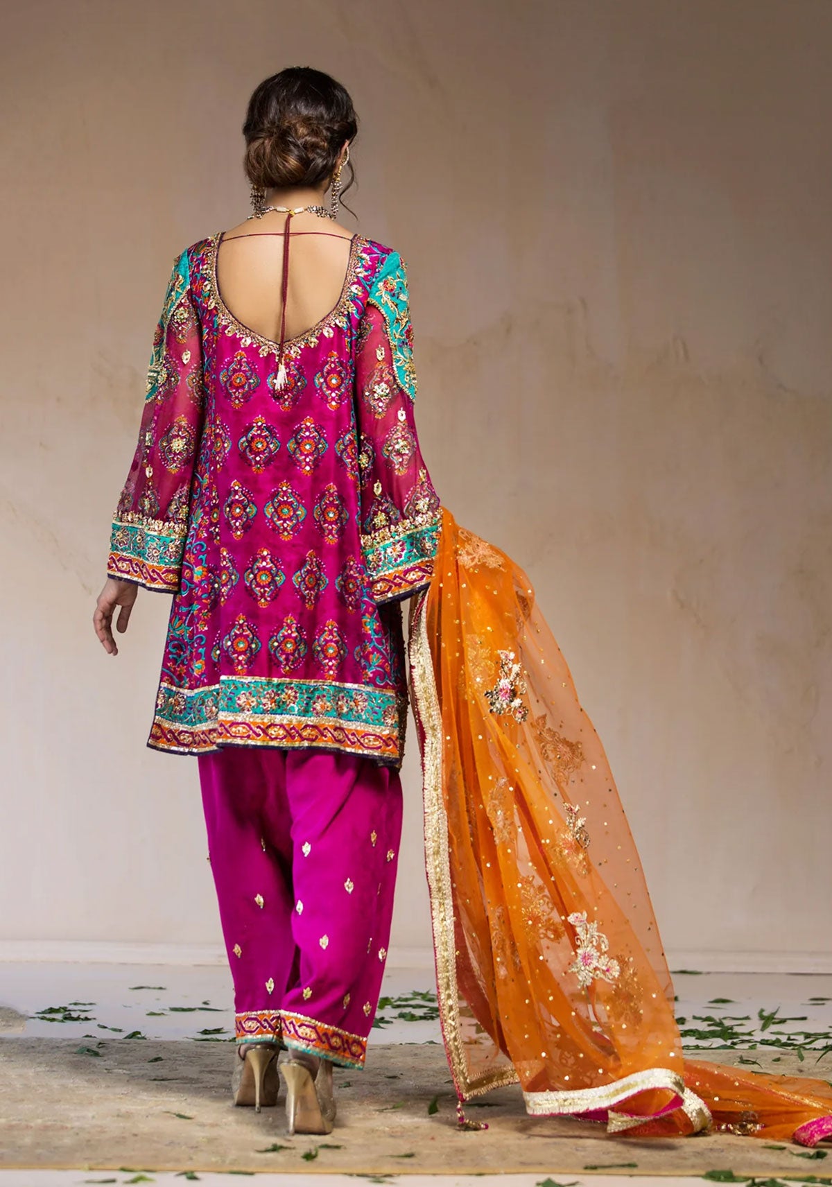 A stunning net-based fabric ensemble featuring exquisite gota work with a combination of lappa and floral embroidery to enhance the look of duppata.