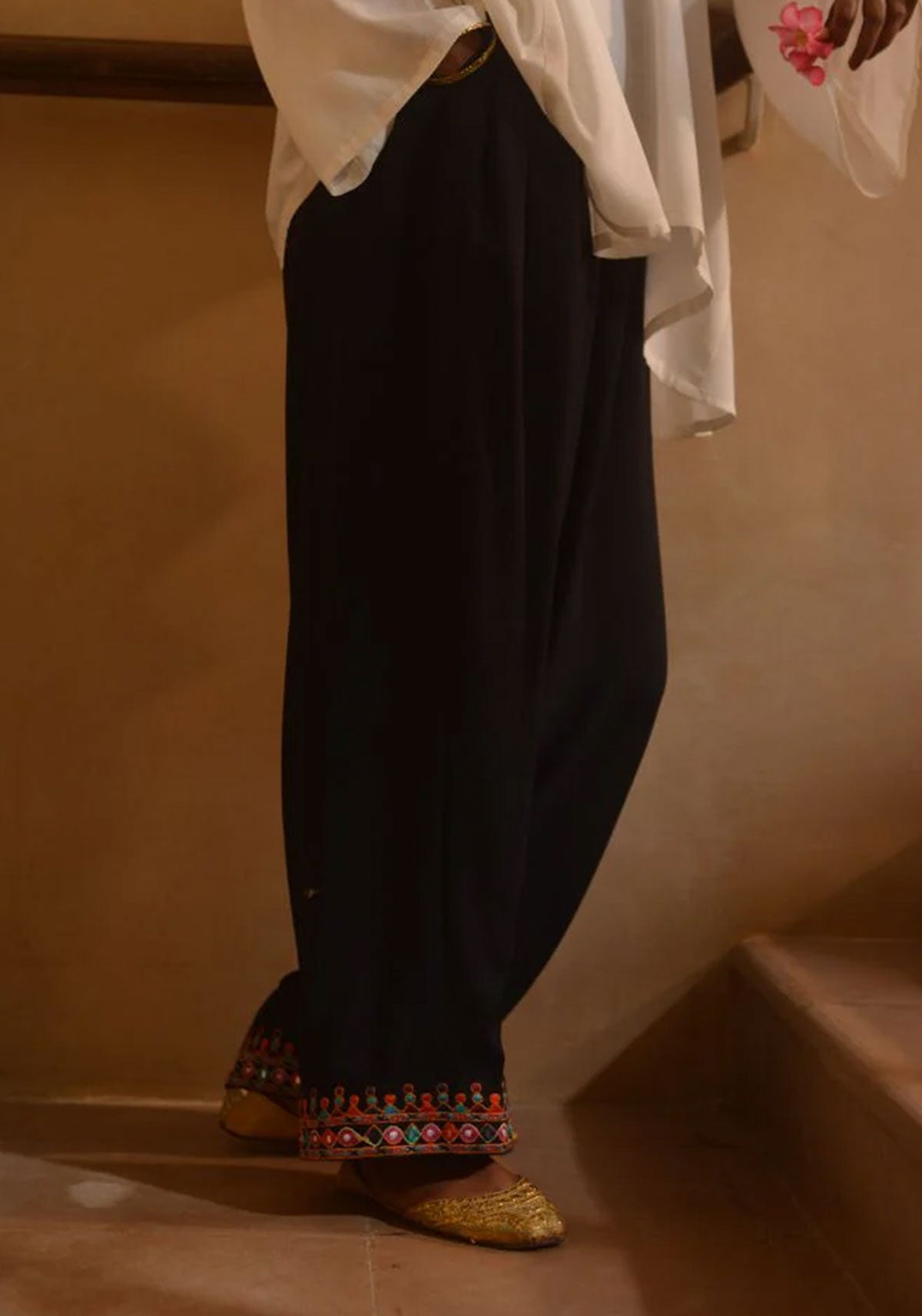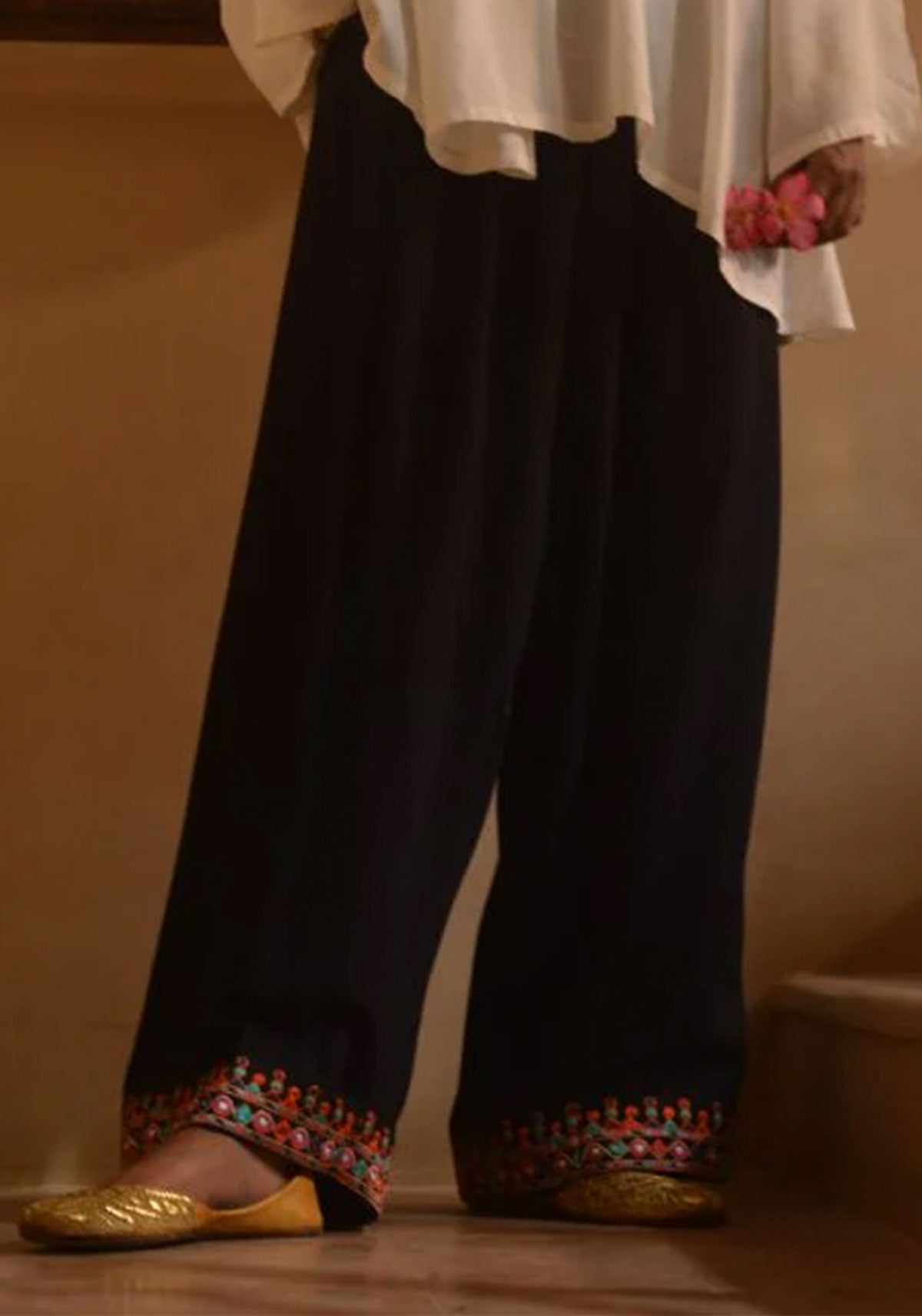 Introducing Jugnu, the Gulabo Shant trouser shalwar with a wide hem embroidered in a traditional border. The perfect blend of shalwar and trouser, it is the perfect addition to your wardrobe & it has pockets! Ever so versatile, pair it our Seher kurta or any other of your choice for an effortlessly chic look!