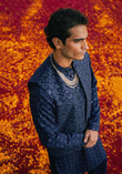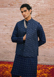 A french navy blue embroidered waistcoat inspired by floral and geometric patterns, crafted in traditional tilla and mirror work.
