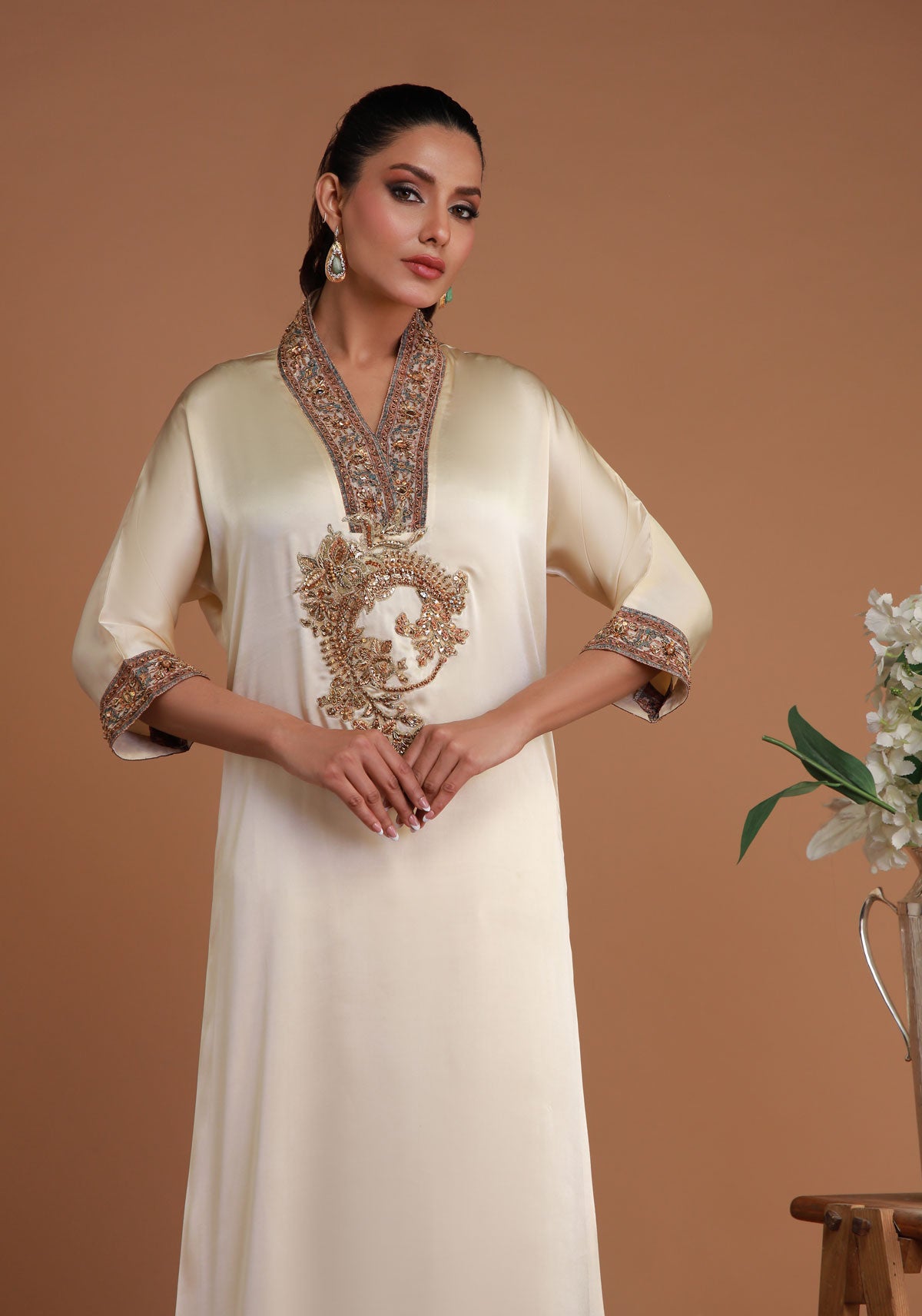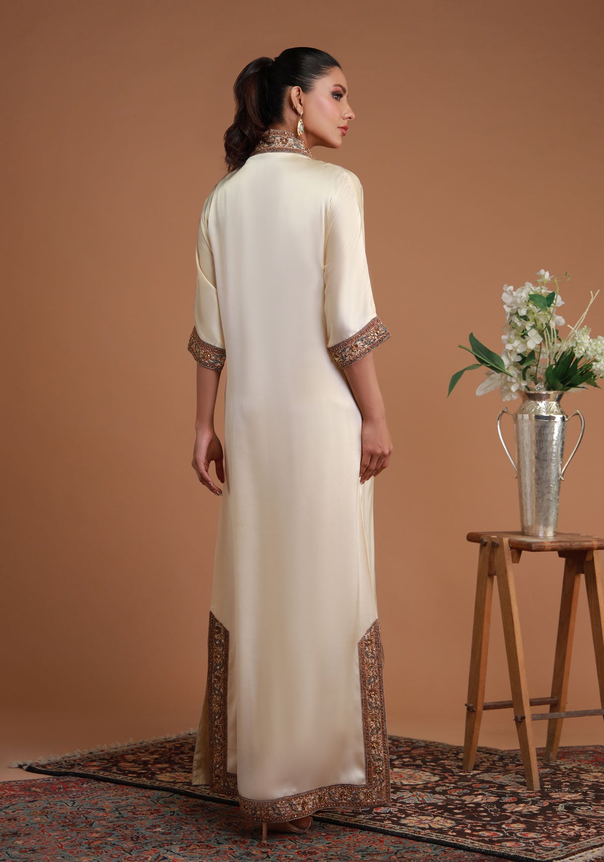 'This exquisite coffee-colored kaftan masterfully combines traditional craftsmanship with modern sophistication. The Mughal printed neck patti, adorned with delicate florals and geometric patterns, channels the opulence of India’s Mughal era, adding a regal touch. Intricate machine embroidery enhances the kaftan, creating a textured effect that complements the Mughal-inspired neck design. However, the true highlight is the hand-embroidered motifs on the neck, adding an exclusive, whimsical touch that speaks to artistry and romance. This kaftan is a perfect blend of fusion fashion, making it an ideal choice for formal events, weddings, or any special occasion where elegance is paramount.