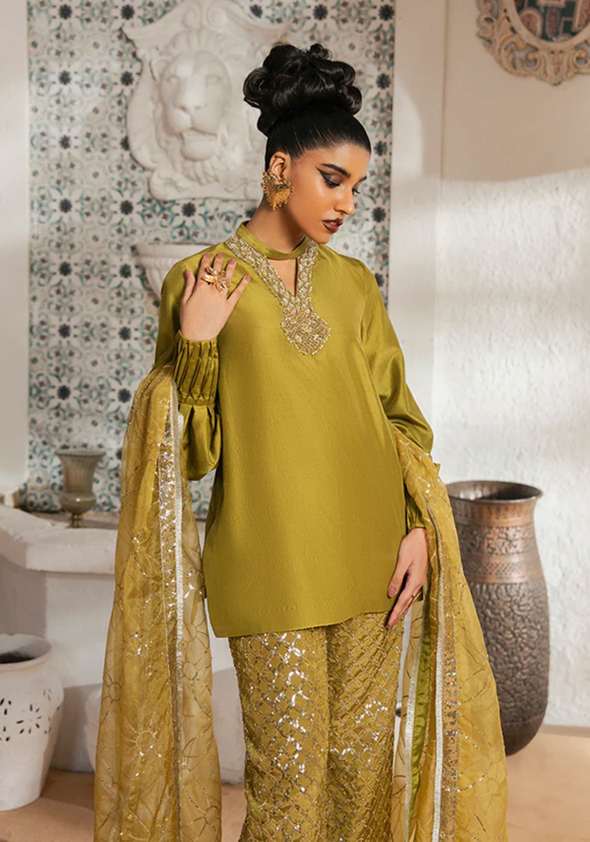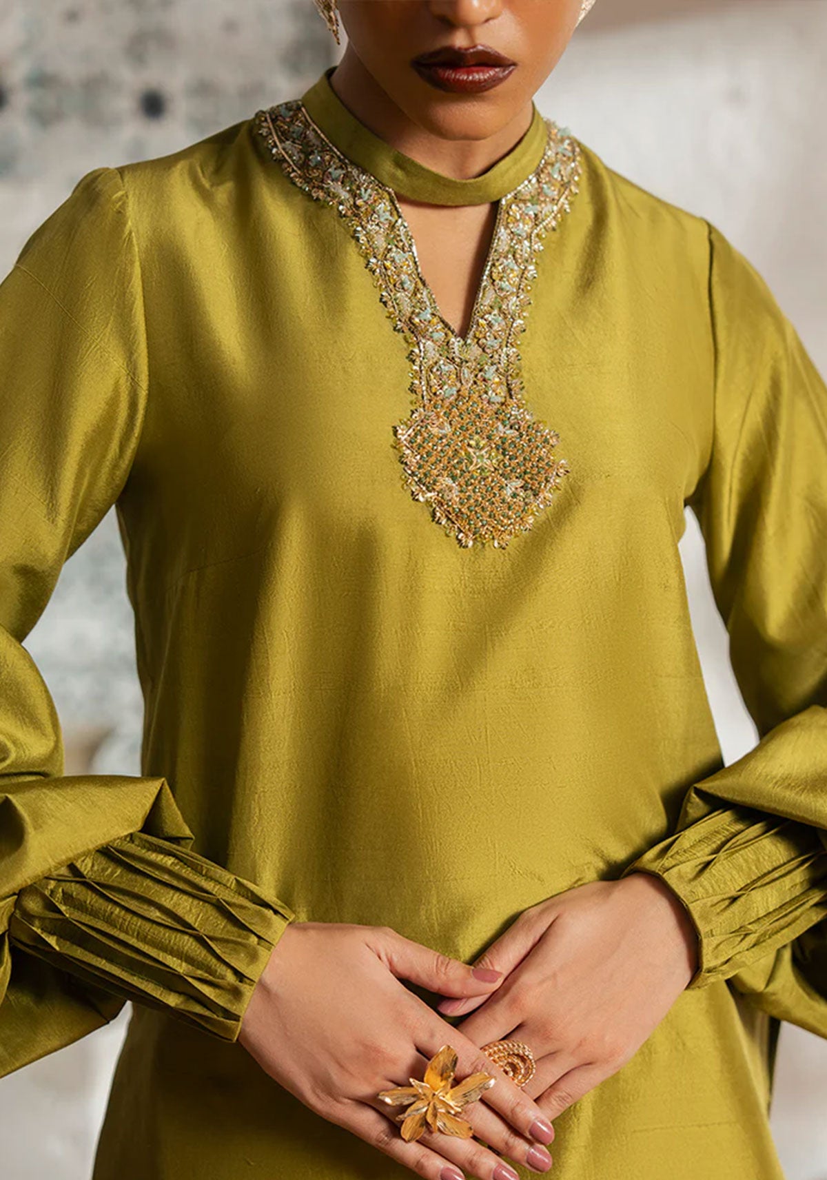 Make a sophisticated statement with this stunning green 3-piece ensemble, designed to blend traditional elegance with contemporary flair. The set features a short shirt crafted from pure raw silk, adorned at the neckline with exquisite hand embellishments including gold sequins, gotta, nakshi, and cut dana in enchanting shades of green and pink.