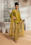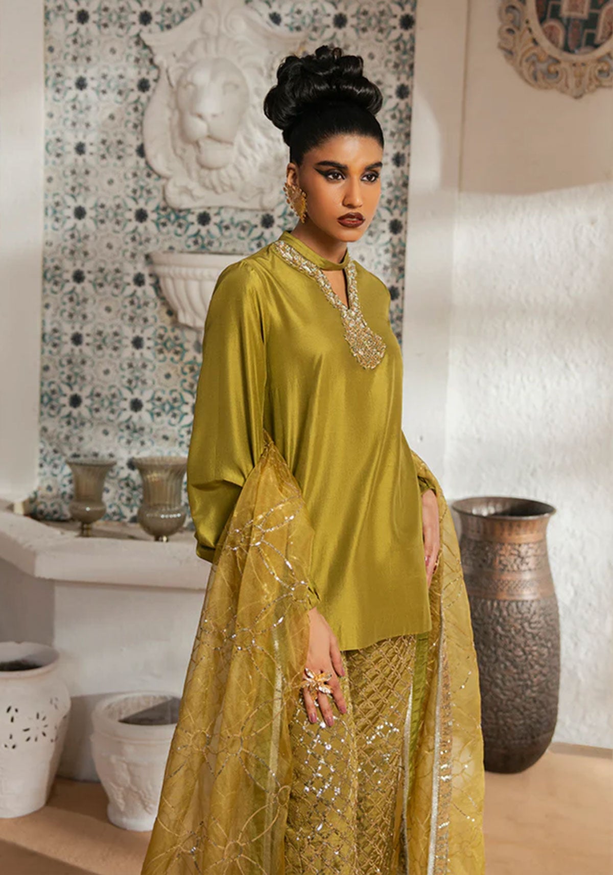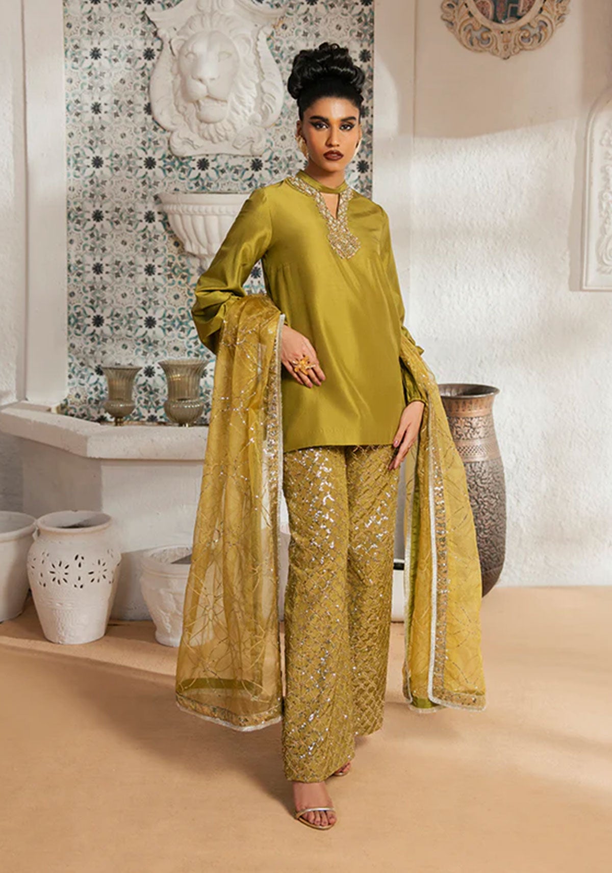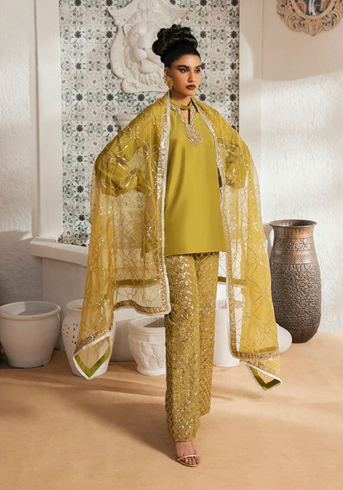 Paired with beautifully tailored raw silk palazzo pants, the design is elevated by a sequined grid pattern and delicate embellishments that add movement and richness. The ensemble is completed with a lightweight organza dupatta, meticulously embroidered with a detailed border on all four sides—offering an ethereal finishing touch.
