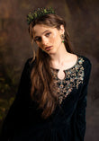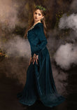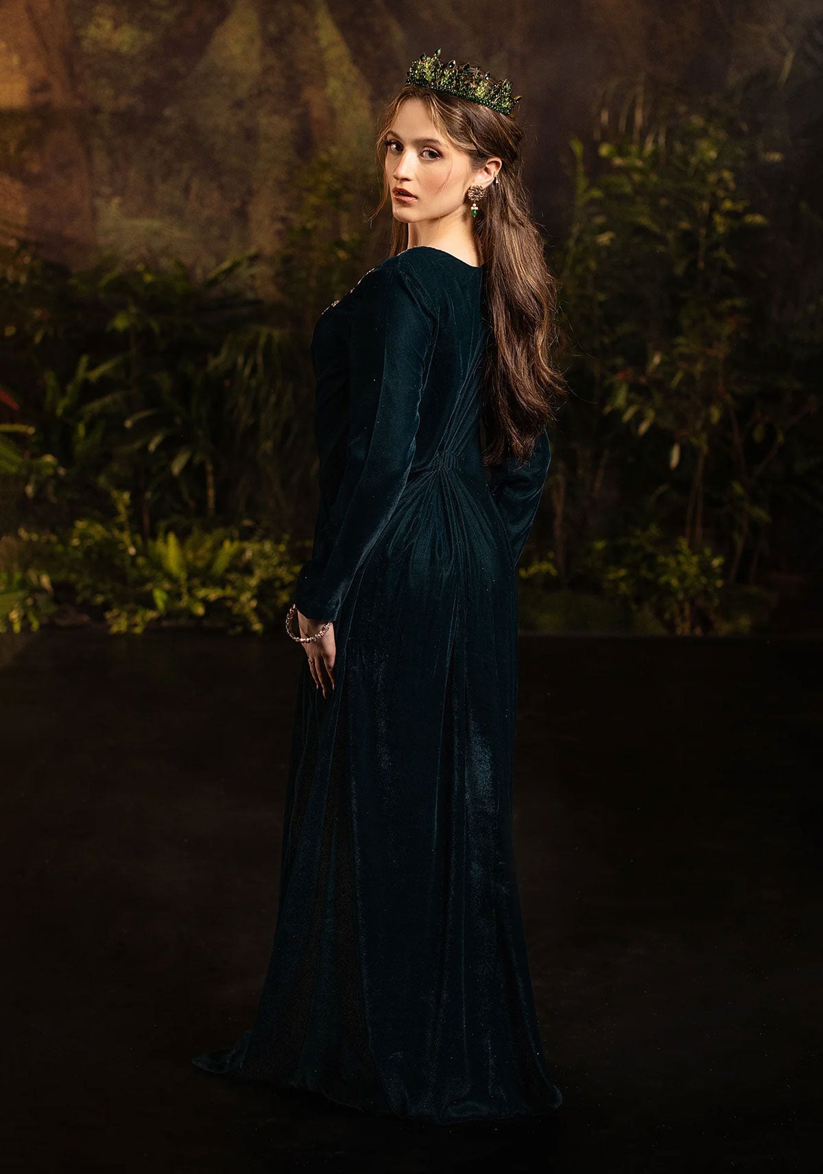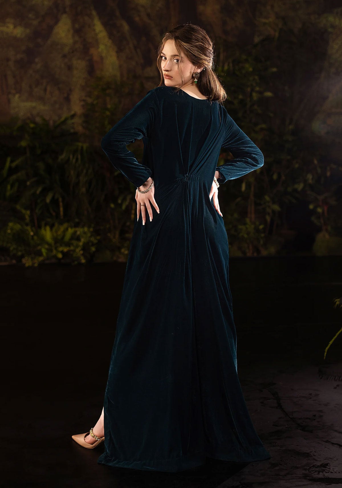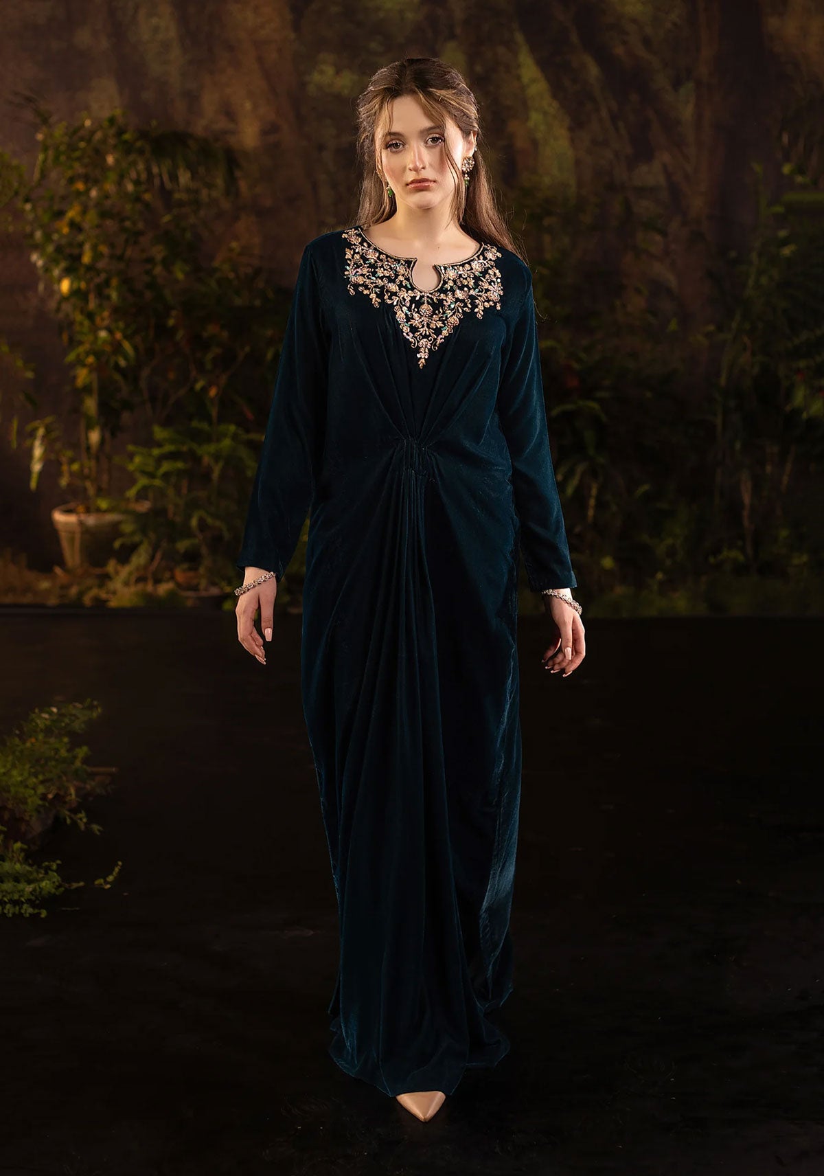 Draped in depth and elegance, this teal-green velvet kaftan is a statement of refined luxury. The silhouette gathers softly at the waist, creating graceful movement that elongates and flatters. Intricate embroidery blooms across the neckline, catching light with quiet brilliance. With its long sleeves, fluid fall, and regal hue, this piece carries the poise of tradition re-imagined for the modern night—sophisticated, timeless, and luminous.
