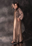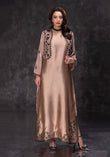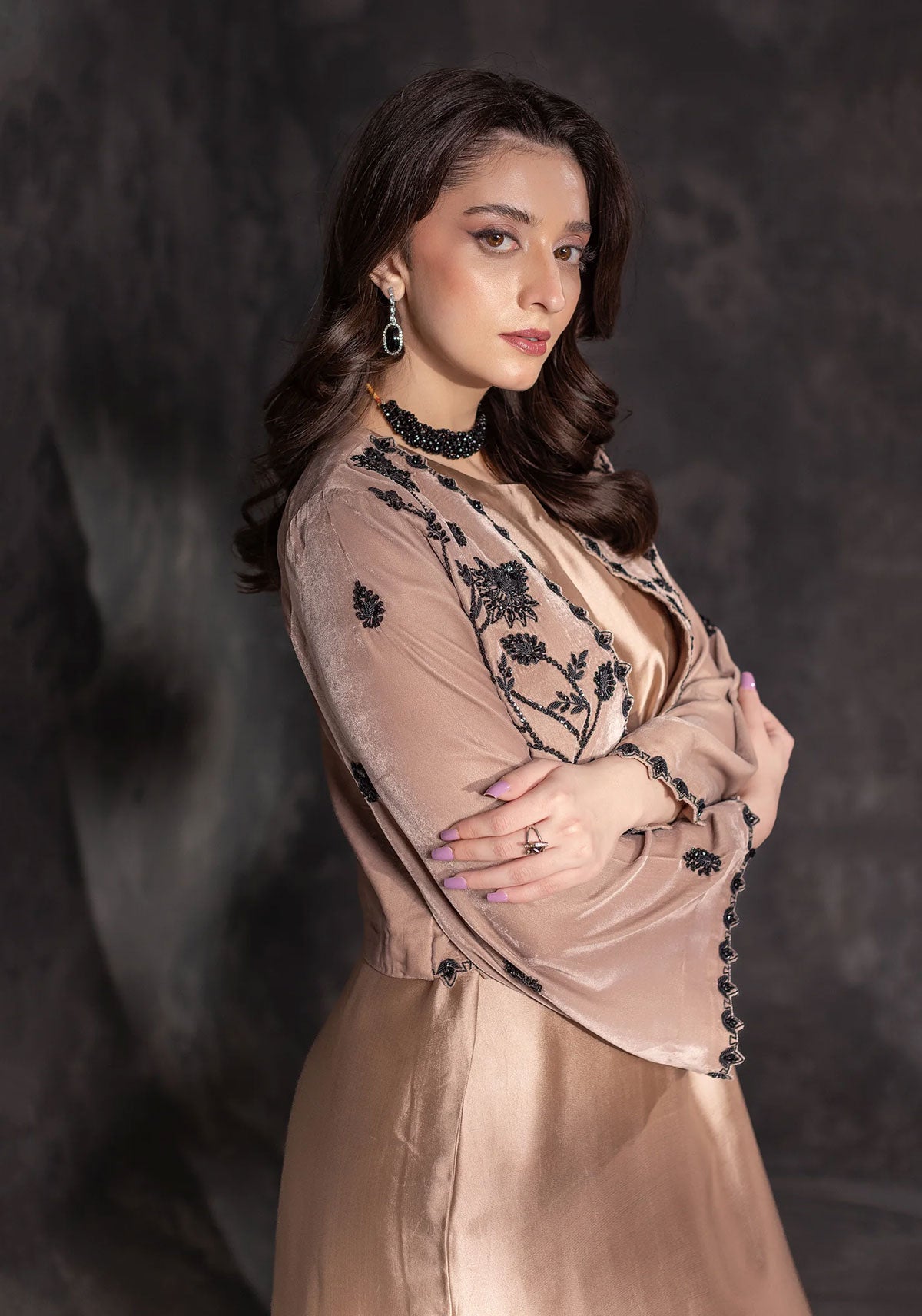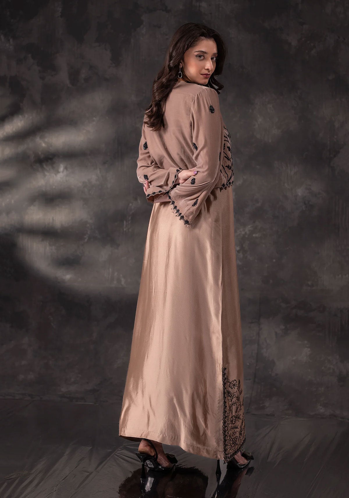 This ensemble captures classic sophistication with a contemporary couture twist, featured on a champagne silk base that drapes exuding effortless luxury through its sleek, minimalist silhouette. Over it rests a velvet jacket, intricately embroidered with black floral motifs, creating a striking interplay of softness and contrast. The subtle sheen of the silk paired with the matte texture of the embroidery gives the look depth and dimension, while the straight-cut form elongates the figure with quiet elegance.