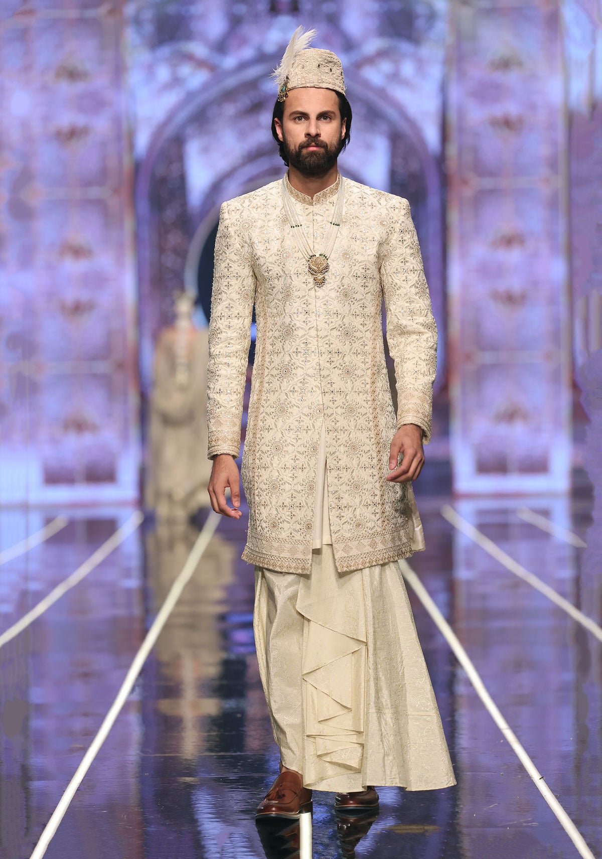Printed tassel silk dhoti shalwar with a sequined and panni-detailed silk sherwani. Inner kurta completes the look.