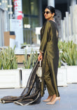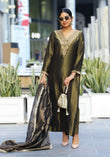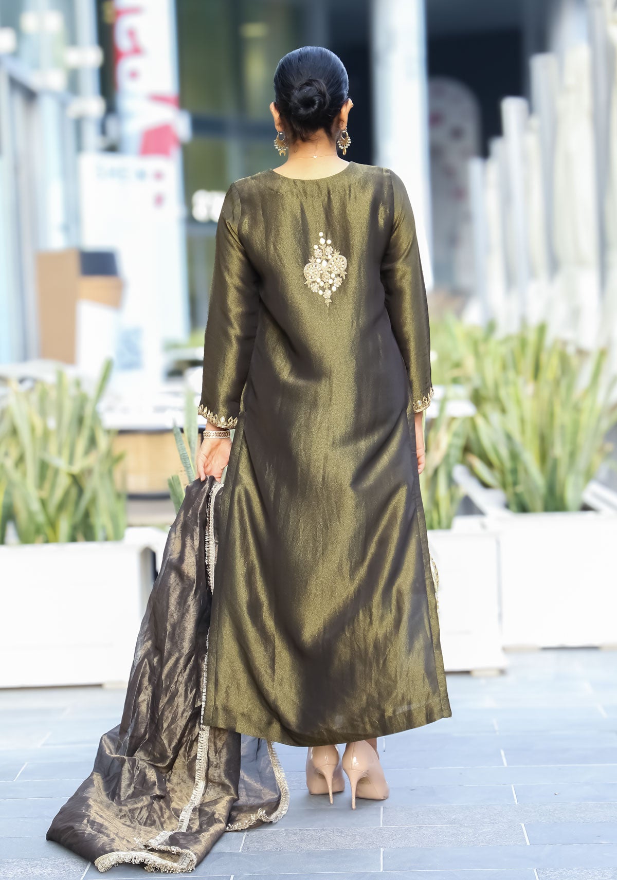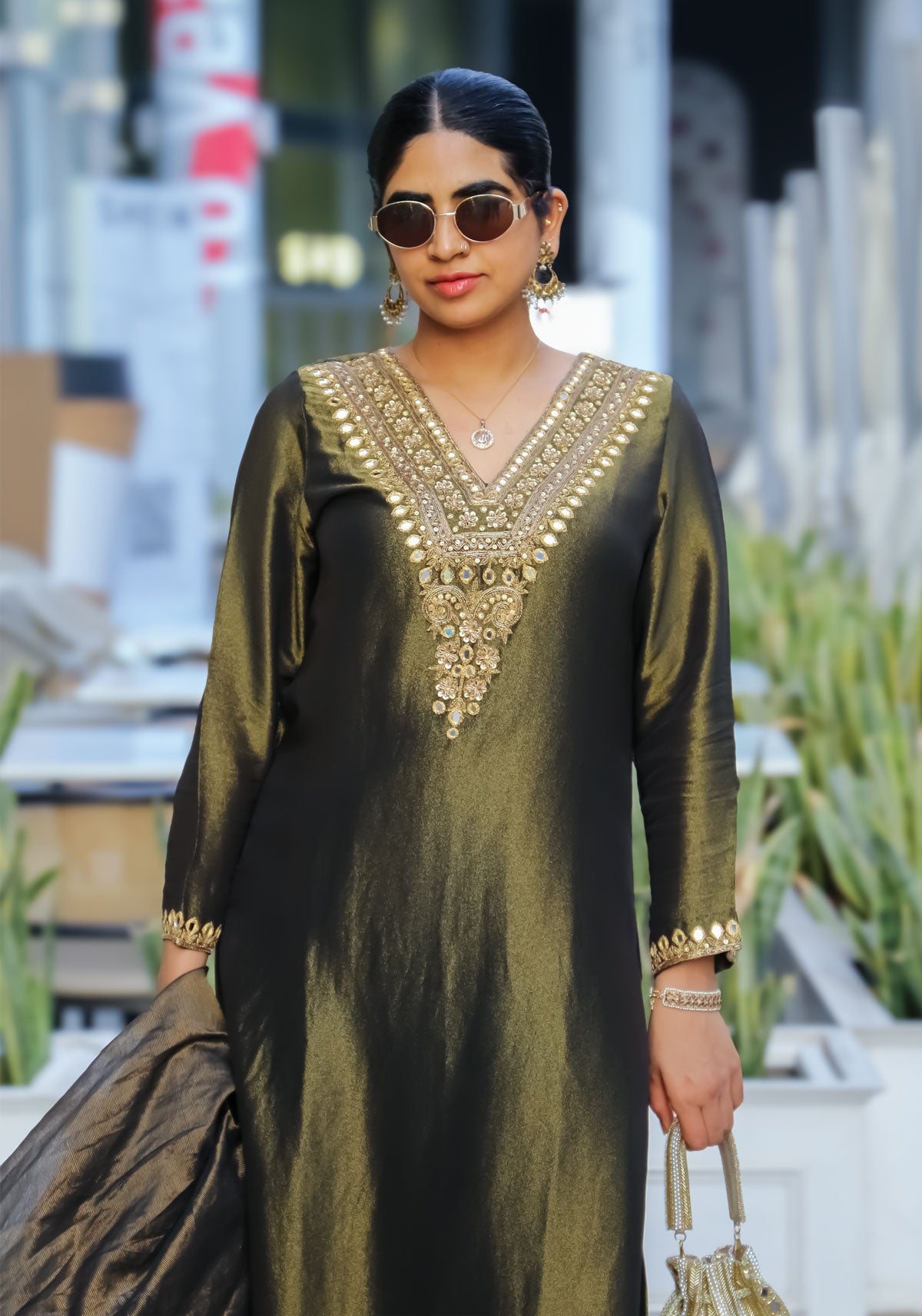 Drenched in sophistication, the Olive Luxe Ensemble captures the essence of understated glamour. Crafted in a rich olive silk fabric with a lustrous sheen, this outfit flows gracefully with every movement. The deep V-neckline and sleeve cuffs are exquisitely hand-embellished with mirror work and golden embroidery, adding a regal sparkle that contrasts beautifully with the dark, fluid base.