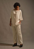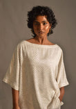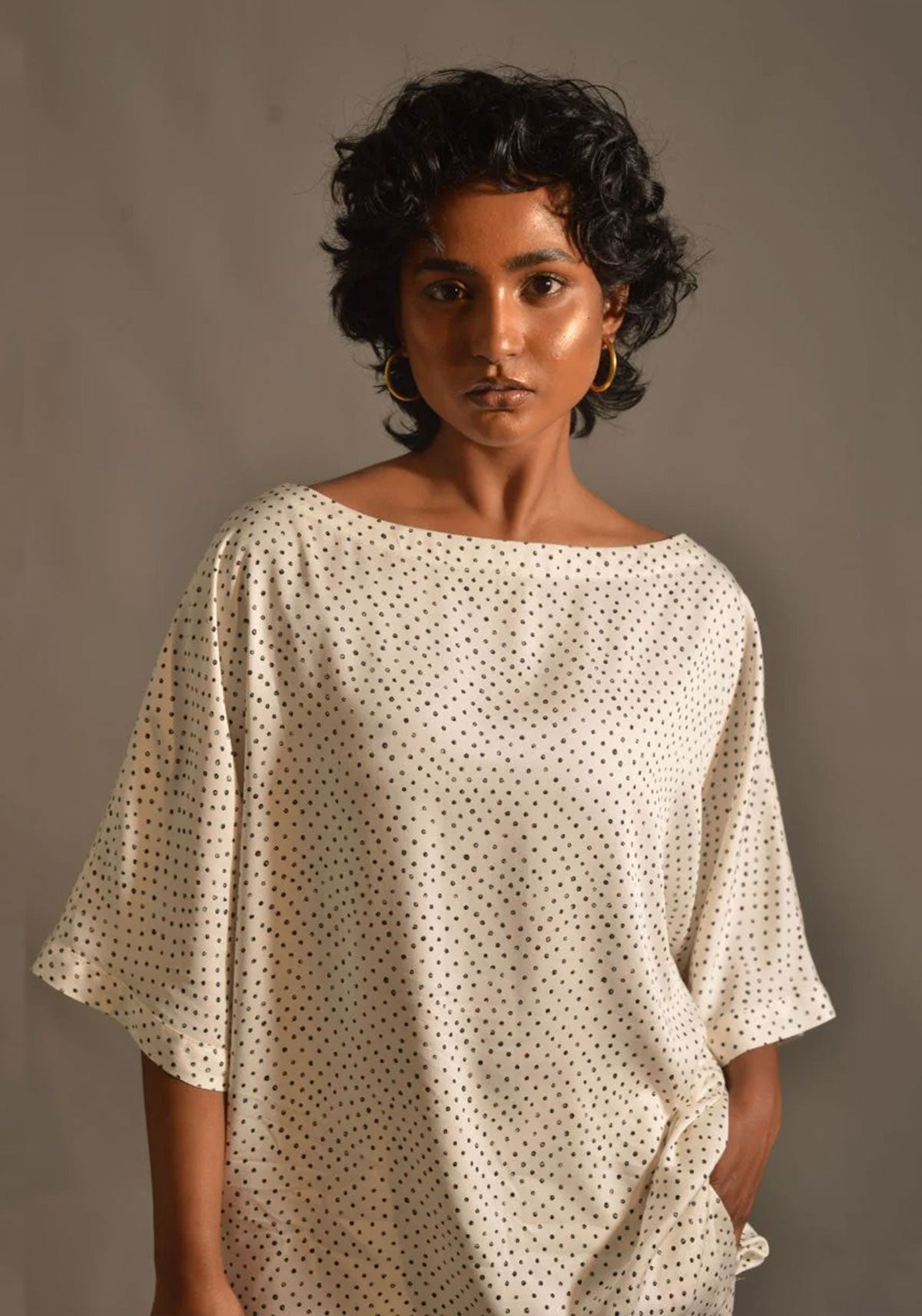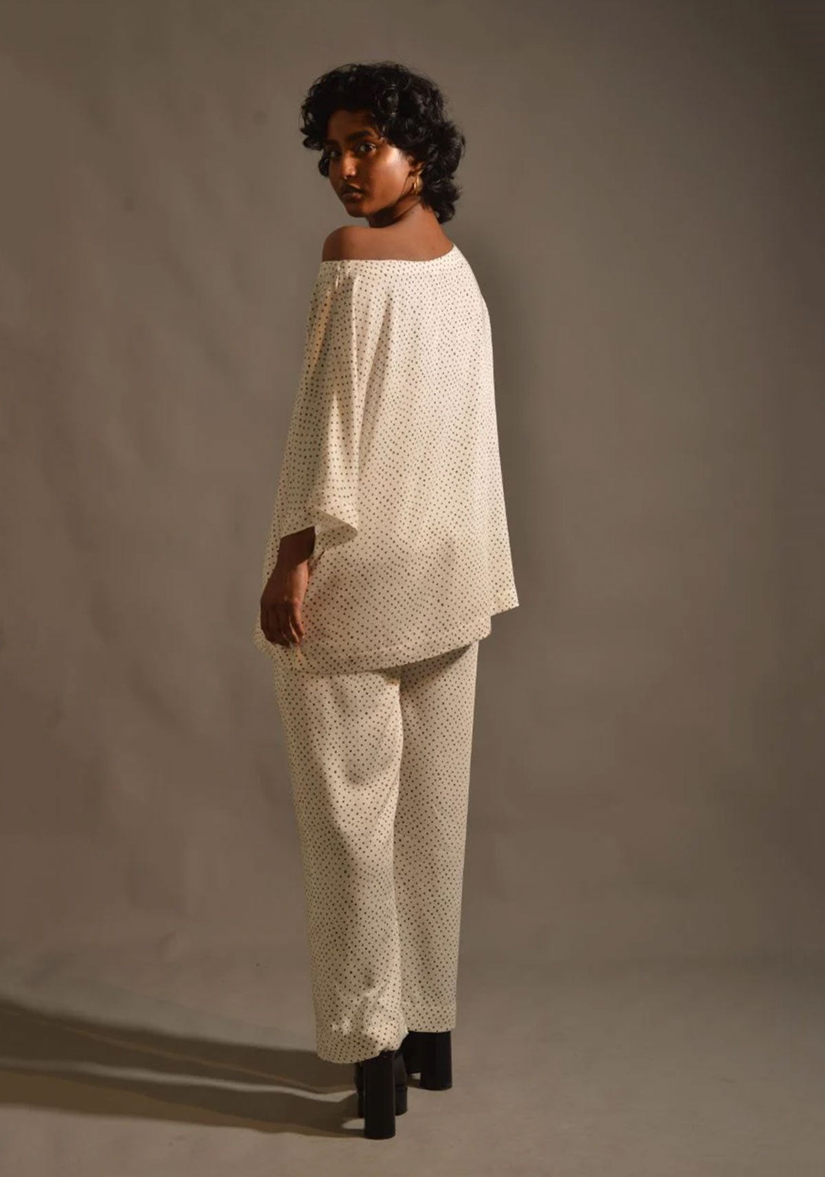 A classic print in a fun silhouette. A loose cut boat neck top with dolman sleeves, paired with straight pants. The pants has pockets!