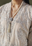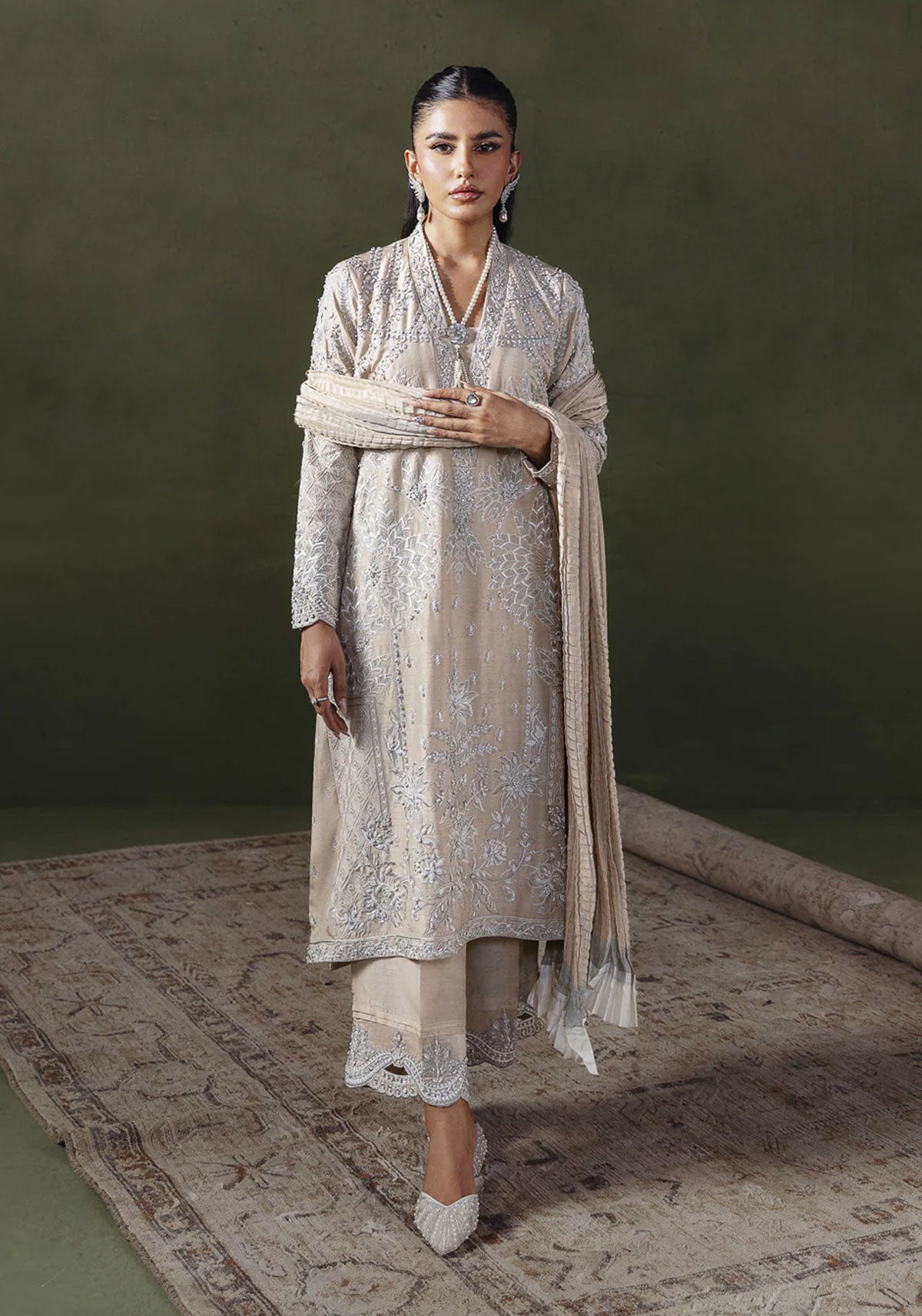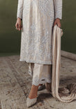 Exuding refined elegance, this ivory 3-piece formal ensemble is crafted to perfection for your most special occasions. The shirt features exquisite hand embellishments, rich in resham intricately detailed with shimmering beadwork and sequins that adorn the neckline, sleeves, and front, creating a luxurious play of texture with every movement. Paired with flared pants, the design is elevated through a delicately embellished border that adds subtle glamour while maintaining a graceful silhouette. A beautifully crushed dupatta completes the set, bringing an ethereal finish with its soft texture and effortless drape.