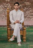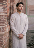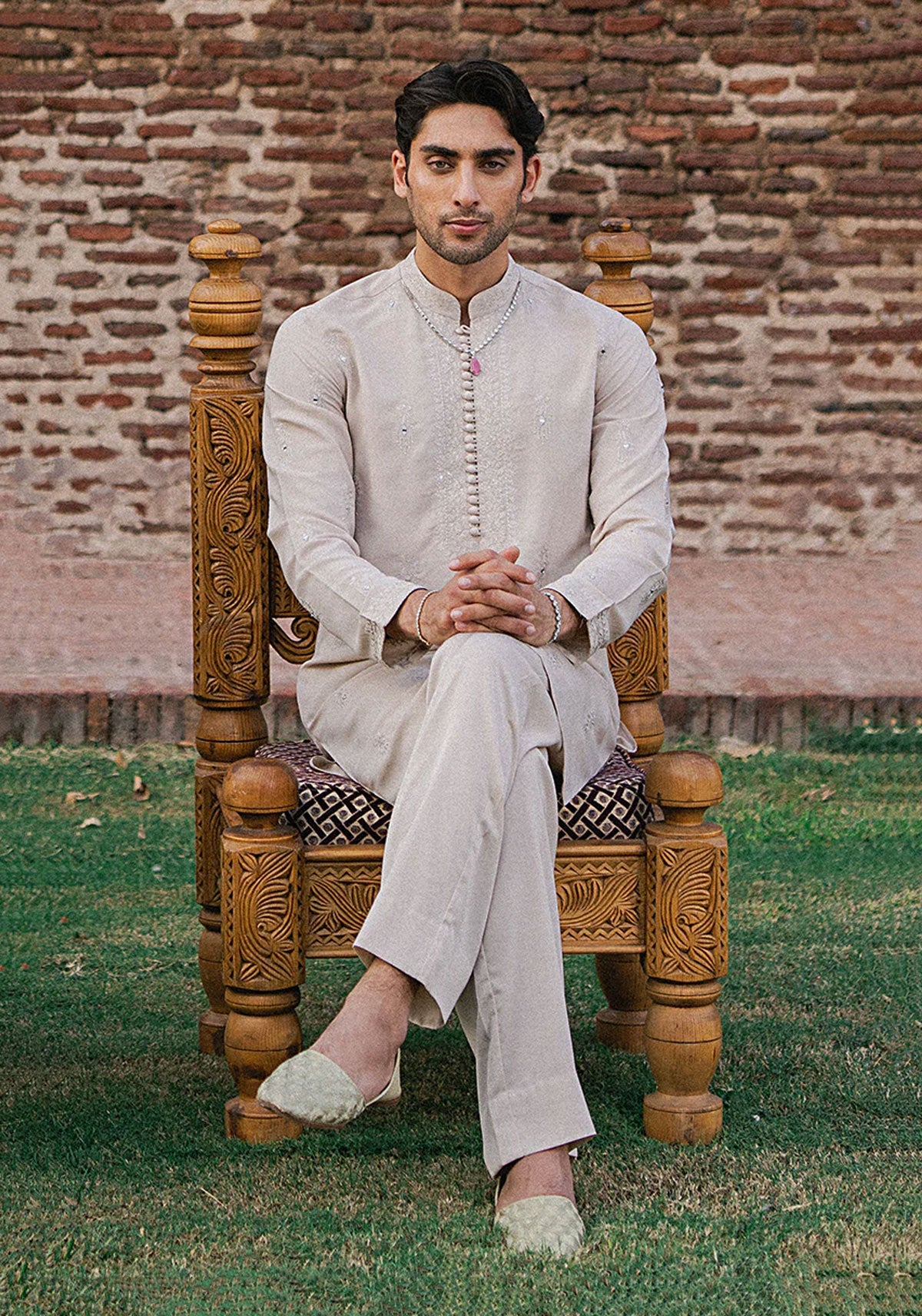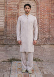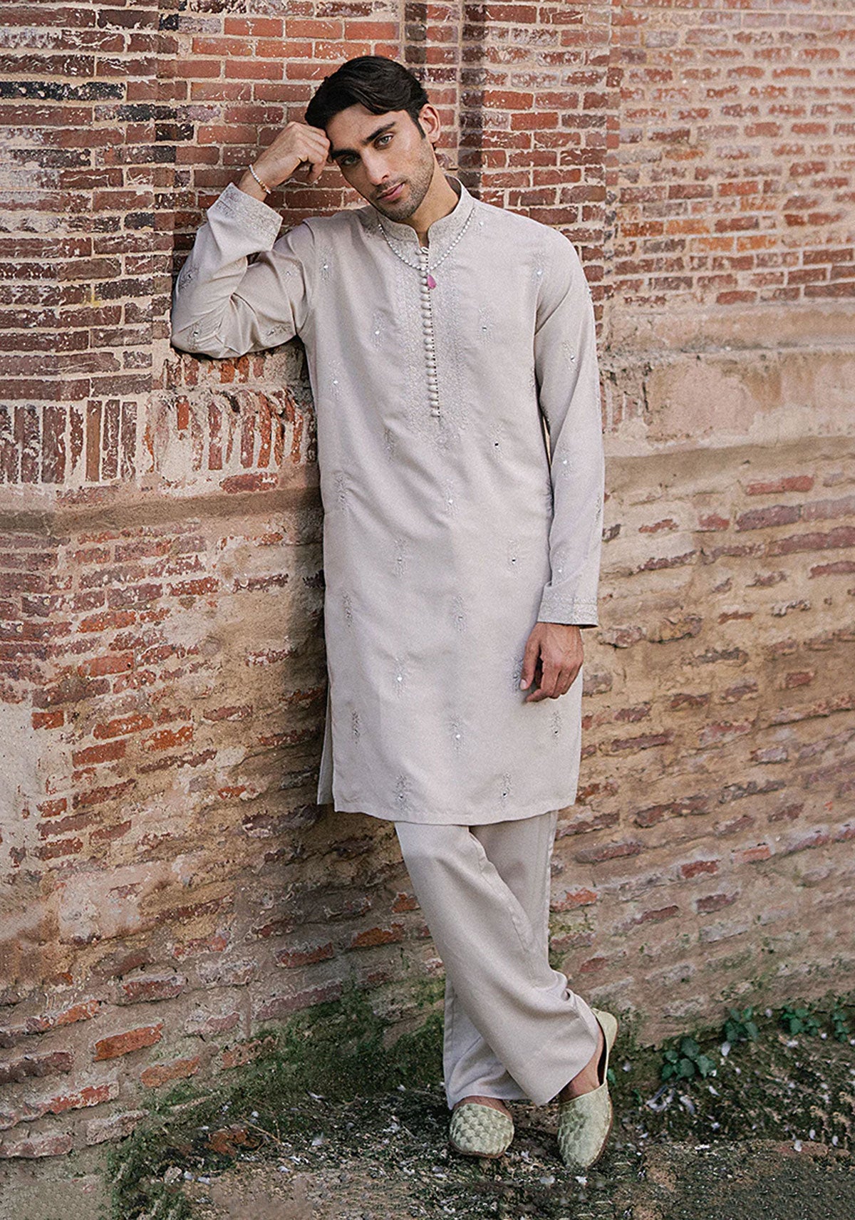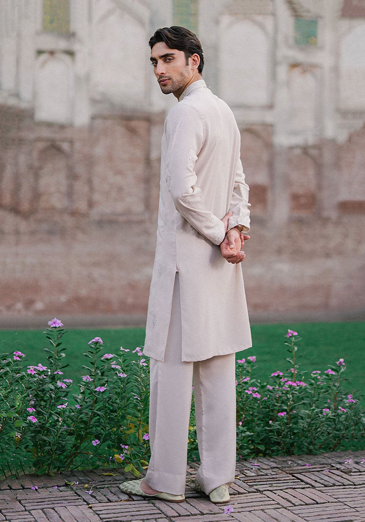 A mauve pink kurta and pajama set detailed with an embroidered neckline with all over booti chatta and loop button closures with composed embroidered band collar adorned with tilla and mirror work.