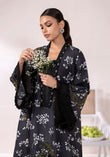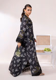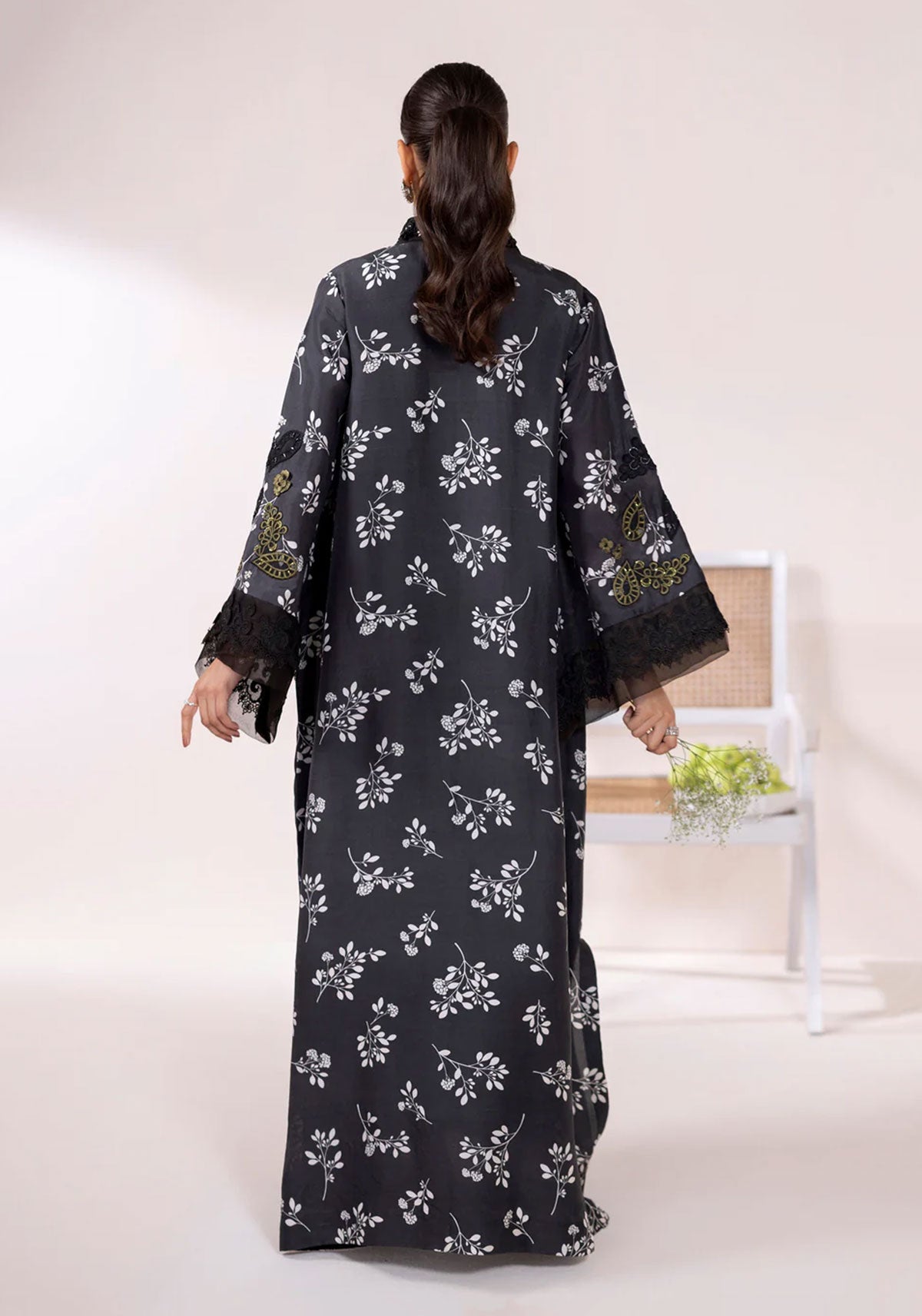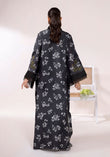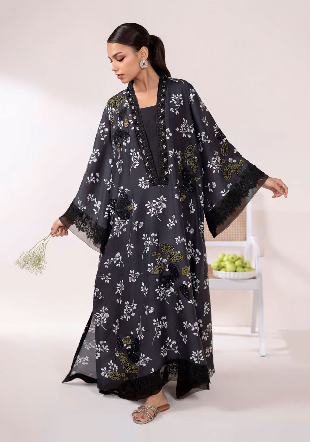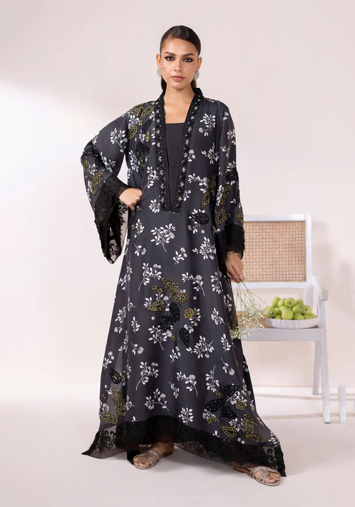 Jehan, in a delicate shade of beige, features deep-toned floral prints on luxurious 60-gram pure silk, creating a soft yet striking visual contrast. The neckline is richly adorned with floral motifs, heavily embellished with pearls, shimmering stones, and beaded threads that add a refined sparkle.