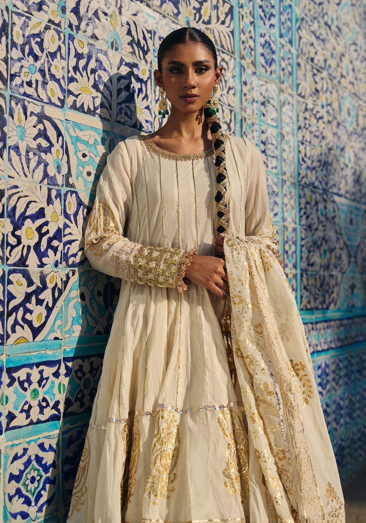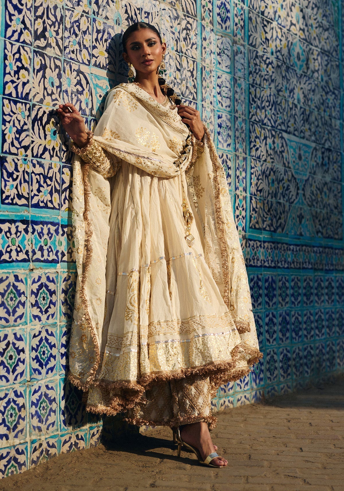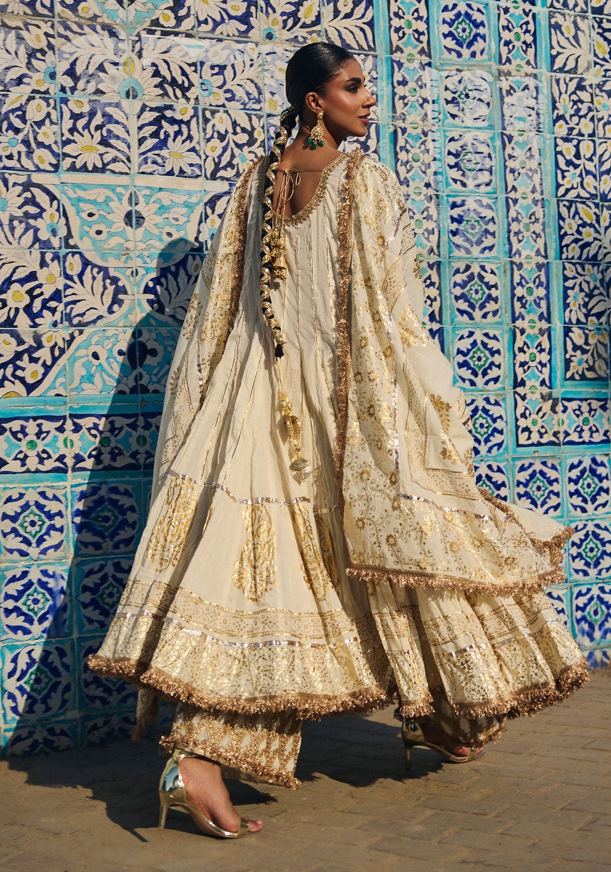Jugni is a beautifully crafted three-piece ensemble made from pure hand-woven muslin, giving the outfit a naturally rich and graceful presence. Its signature 64-kalidaar cut creates an elegant, sweeping flare with every step, adding timeless charm and sophistication. The design features a stunning combination of foil printing and traditional gold block printing, creating a radiant, regal finish across the panels. Heavy gota work enhances its festive appeal, adding classic richness and depth without overwhelming the look. Refined, luxurious, and perfect for celebratory moments, Jugni is an exceptional choice for nikah ceremonies, weddings, and any occasion where tradition and elegance come together beautifully.