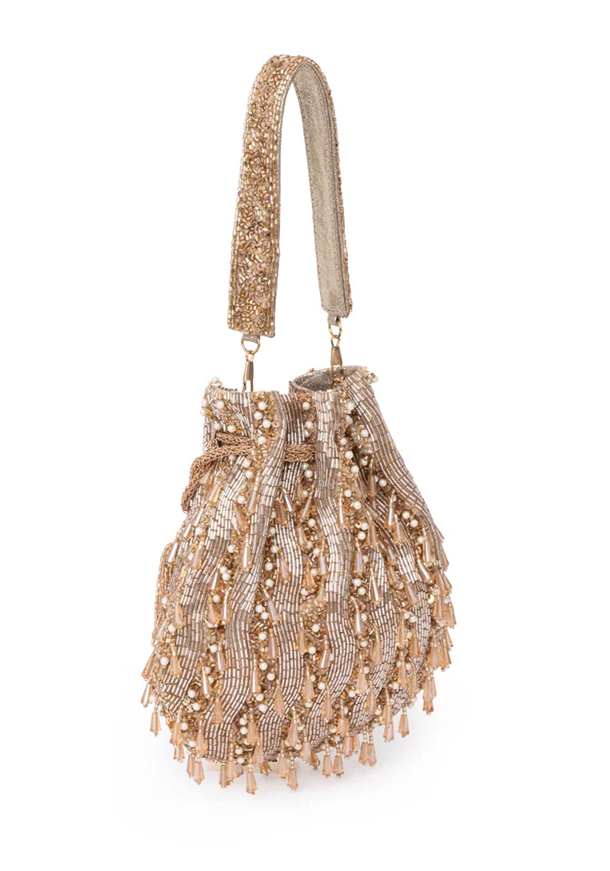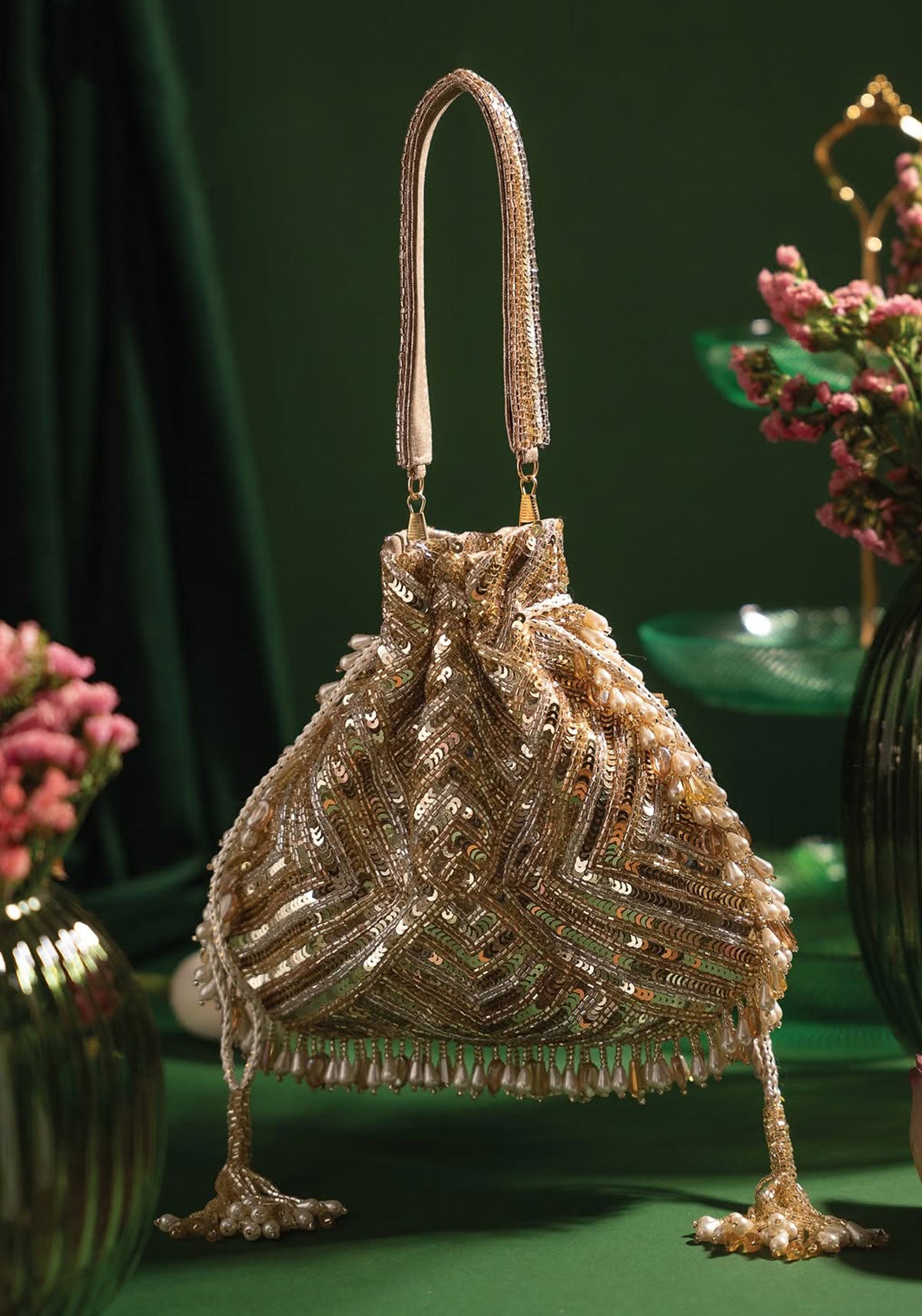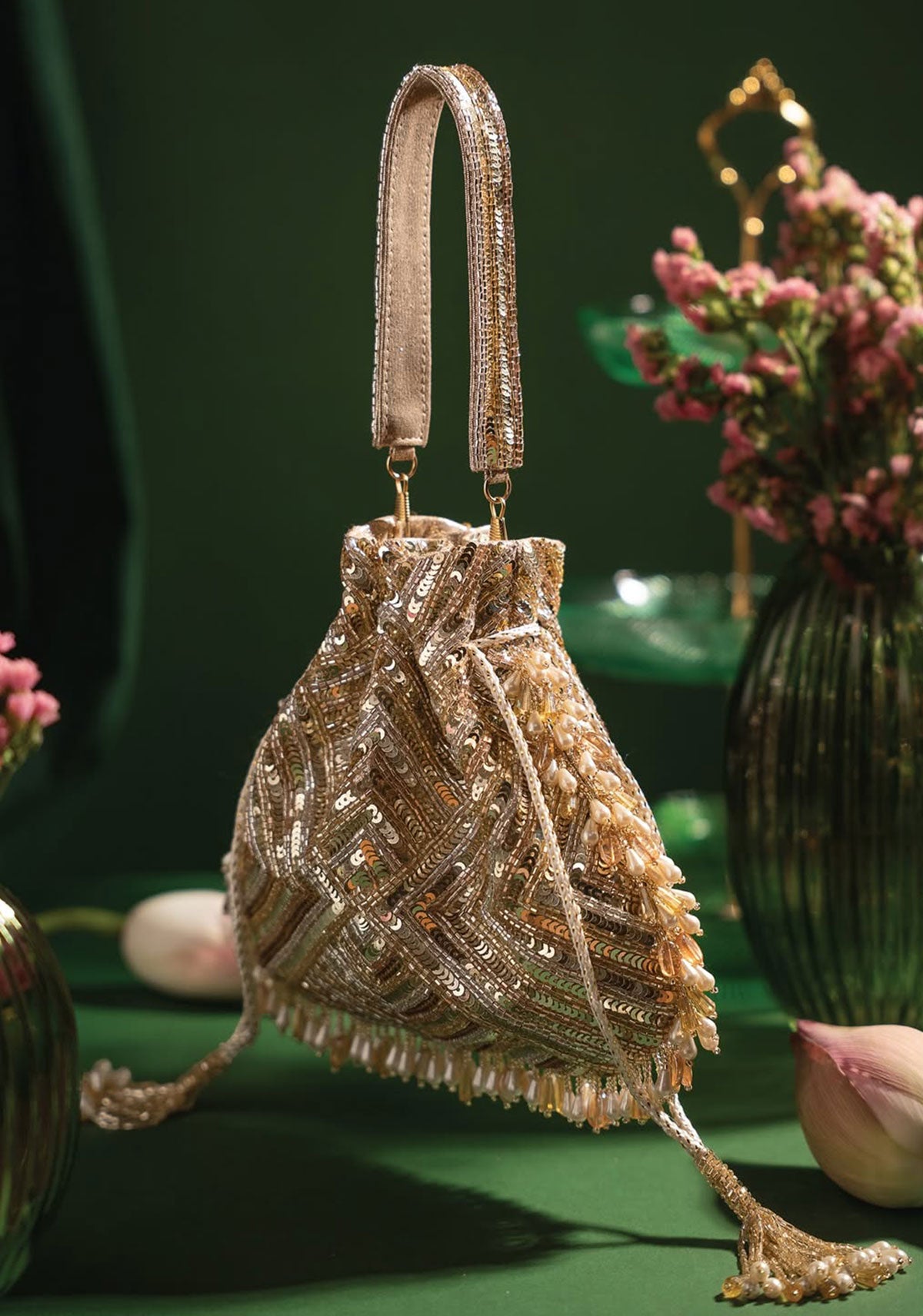 A captivating and elegant accessory that effortlessly combines the charm of traditional potlis with modern aesthetics. This exquisite potli is adorned