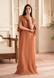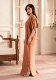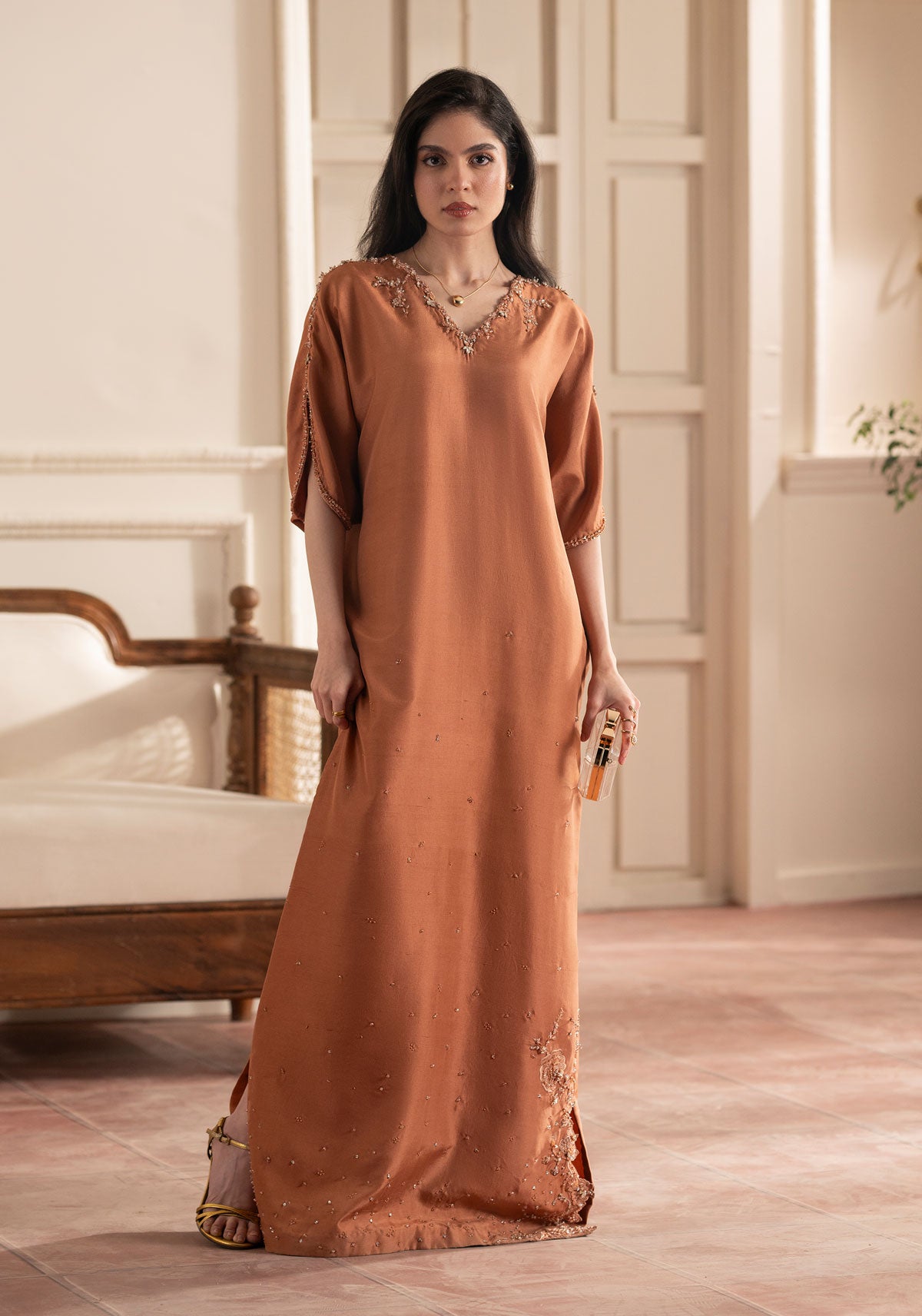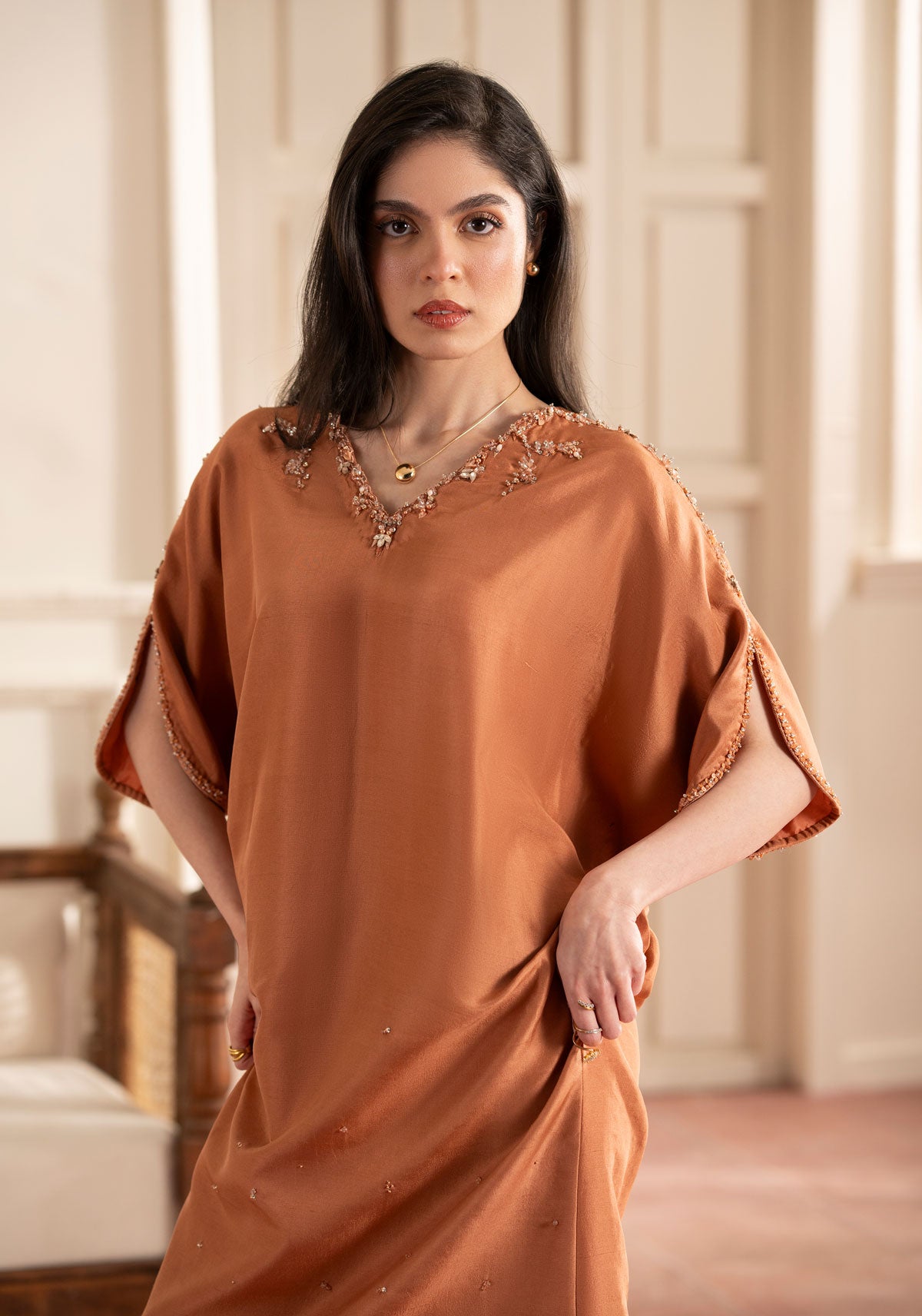 A sleek raw silk kaftan with cigarette pants in smoked salmon color radiating
