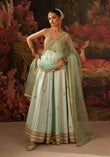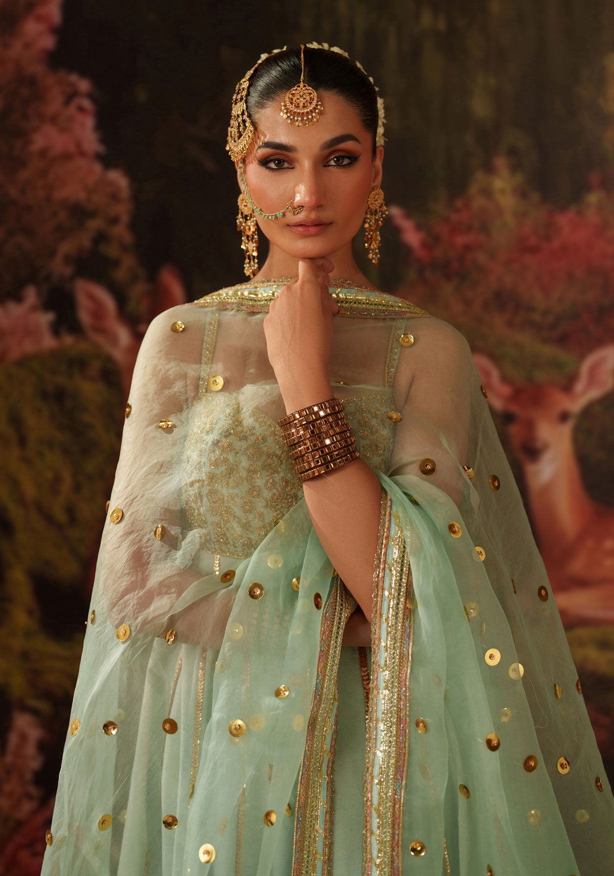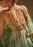 Introducing our exquisite ensemble, featuring a pure khaddi silk kaalidar with intricate mirror work detailing's with gota, dabka, nakshi, and Gota trimmings on the panels with a volume skirt insert to give it that extra wow factor, the kaalidar is adorned with gold nakshi, gota, sequins, dabka, and tiki stones, and mirrors creating a mesmerizing and luxurious design that catches the light and adds a touch of sparkle. This outfit has a statement low-cut back with hand-worked tassel detailing's. Paired with an organza dupatta with mirror work detailing. Wear this ensemble to a wedding, special occasion, or any event where you want to make a statement. The intricate embellishments and delicate fabrics make this ensemble a true work of art.