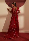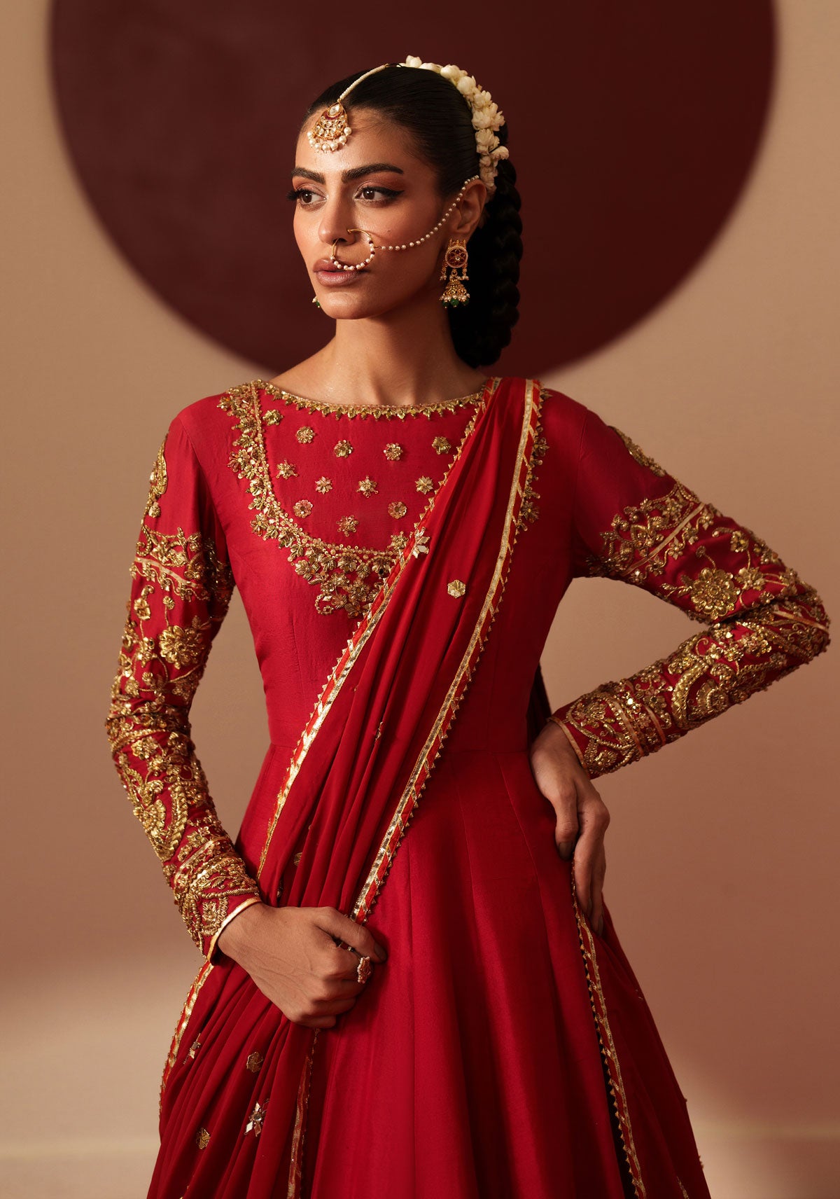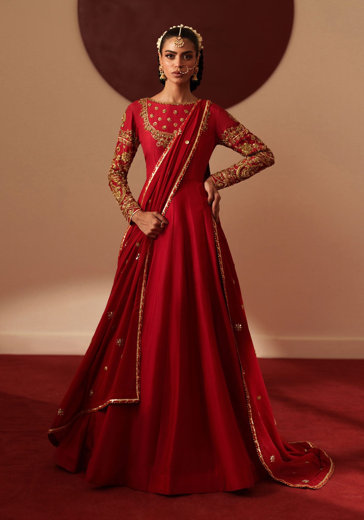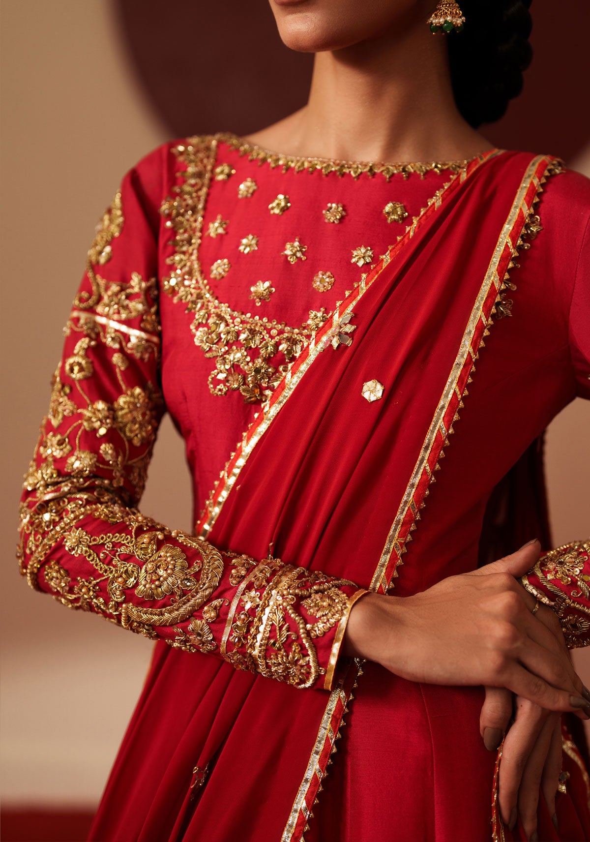 A true classic outfit and one of our favorites of the season! A stunning crimson shade. The bodice is intricately hand embellished with kora, dabka, sitara showcasing exquisite craftsmanship. The statement sleeves are heavily embellished with handwork, paired with a mirror work chan duppatta with lace trimmings draped like a sari. The Peshwas enhances the richness of the ensemble with its intricate craftsmanship. The model is wearing 58 Inches and a Small.