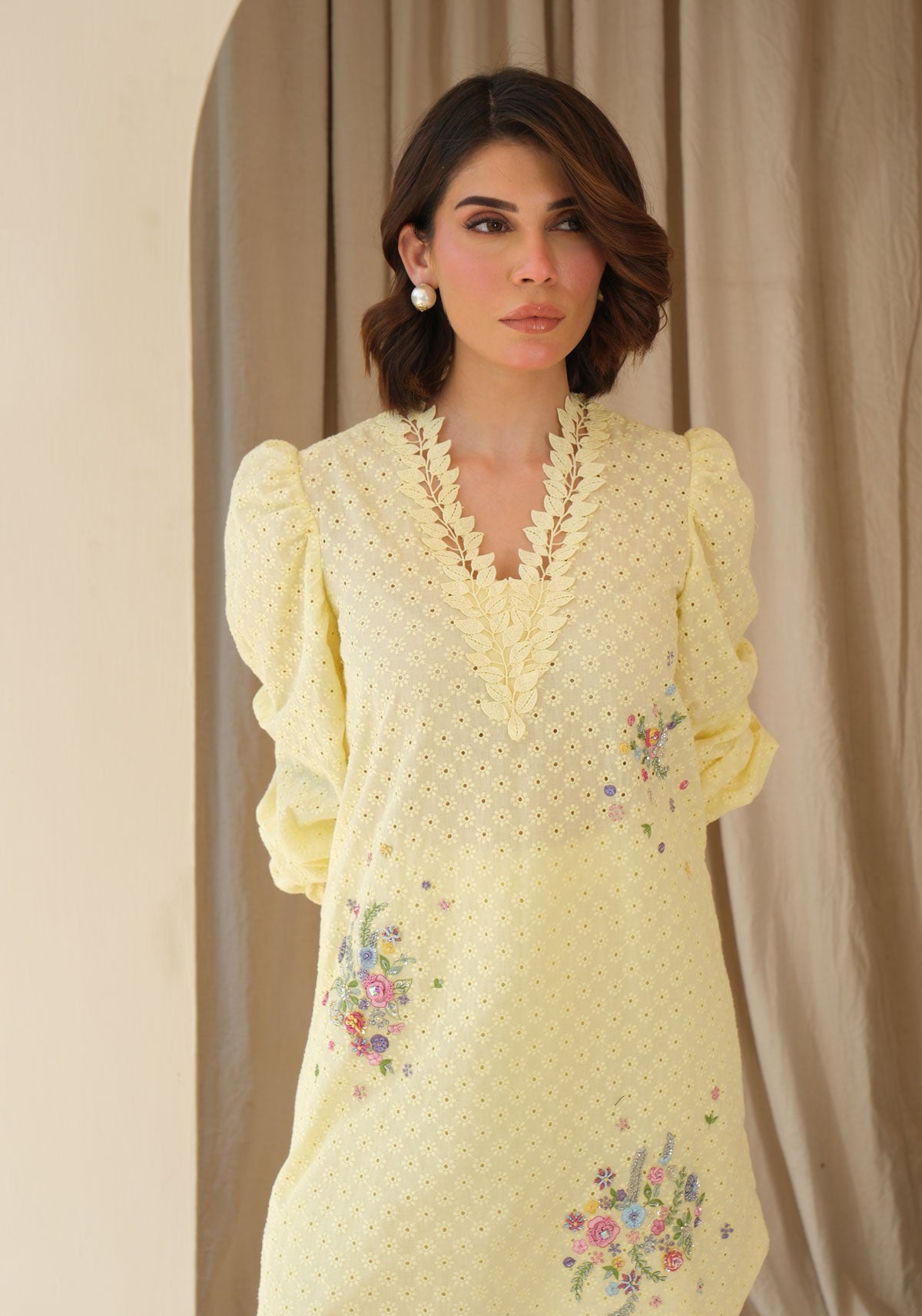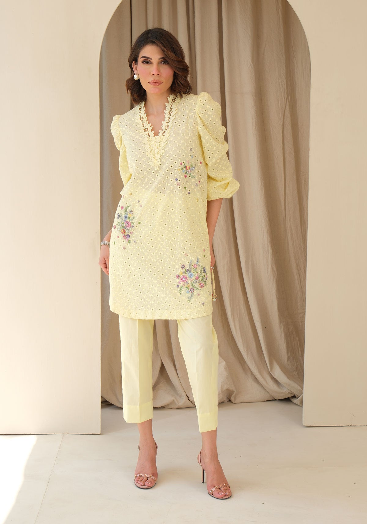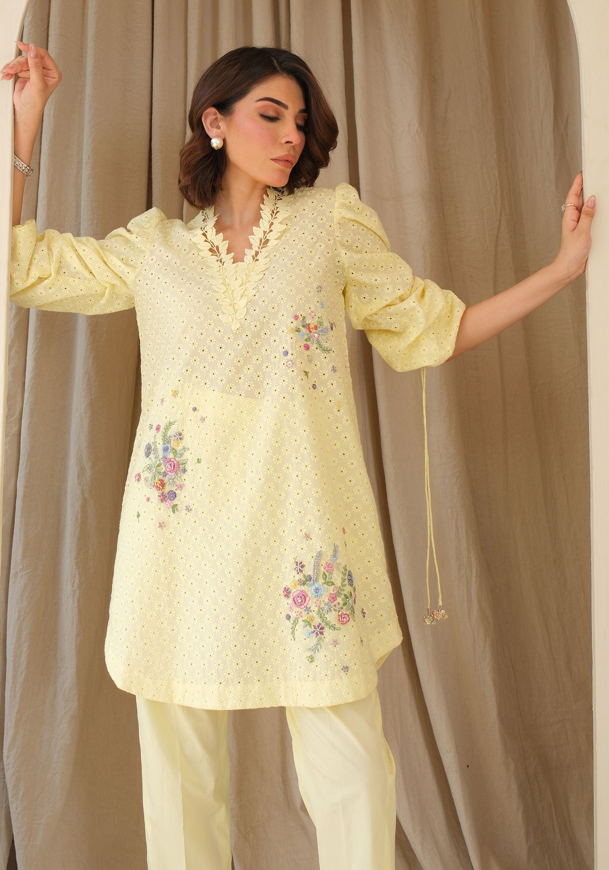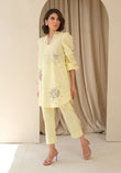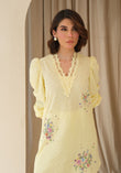 Our signature French knot florals with a hint of sparkle bring this sunshine lemon to life. The crisp cotton eyelet shirt comes with statement sleeves enhanced with tassels. Comes with cotton pants.