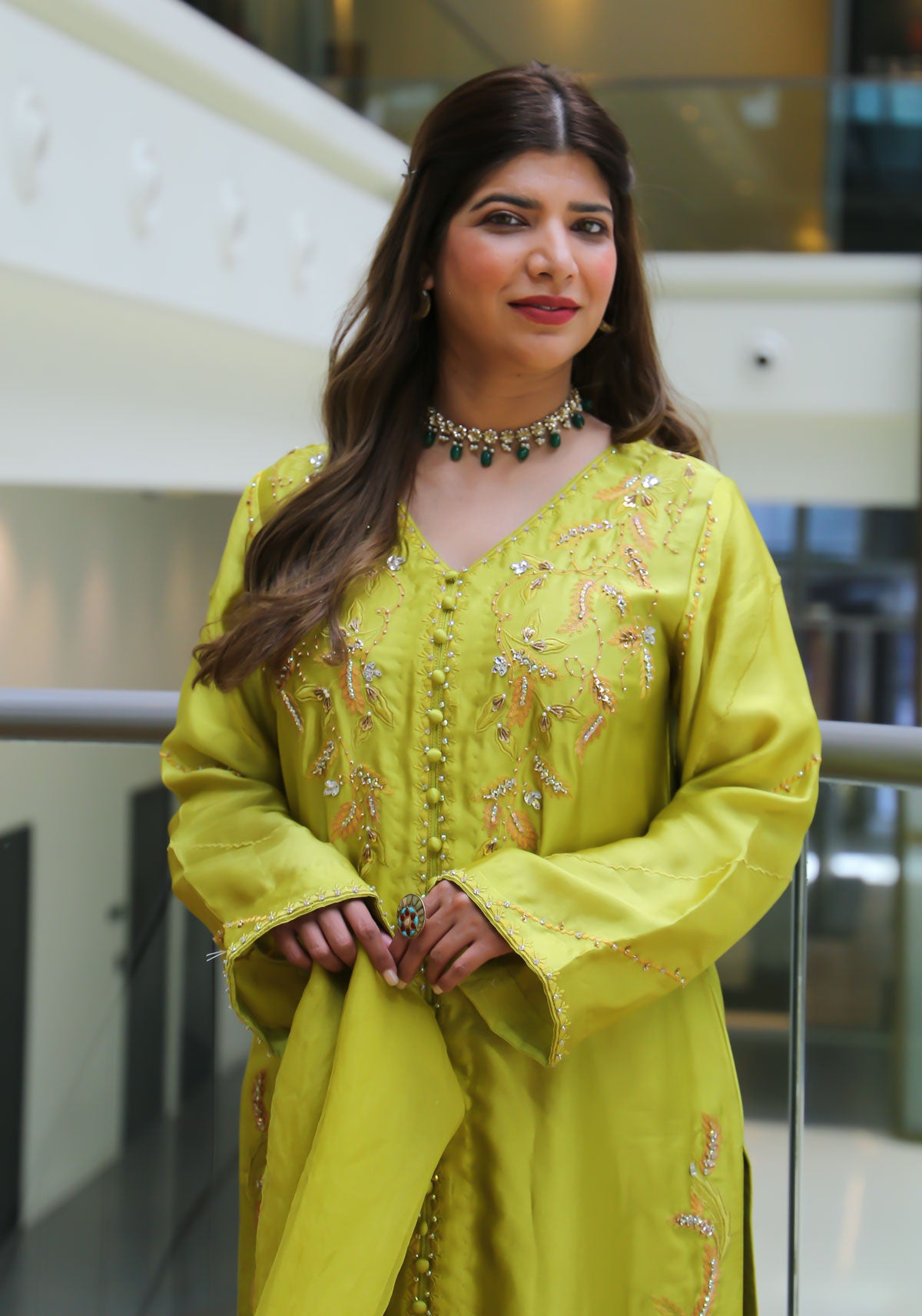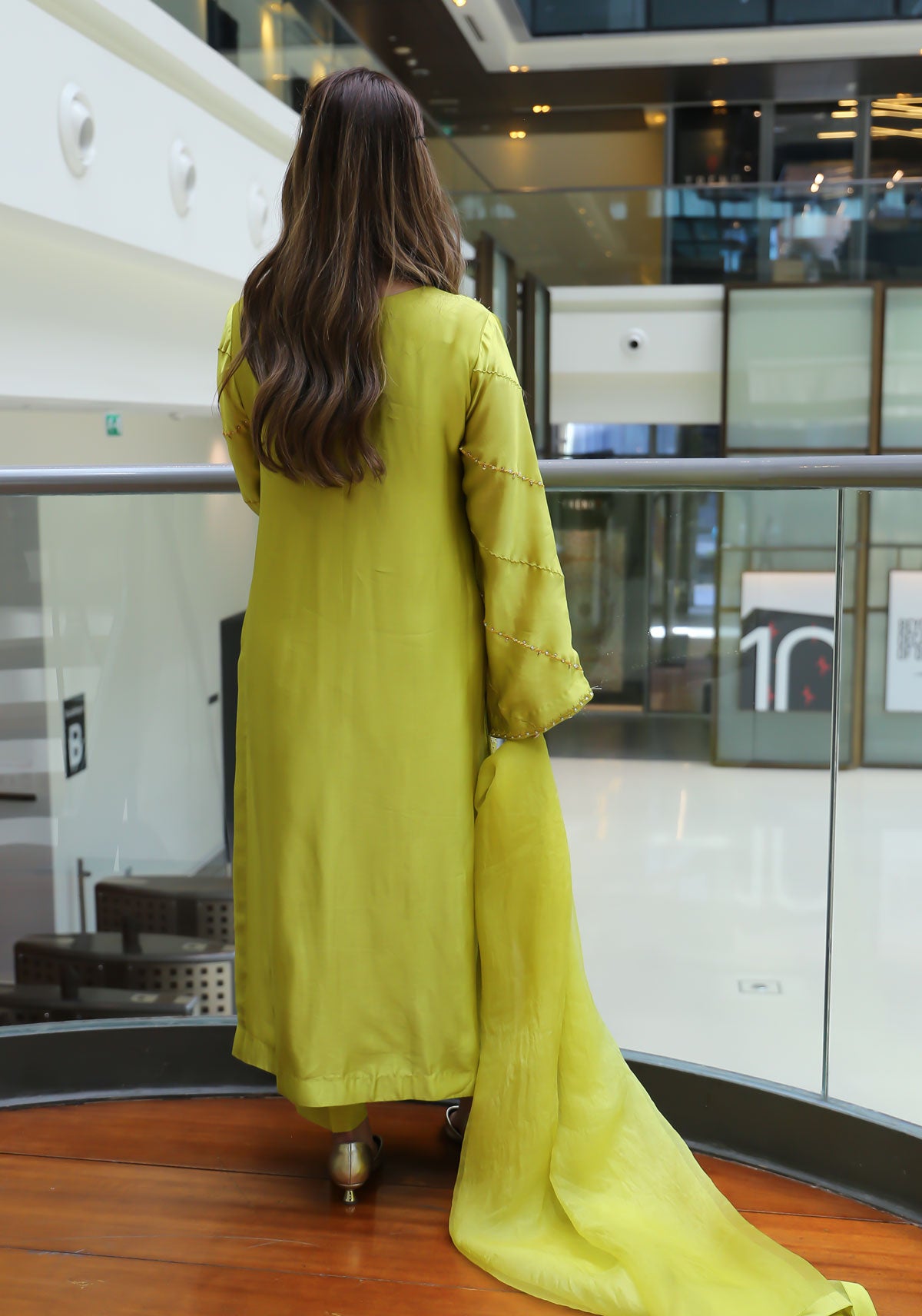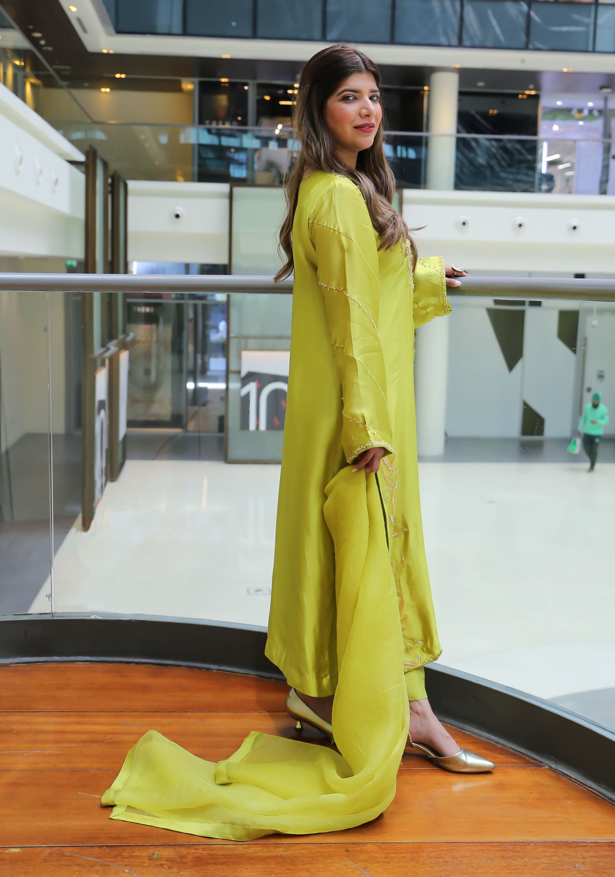Lime captures the spirit of effortless elegance with its refreshing hue and graceful silhouette. Crafted from lightweight silk, this long flowy kurta in vibrant lime yellow exudes youthful charm and refined sophistication.