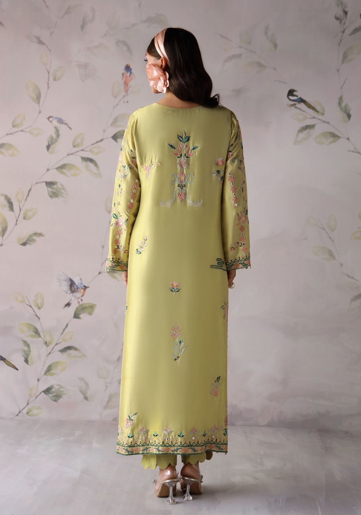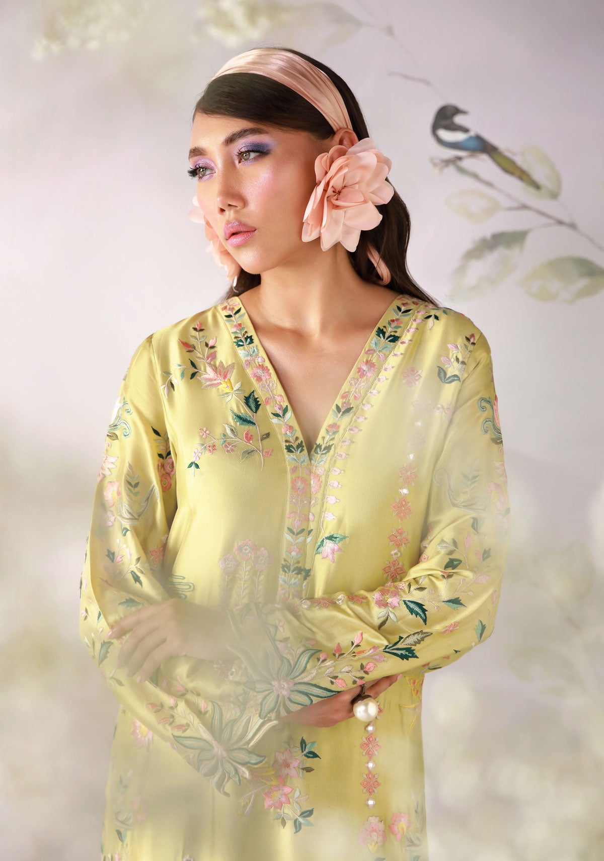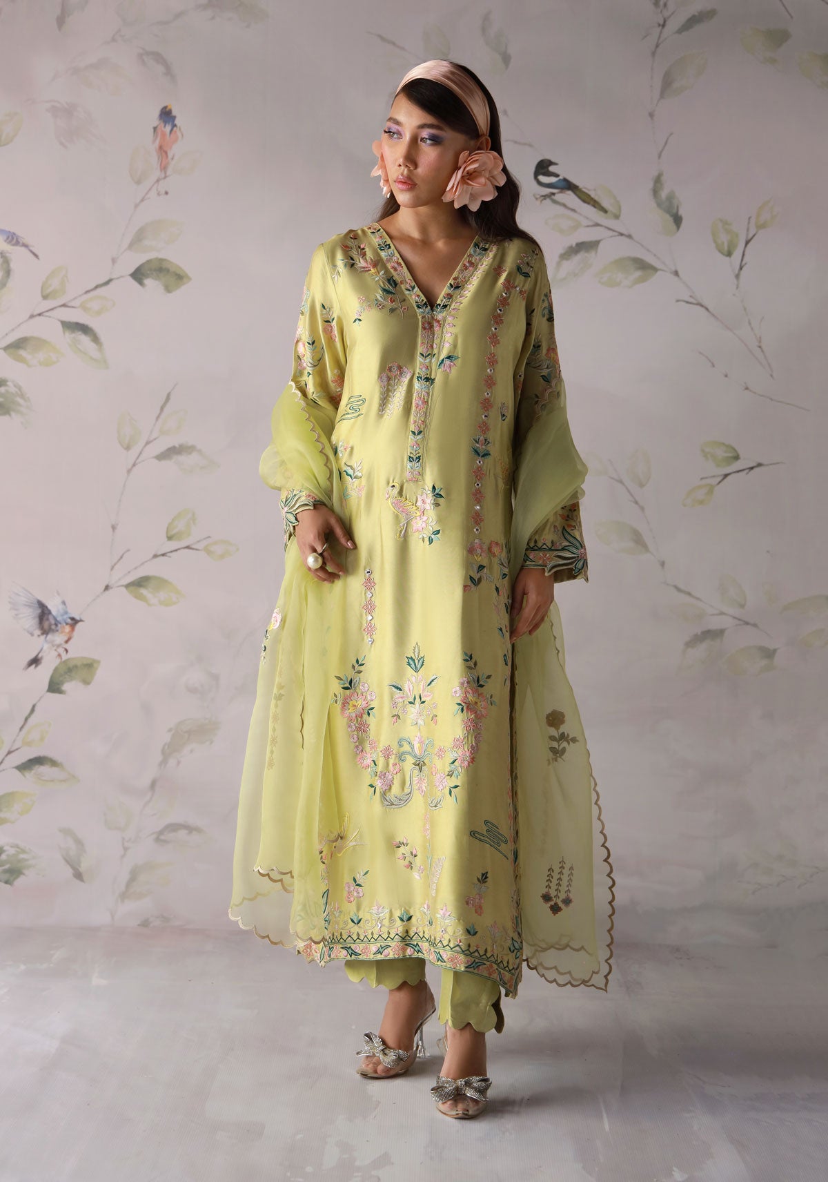 Step into effortless elegance with this soft lime green long shirt, crafted in pure butter silk and adorned with delicate floral embroidery. It’s paired with matching butter silk pants featuring intricate cutwork detailing for a refined finish. The pure organza dupatta can be added separately to elevate the ensemble with a touch of sheer sophistication.
