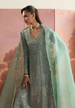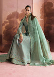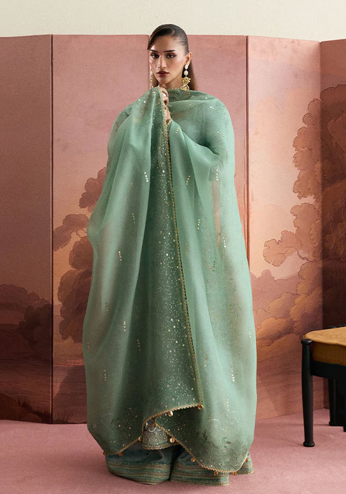 - Sage green organza with four-sided minimal leaf embroidery, sequin details, and a lace border.