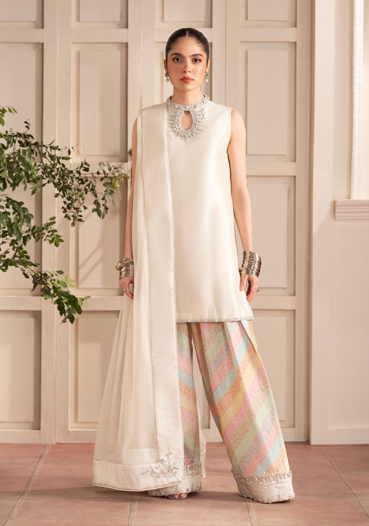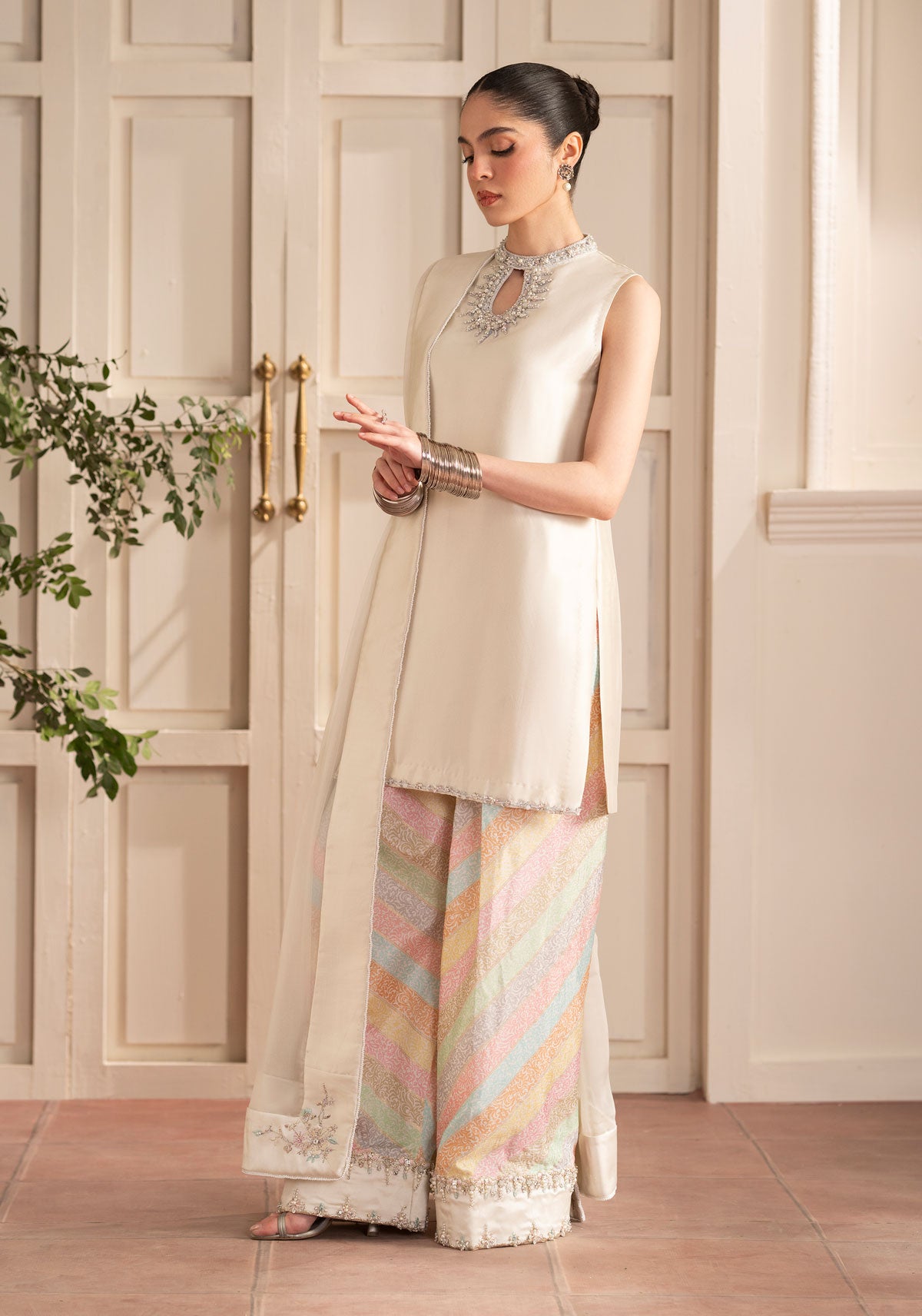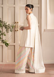 a gracefully flared farshi multi colored shalwar that exudes a modern allure. The borders of