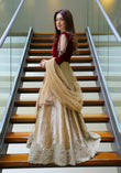 Exude timeless grace with this regal maroon and champagne gold Anarkali ensemble. The fitted velvet bodice, richly embroidered with intricate silver and gold detailing, perfectly complements the voluminous champagne gold skirt adorned with delicate pearl and sequin embellishments along the hemline. Flowing sheer sleeves and an embellished dupatta add a touch of sophistication, making this outfit ideal for festive occasions and formal celebrations.