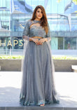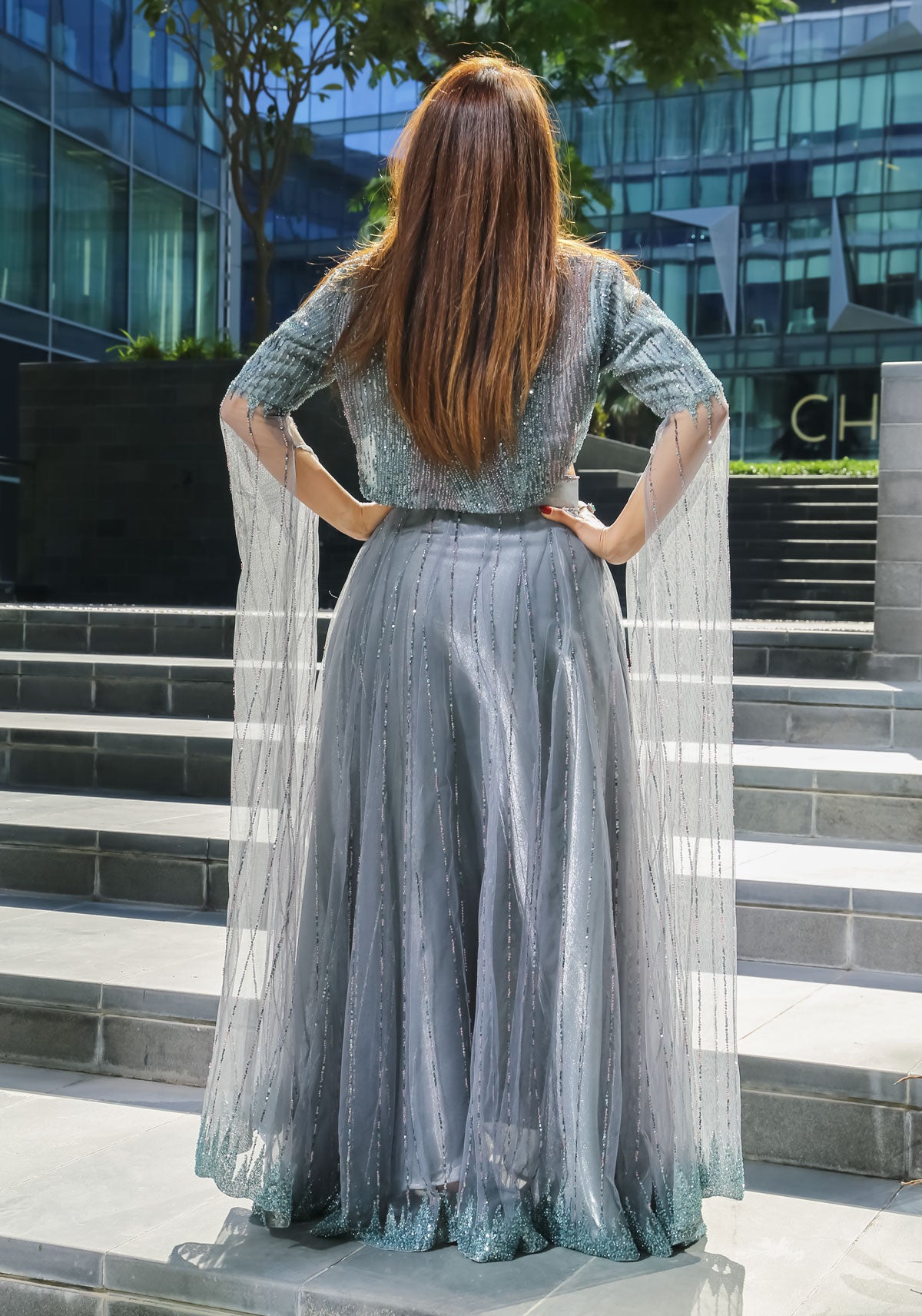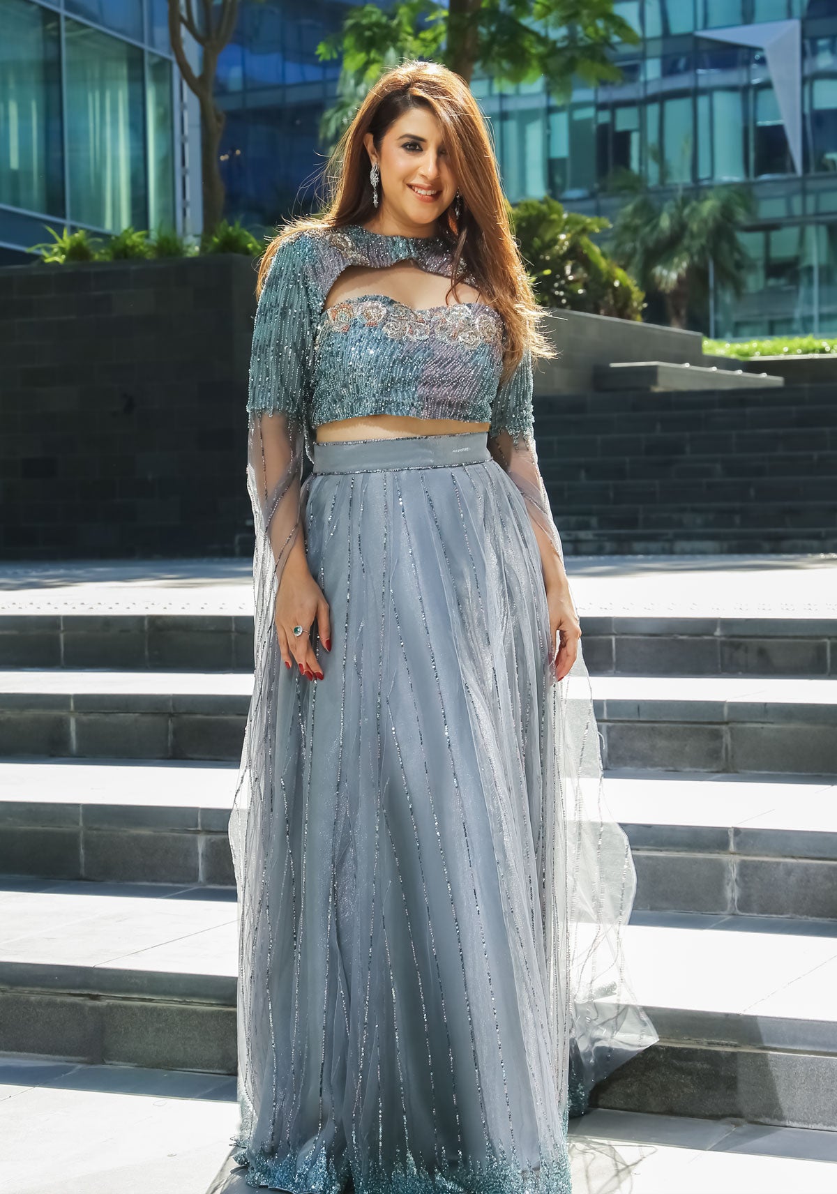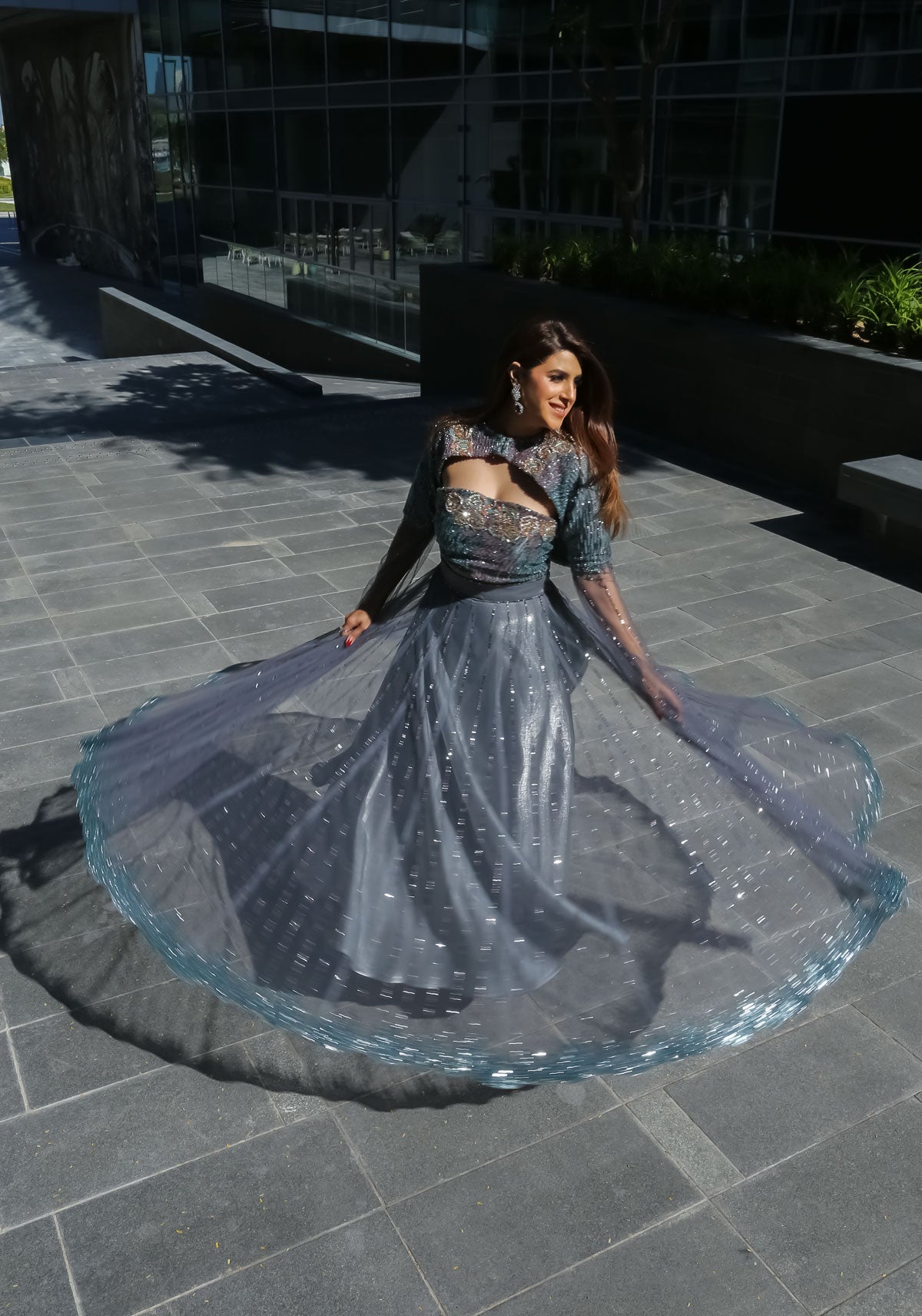 A contemporary take on classic evening wear, this silver grey lehenga set is crafted for understated glamour. The ensemble features a delicately embellished crop blouse with a modern cut-out neckline, paired with a flowing net lehenga skirt adorned with subtle shimmer detailing. Finished with a sheer matching dupatta, this set moves beautifully with every step.