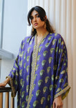Step into effortless sophistication with this royal purple kaftan adorned with intricate paisley embroidery. The rich hue is complemented by detailed gold thread work and subtle accents along the neckline, sleeves, and hemline. Its relaxed silhouette drapes beautifully, offering both comfort and refinement — perfect for evening gatherings or festive celebrations.